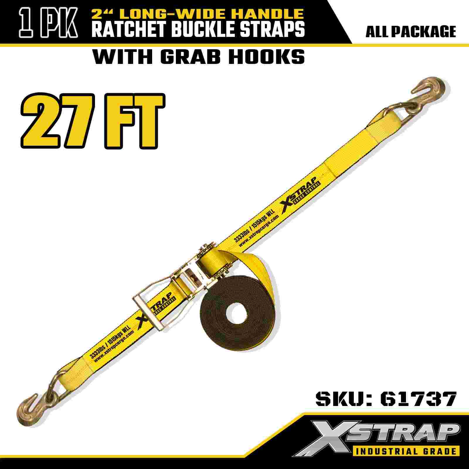 Xstrap 61737 Gravis Officium 2" x 27' 1PK Ratchet Stramentum cum Capto Hooks Flavus, WLL 3,333 pondo, manubrium longum prolixum Ratchet deprime pro machina & Equipmentum