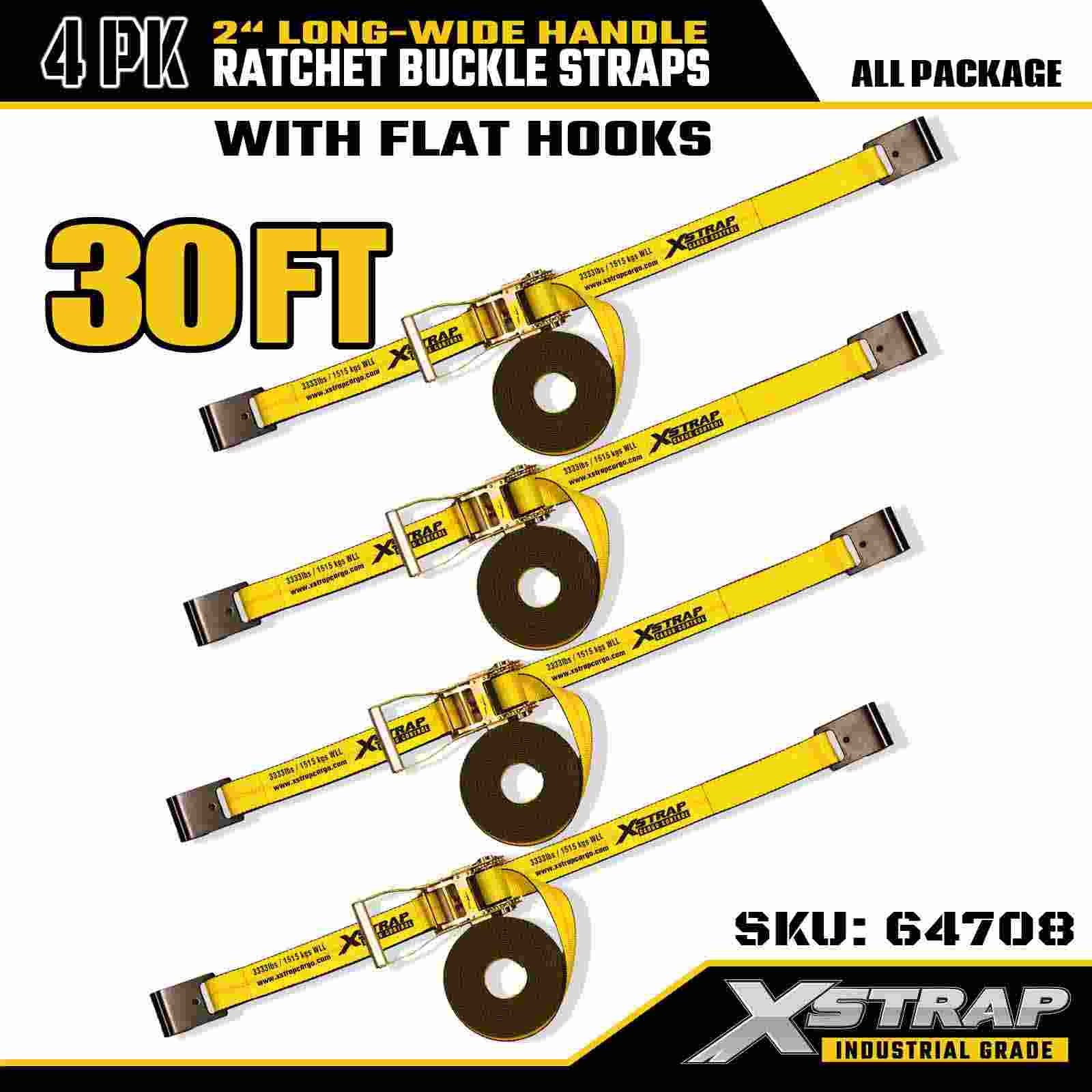 Xstrap 64708 2" x 30ft Tractum extensum Ratchet Fibula Straps (4-Pack) - Flat Hooks, 10,000 libras Rated Fortitudo, Industrialis Cargo Imperium Solutio