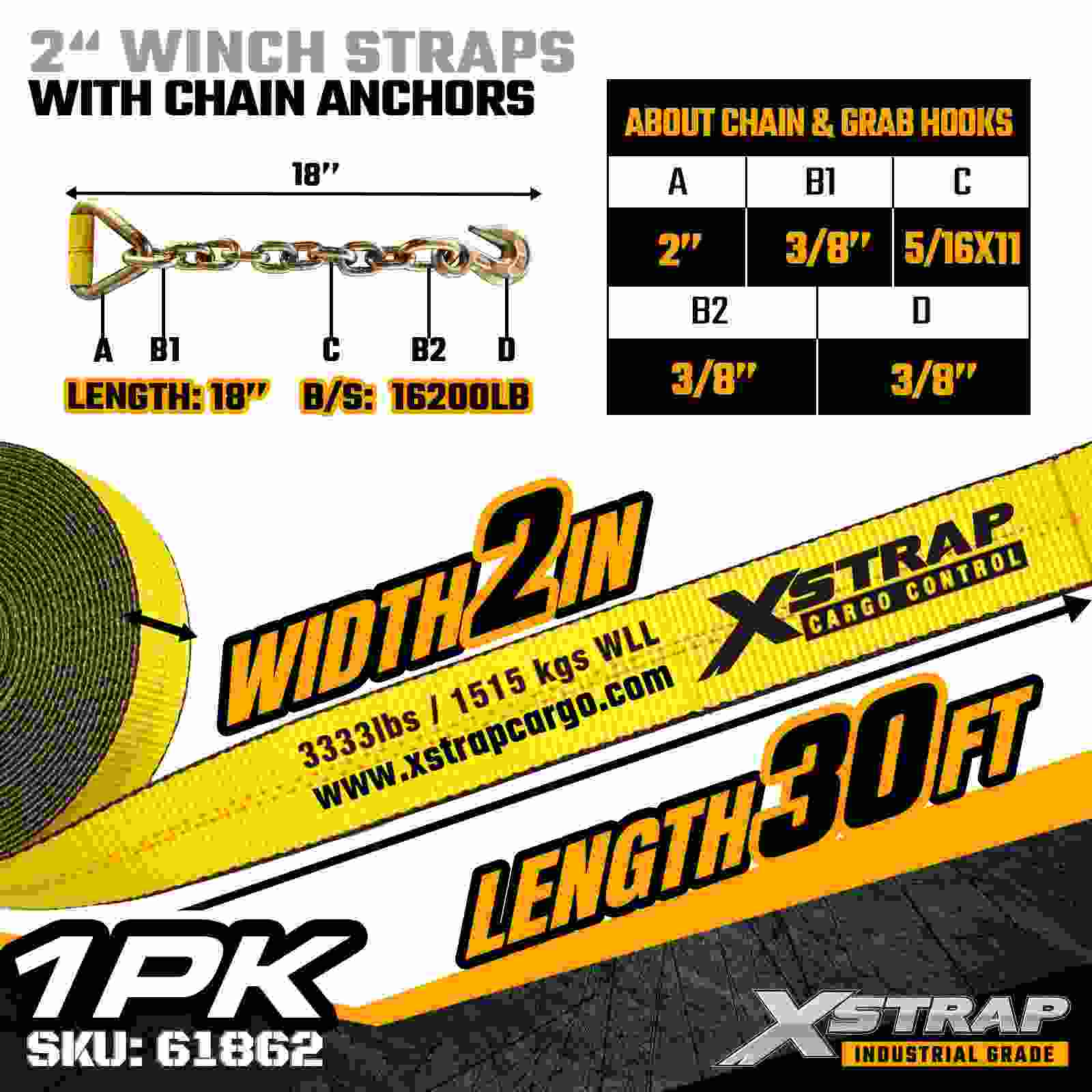 Xstrap 61862 2" 30ft Standard Winch Strap aedificatur pro certo mercium flatbili praesidio, featuring durabile vinculum ancorarum et firmitas polyester sponda. Cum 3,333 pondo Laboris Lond Limit et 10,000 pondo Contere Strength, certa opera pro vecturis, grabatis oneribus et applicationibus generalibus, lumbis, tibiis, saxulis, onerat firmum praebet.