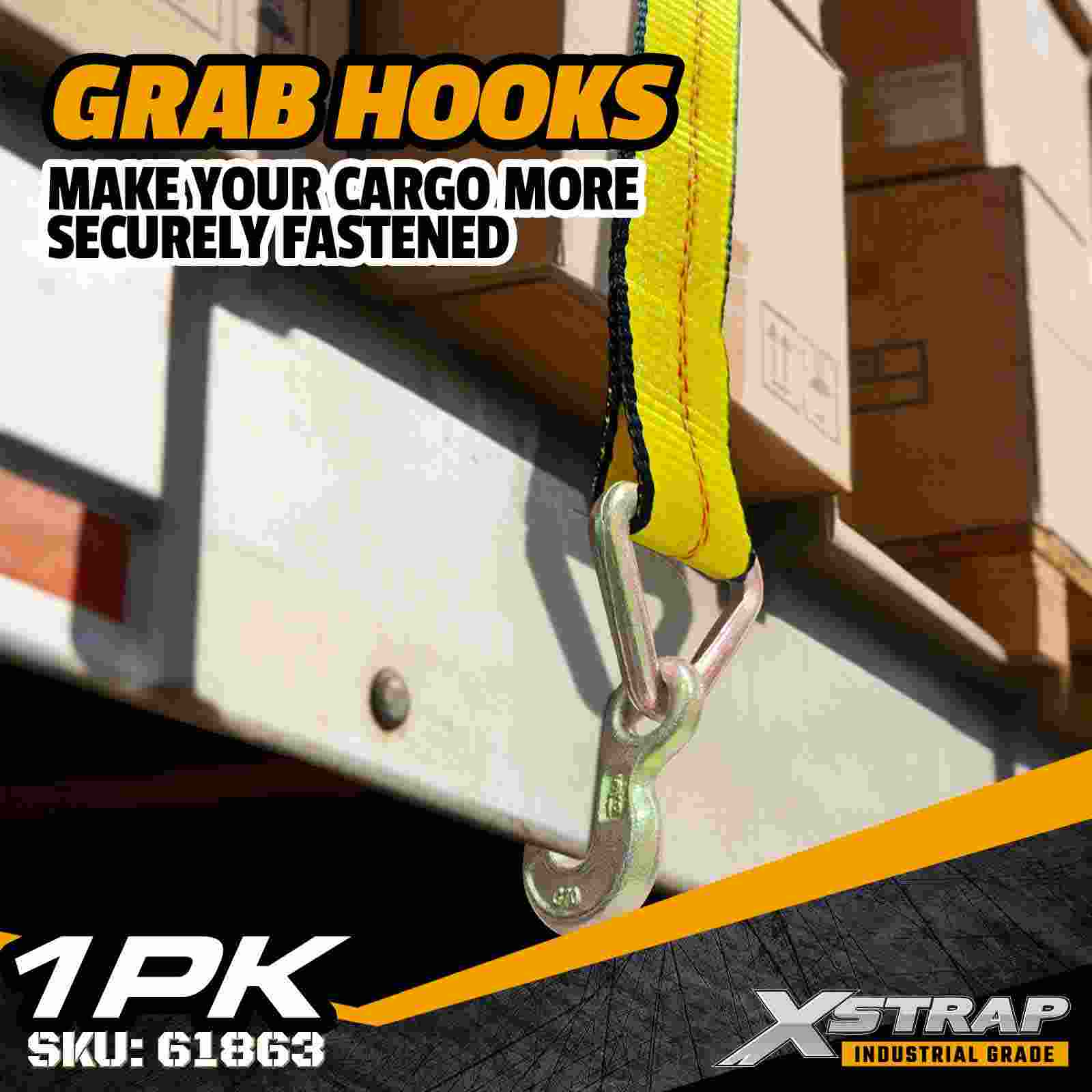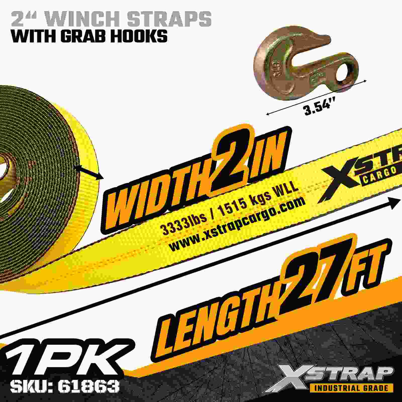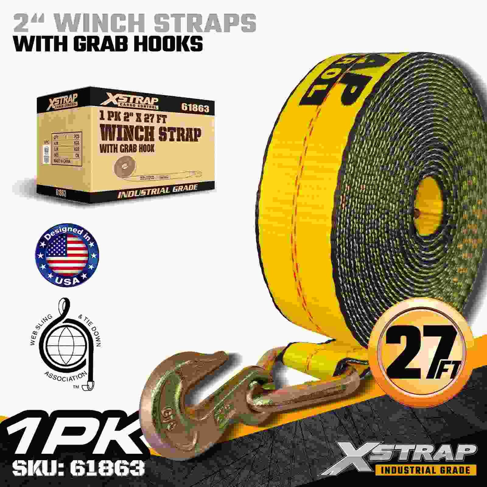 Xstrap 61863 2" 27ft Vexillum Winch Strap destinatur ad certas merces certaminis planae, featuring grab Hook asperae et validae polyester spontaneae. Cum 3,333 pondo Laboris Load Limit et 10,000 libras Contere Fortitudo, certas operationes pro vecturis, grabatis, oneribus, truncis, tibiis generalibus, certas operationes tradit.