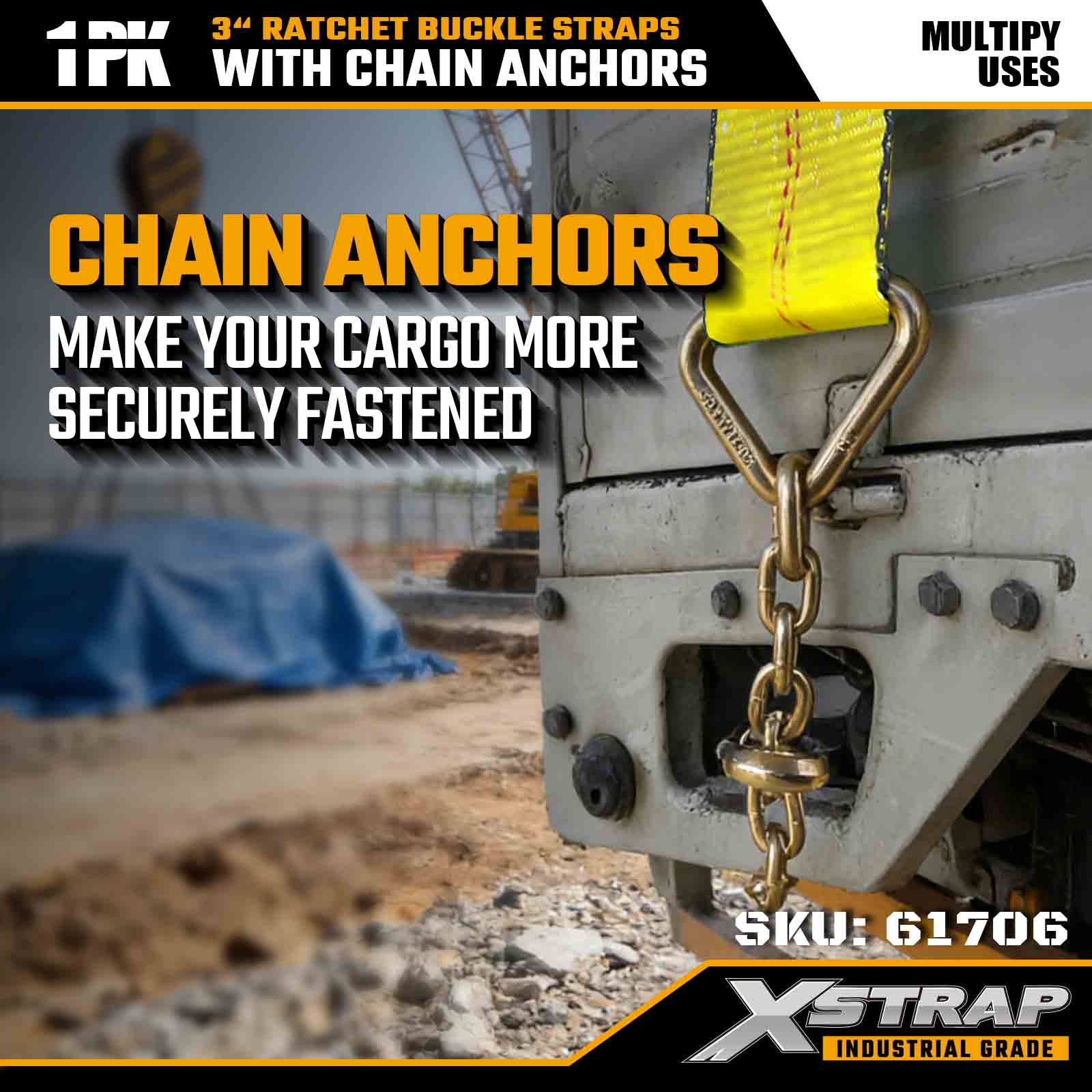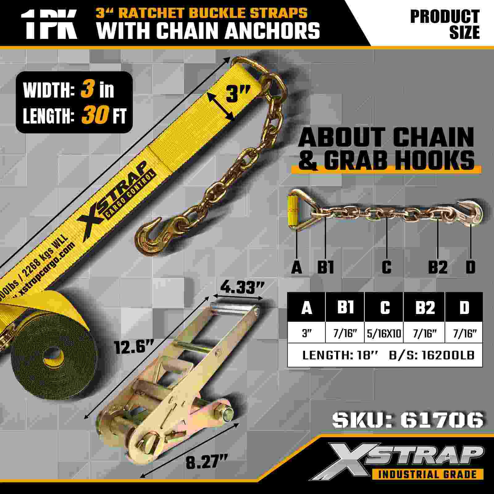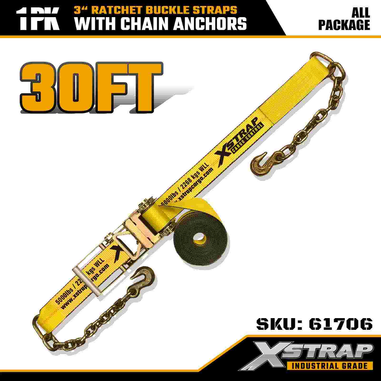Xstrap 61706 3" 30ft Ratchet Fibula Strap (1-Pack) machinata est pro onere oneris oneris, ancorae fabricandae catenae et ratio tensionis altae ratchetae. Cum 5,000 pondo WLL et 15,000 pondo frangunt, certas operationes pro flatbeds, machinis onerariis et vecturis industrialibus tradit.