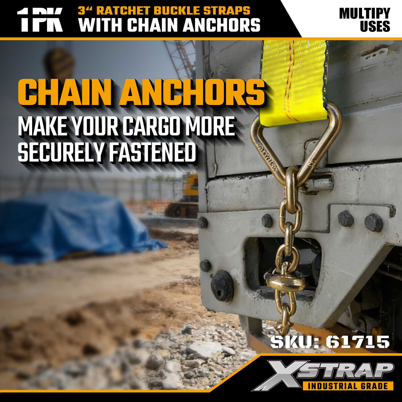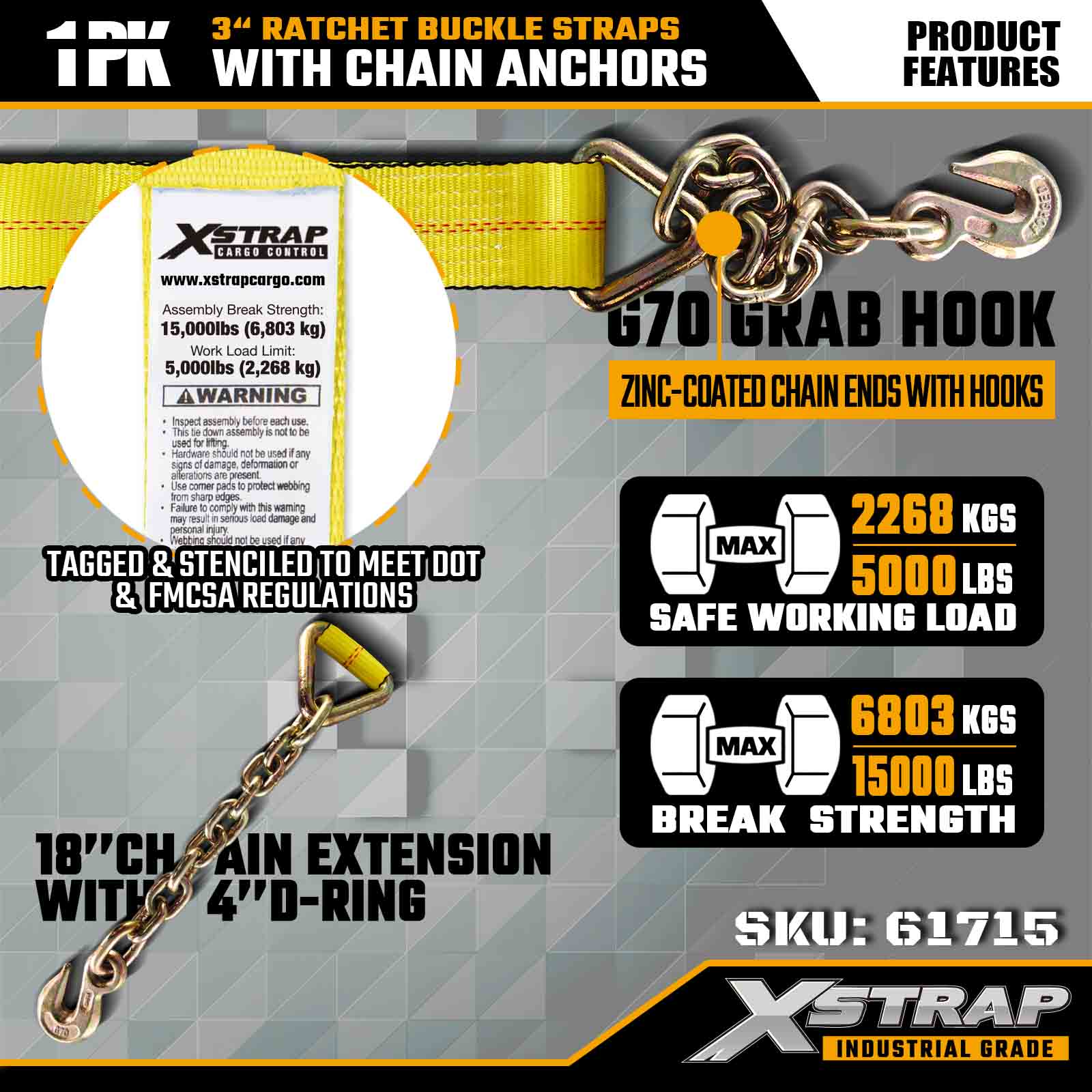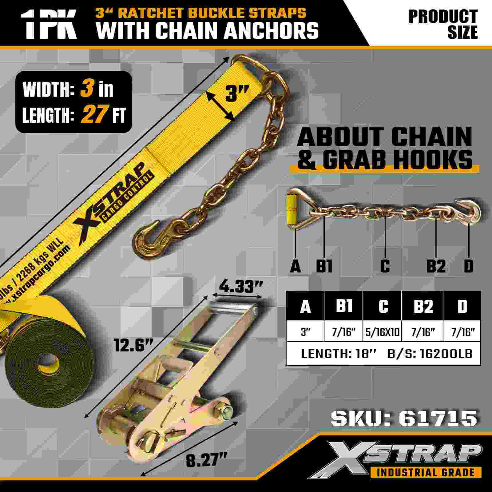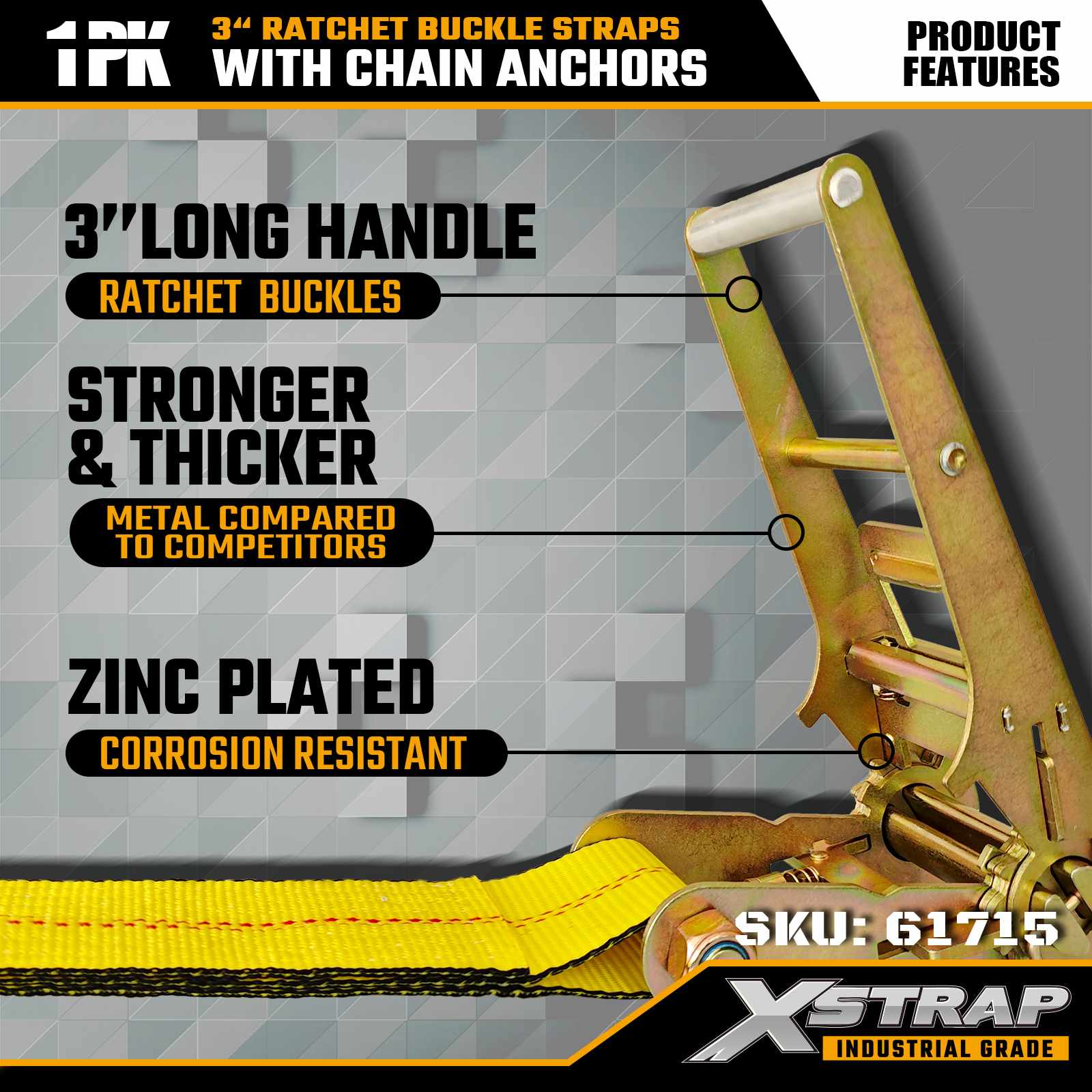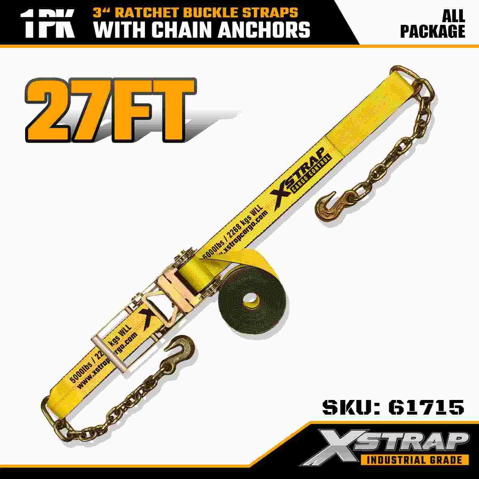 Xstrap 61715 3" x 27ft Ratchet Fibula Straps (1-Pack) - Vincula anchorae, 5,000 libras Load Capacitas, 15,000 libras Contere vires. Praegravatis officiorum onera moderatio destinata, loris iungunt ligamen-gradum industrialem cum ancora catenae extremae ad maximam securitatem in aliquet, massa, et constructione onerariis.