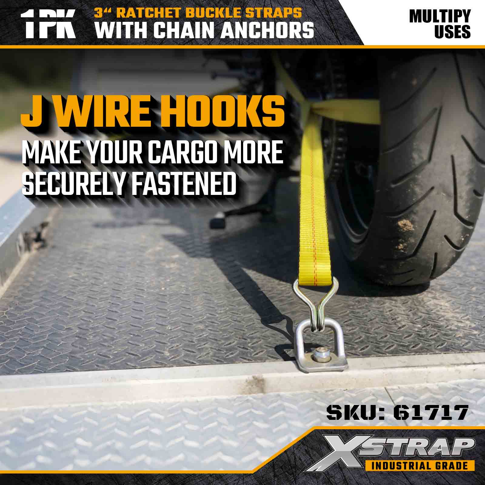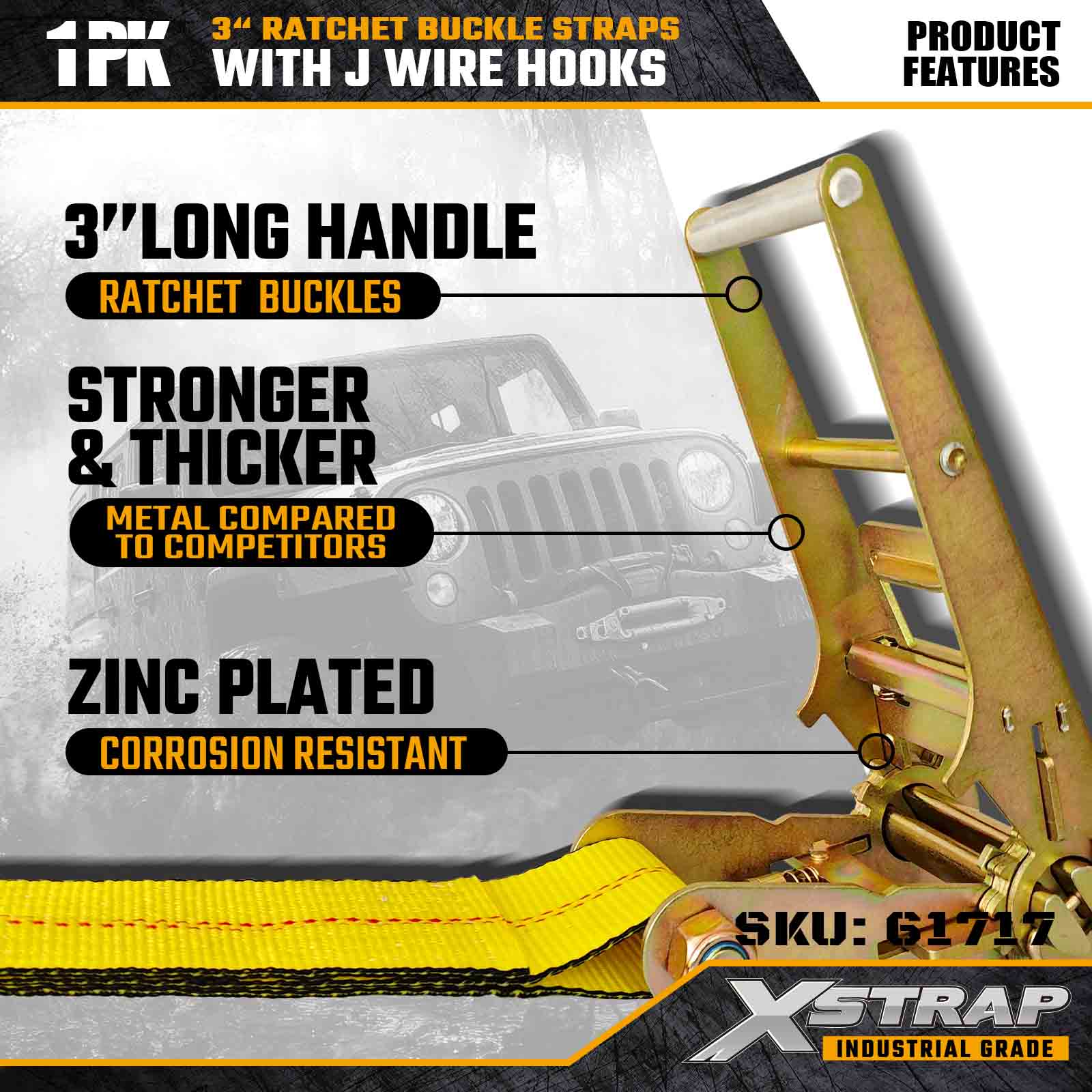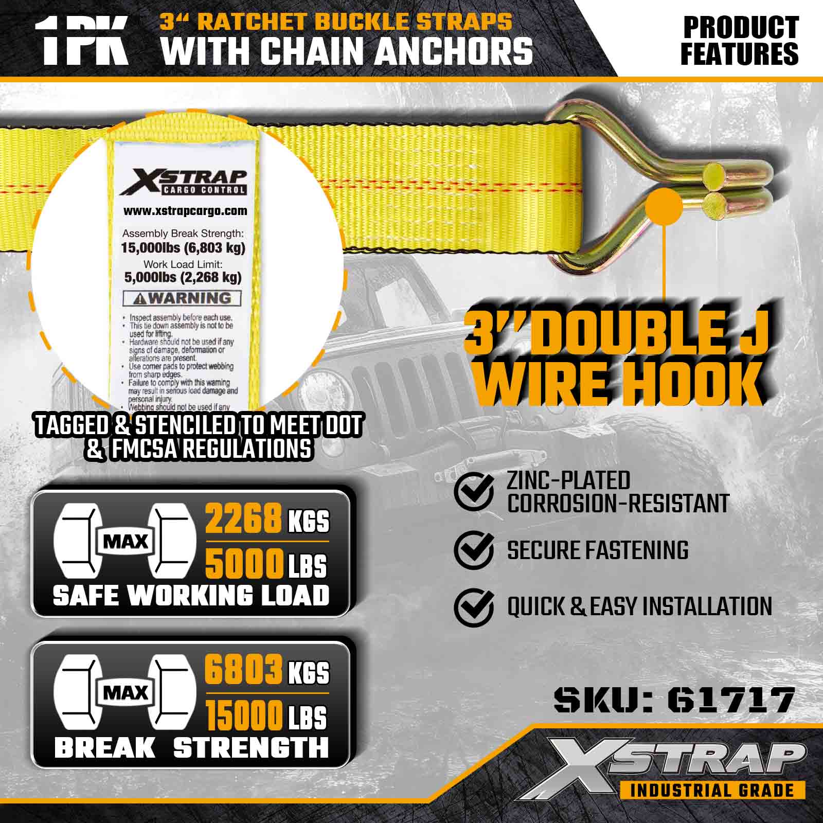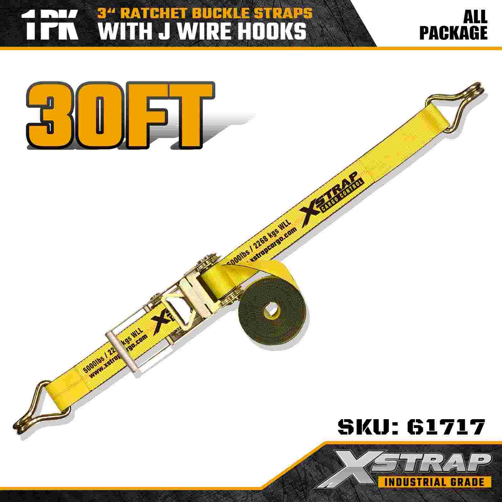 Xstrap 61717 3" 30ft Ratchet Fibula Strap (1-Pack) machinata est ad applicationes onerarias postulandas, cinematographicae filum uncinum et tensionis ratchetae systematis altae confirmatae. Cum 5,000 pondo Laboris Lond Limit et 15.000 libras Contere Strength, hoc lorum certas operationes pro flatbeds, instrumentis onerariis et logisticis industrialibus tradit.