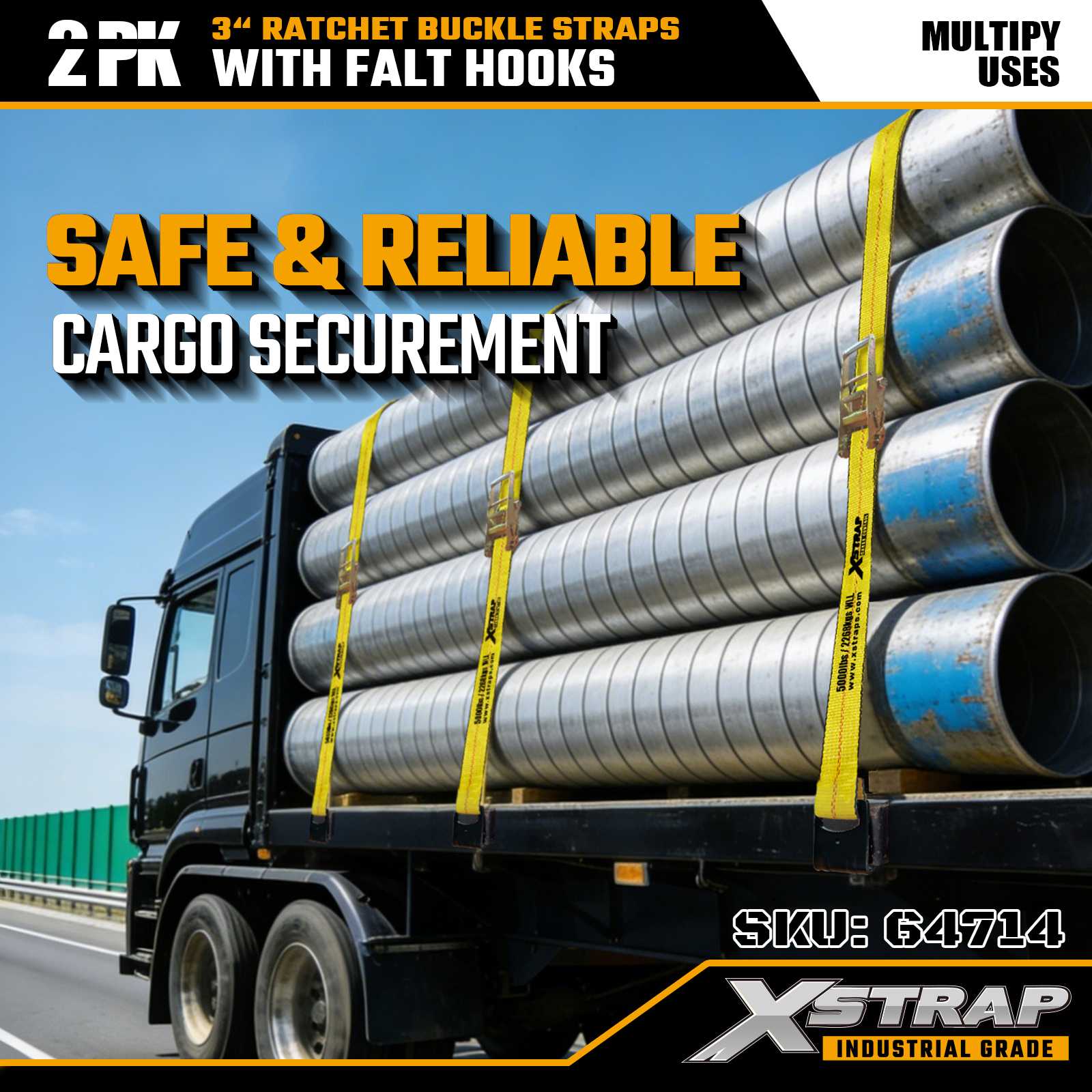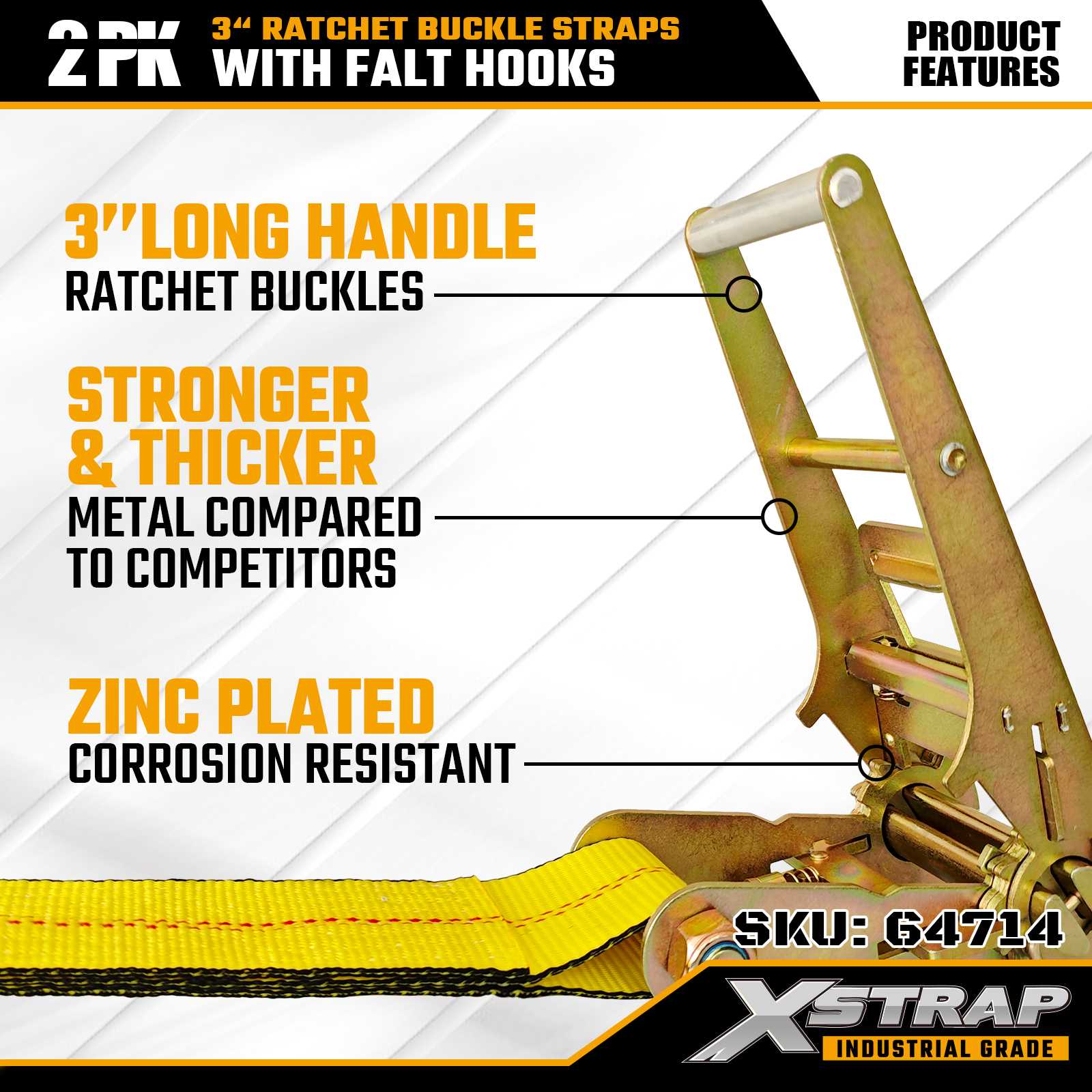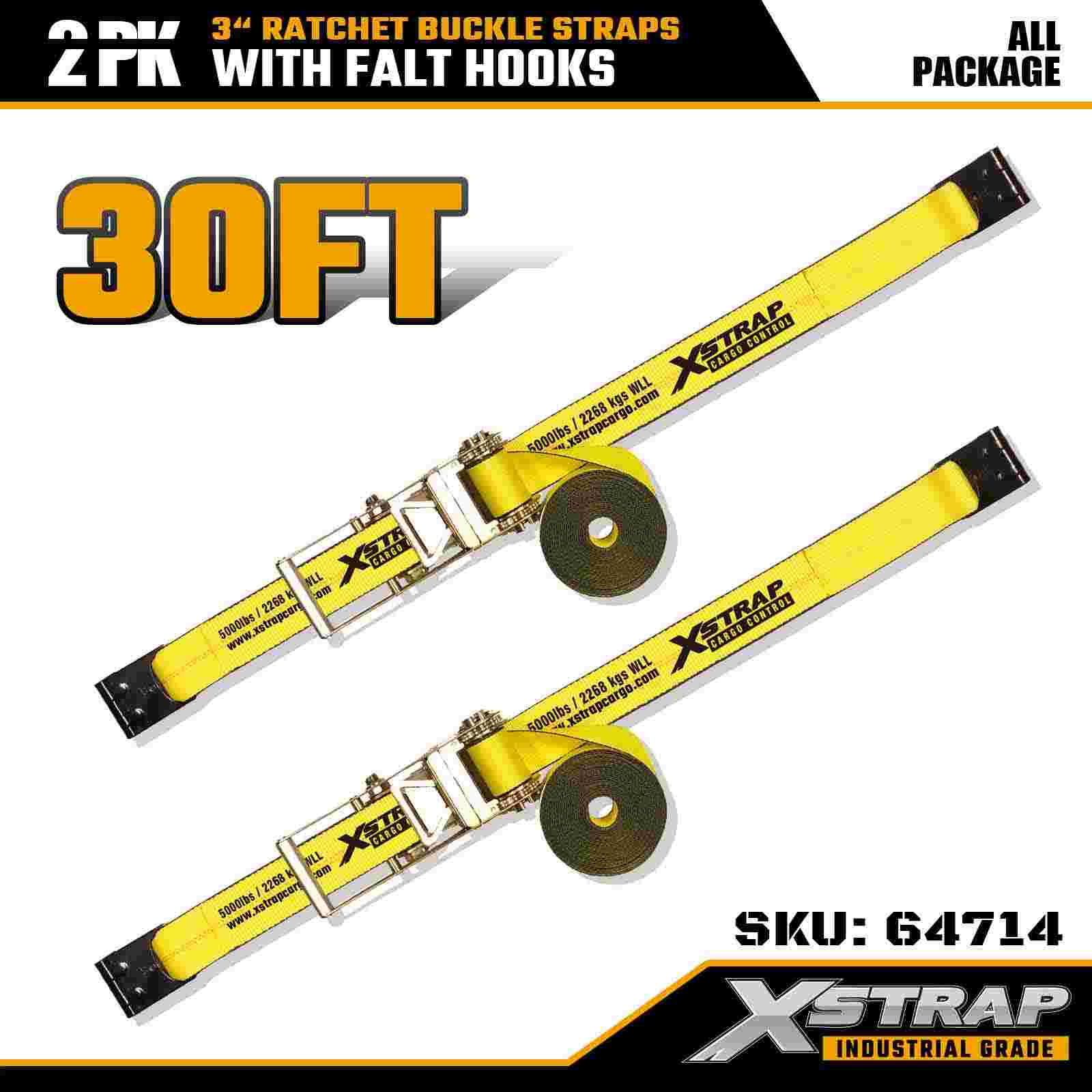 Xstrap 64714 3" x 30ft Ratchet Fibula Straps (2-Pack) - Flat Hooks, 5,000 libras Load capacitas, 15,000 libras Break Strength. Pro professionalis oneris potestate, haec gravia officia loris extensam praebent et duplicem sarcinam commoditatem pro aliquet, massa, et onerariis industrialibus.
