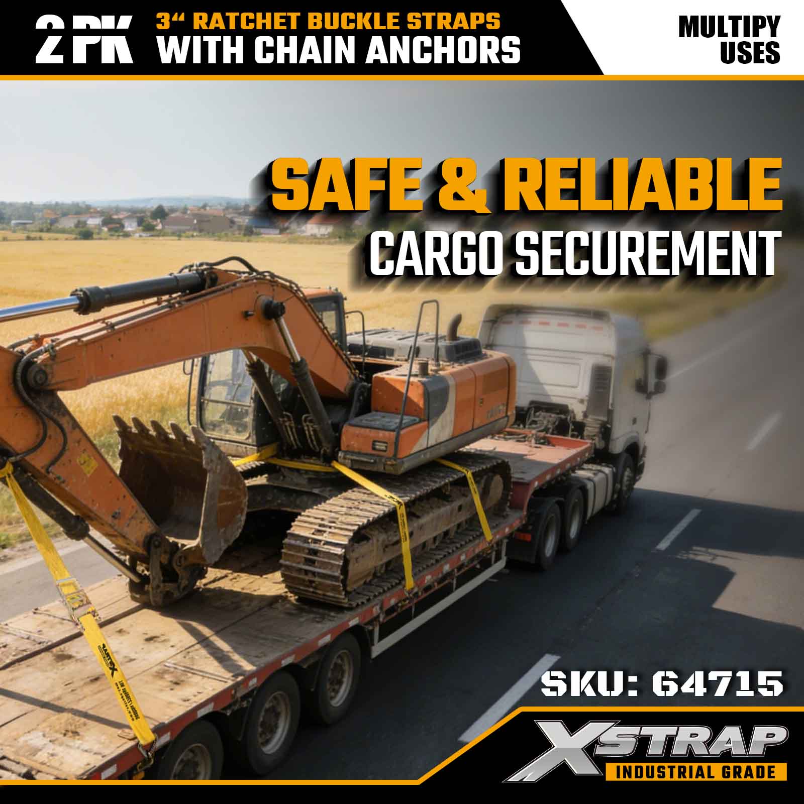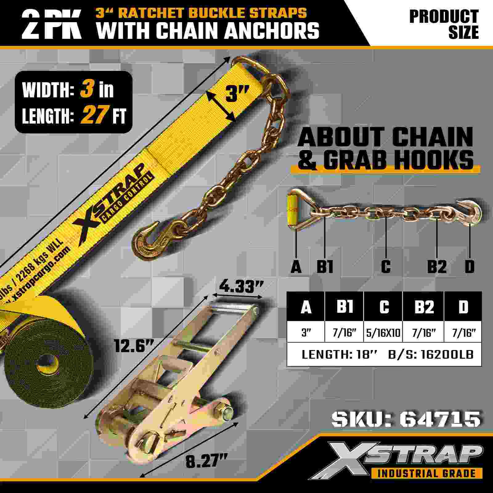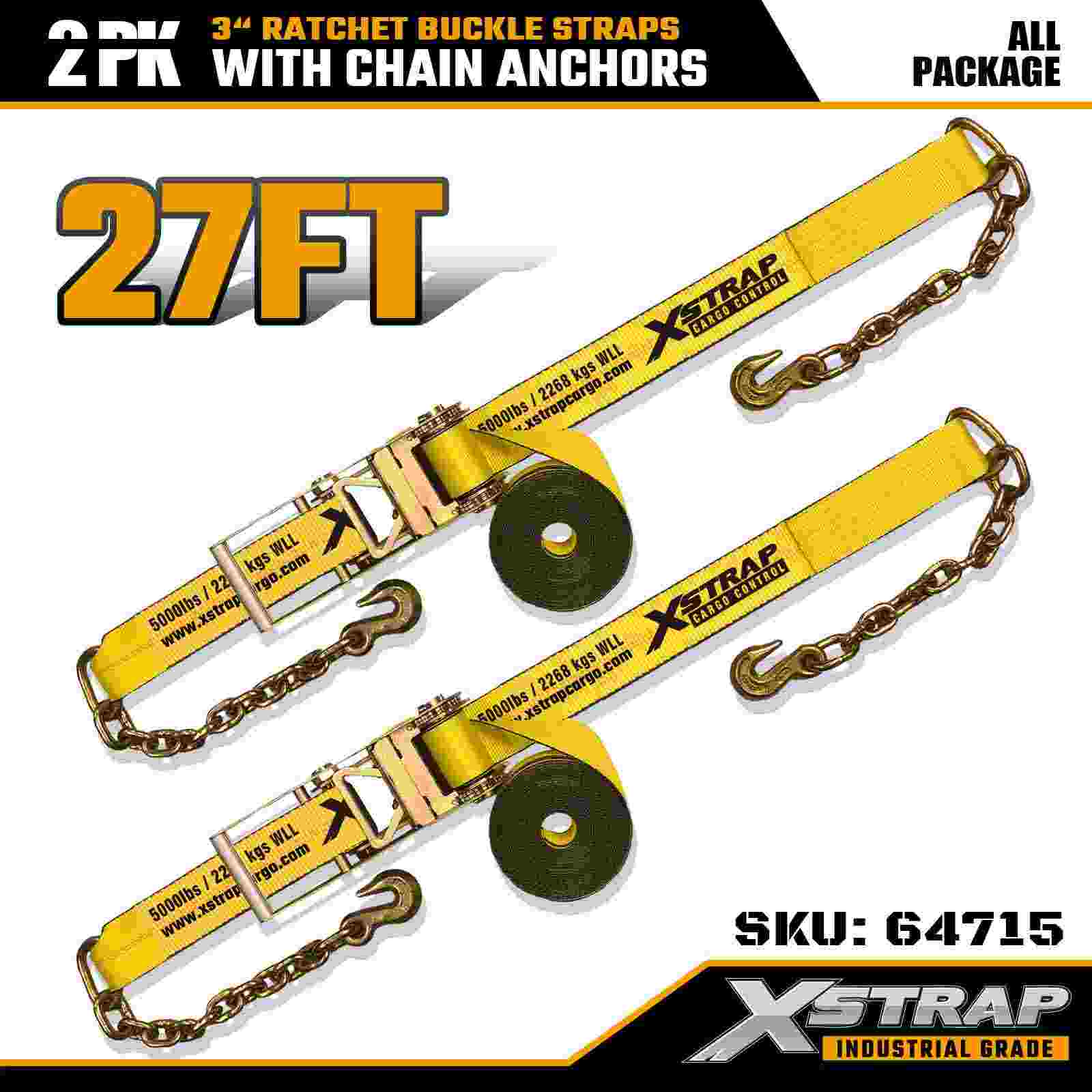 Xstrap 64715 3" 27ft Ratchet Fibulae Straps (2-Pack) - ancoris gravibus officiis instructi catenae, machinatae ad culturas onerarias exigendas. Cum 5,000 pondo Laboris limitem et 15.000 libras frange Vires, hae corrigiae liberae sunt securae, stabiles, et professionales gradus vinculo activitatis pro flatbeds, machinationibus onerariis et industrialibus.