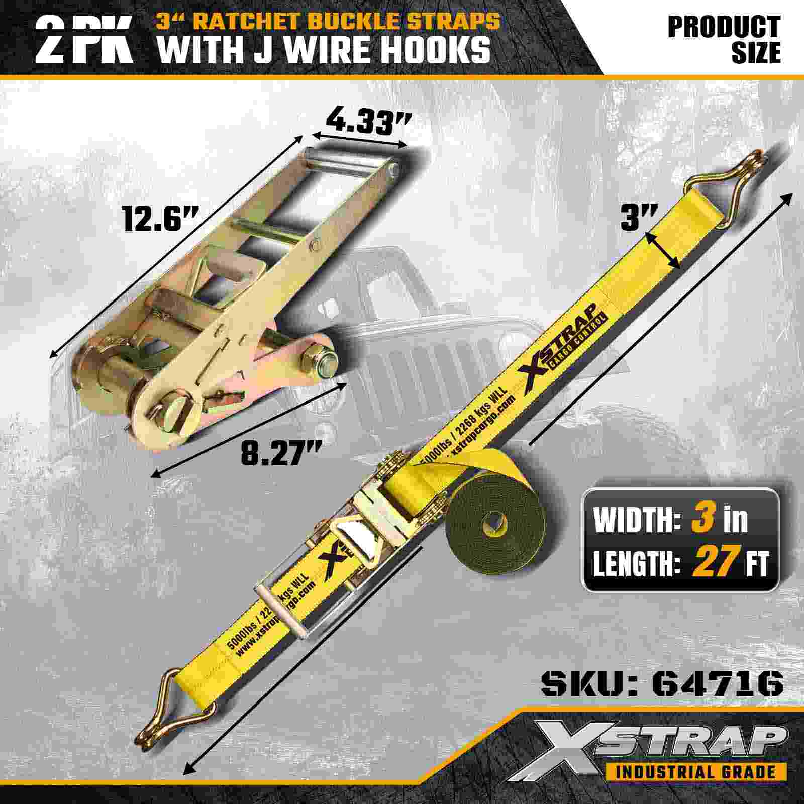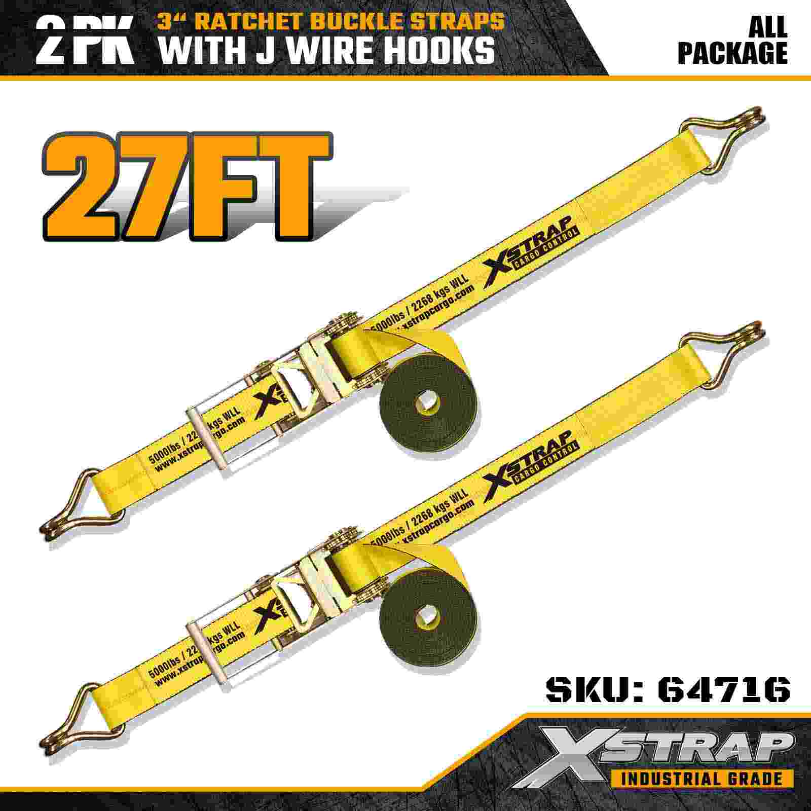 Xstrap 64716 3" 27ft Ratchet Fibulae Straps (2-Pack) destinatae sunt ad onerariam professionalem securem, featurationem summae roboris et mechanism filum ratchetae durabilem. Cum 5,000 pondo Operationis Lond Limit et 15.000 libras Contere robur, hae corrigiae liberae certae operationis pro flatbeds, vecturas onerariis, et industriae vecturae.