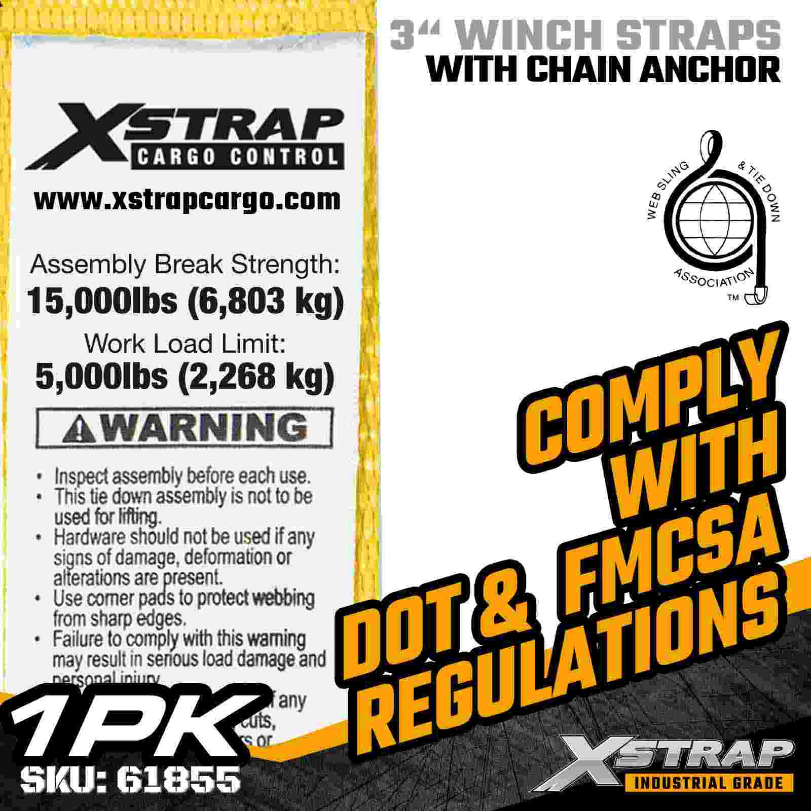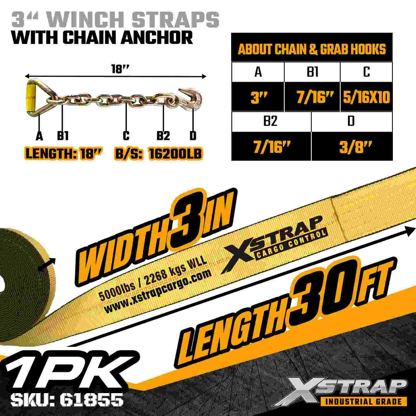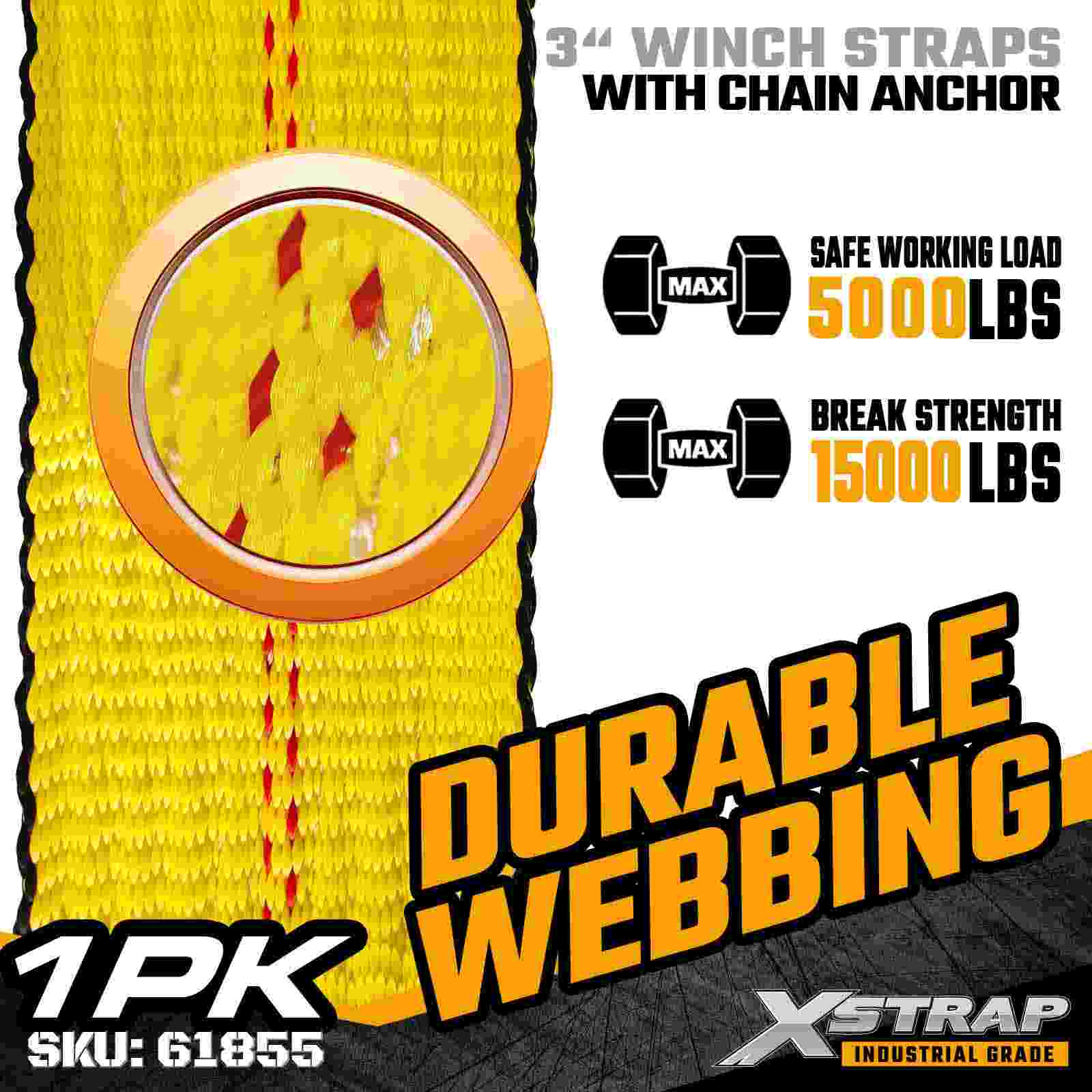 Xstrap 61855 3" 30ft Vexillum Winch Strap est grave officium onerariae industrialis lorum secures globosis stratae et onerariis onerariis destinatae. Instructus ancorae fictae catenae et extra-latae 3 pollicis polyester ligatura, haec 3 unciarum winch corrigiam liberat 5,000 pondo Laborans longitudinis limitis altae et 15. 000 librarum evulsio laxior et inordinate protensa, vel 15000 pondo latiores facit evulsio. informibus oneribus adiectis ac stabilitatem requirunt.