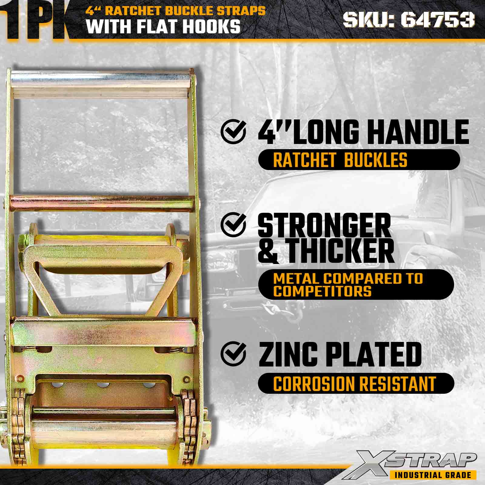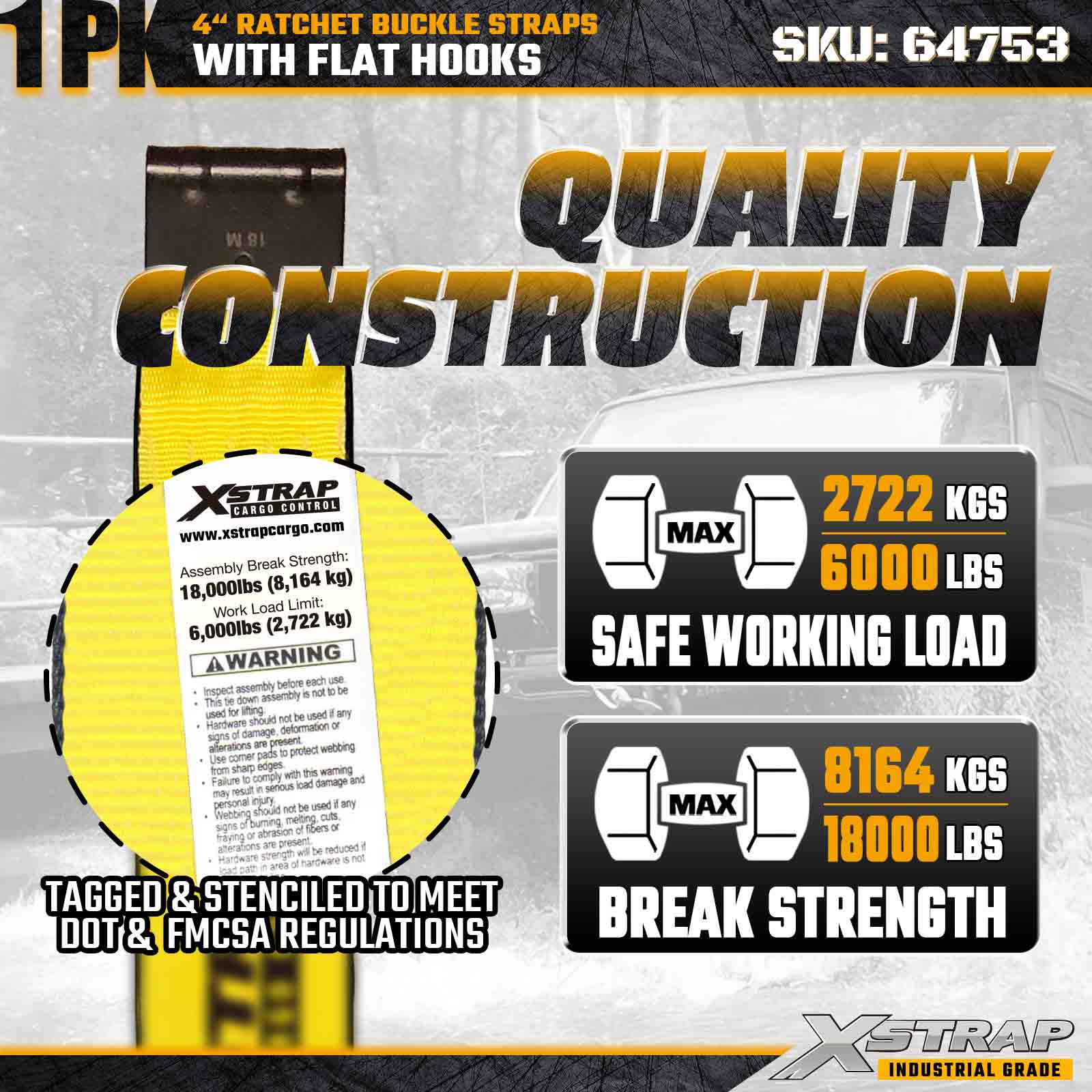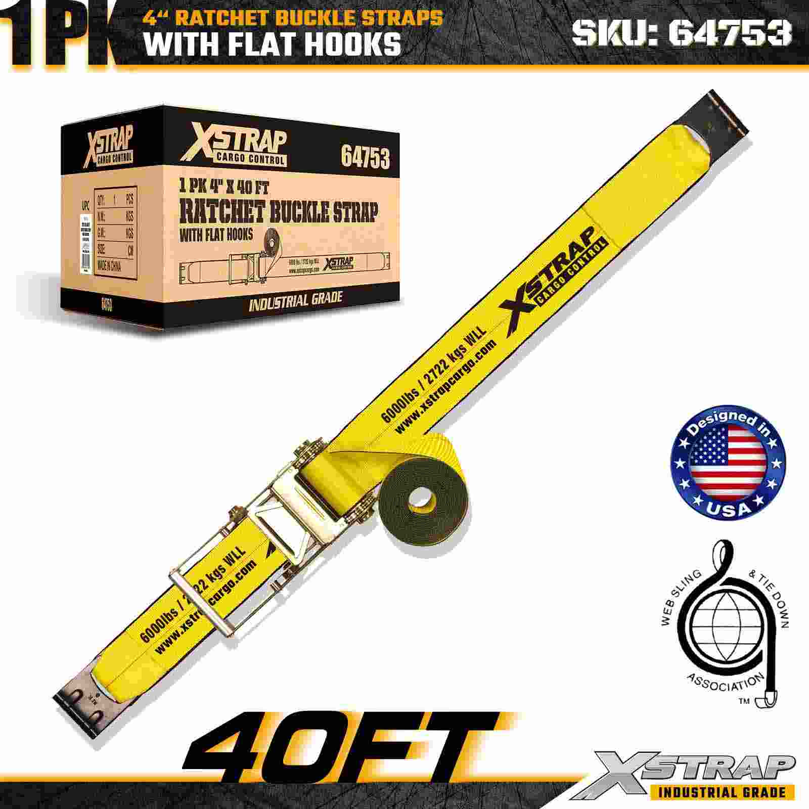 Xstrap 64753 4" 40ft Ratchet Fibula Strap (1-Pack) destinatur ad onera gravia-officii tutandi, featuratio firmati Hooks planae et mechanismi durabilis ratchetae. Cum 6,000 pondo onerationis limitis et 18,000 pondo Conterunt Fortitudo, hoc extra-longum lorum est specimen applicationis, vecturae, machinae, onerariae, onerariae, onerariae onerariae aptae.