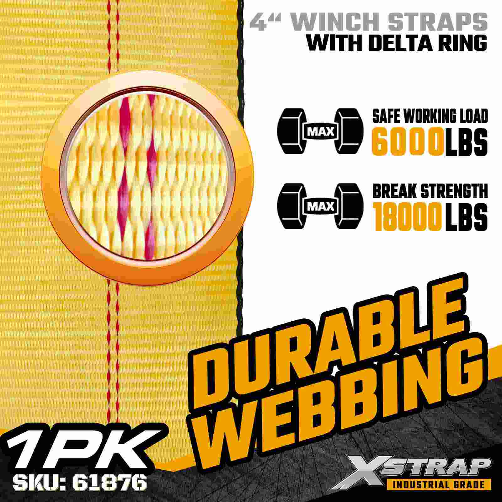 Xstrap 61876 4" 27ft Standard Winch Strap est premium grave-officii oneris secures lorum machinatorum pro trailers et industrialis onerariis sculpendis machinatis. Aliquam Delta anulum auctum et ultra-latum 4-inch polyester webbing, haec 4 pollicis lorum liberat 6.000 pondo Operationis Lond limitem faciens et 18.000 libras Contere Ring. feugiat inaequale quod requirit stabilitatem auctam et ancoras flexibiles.