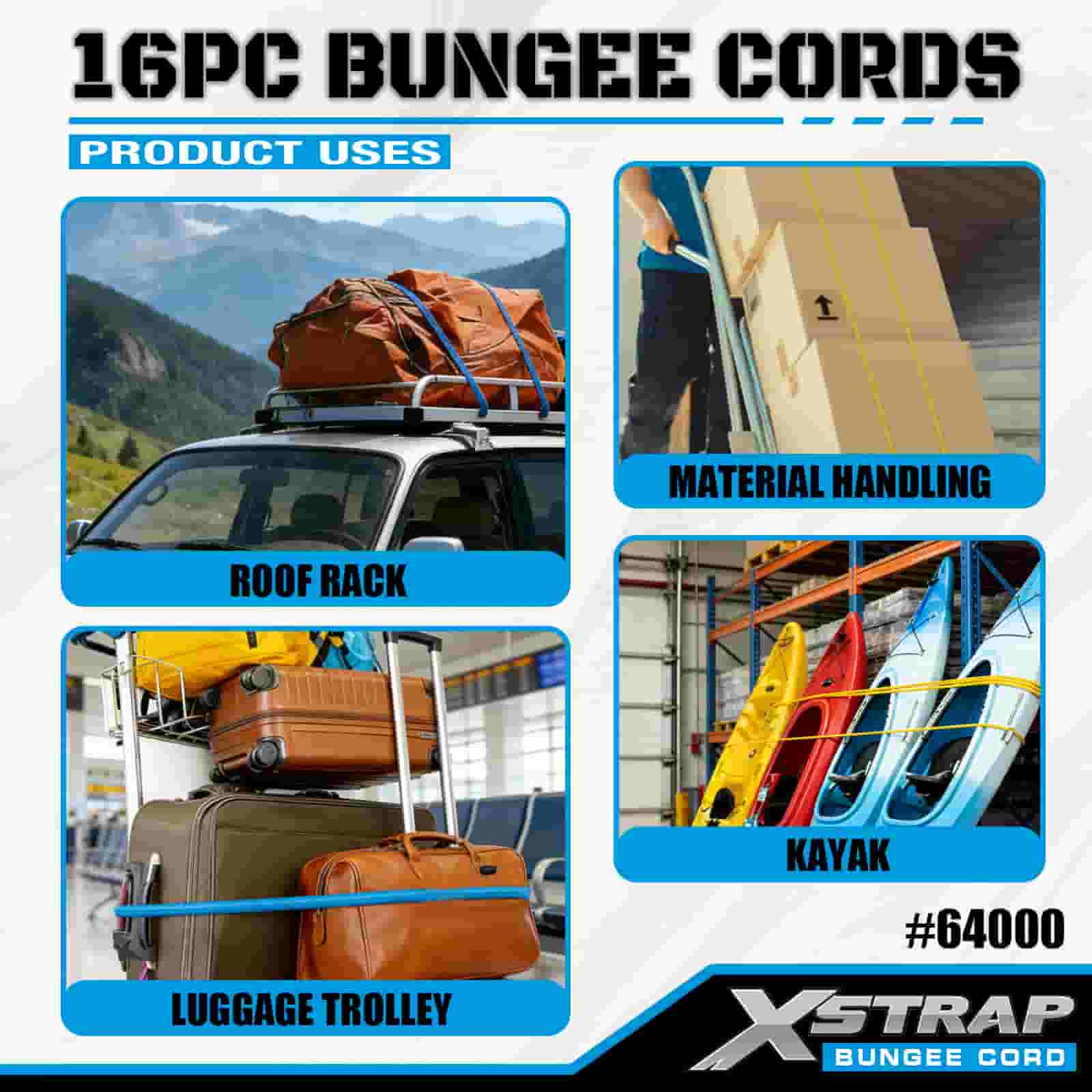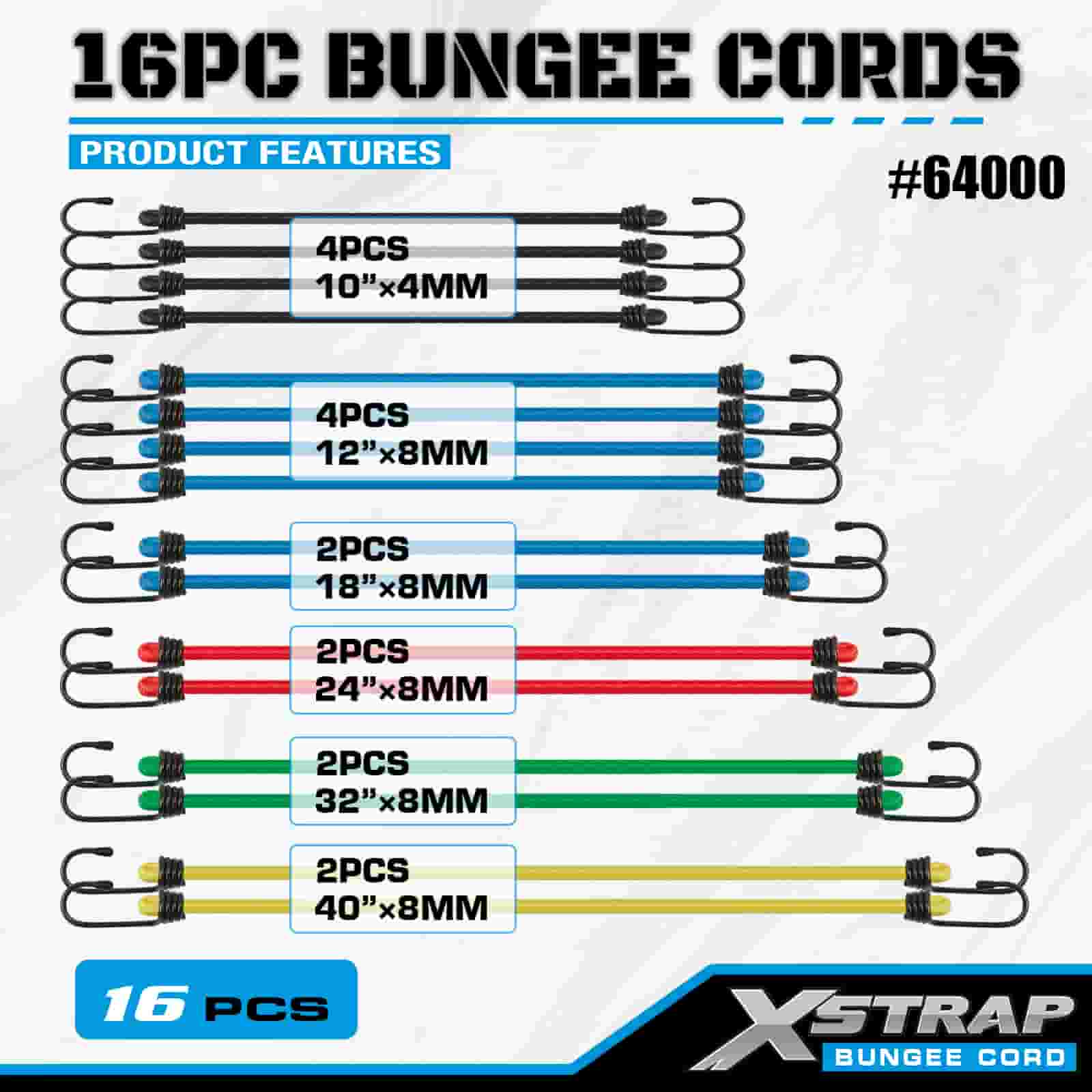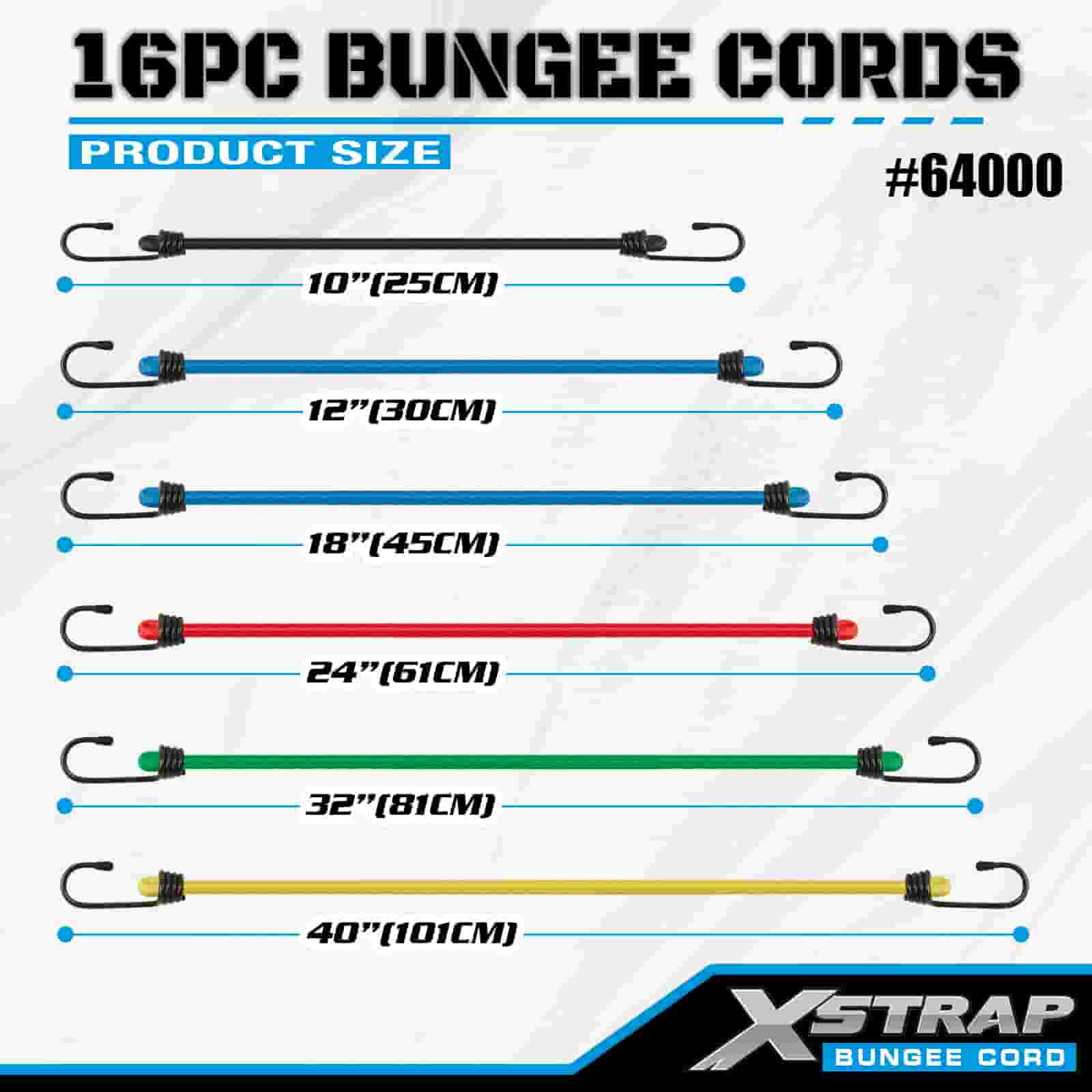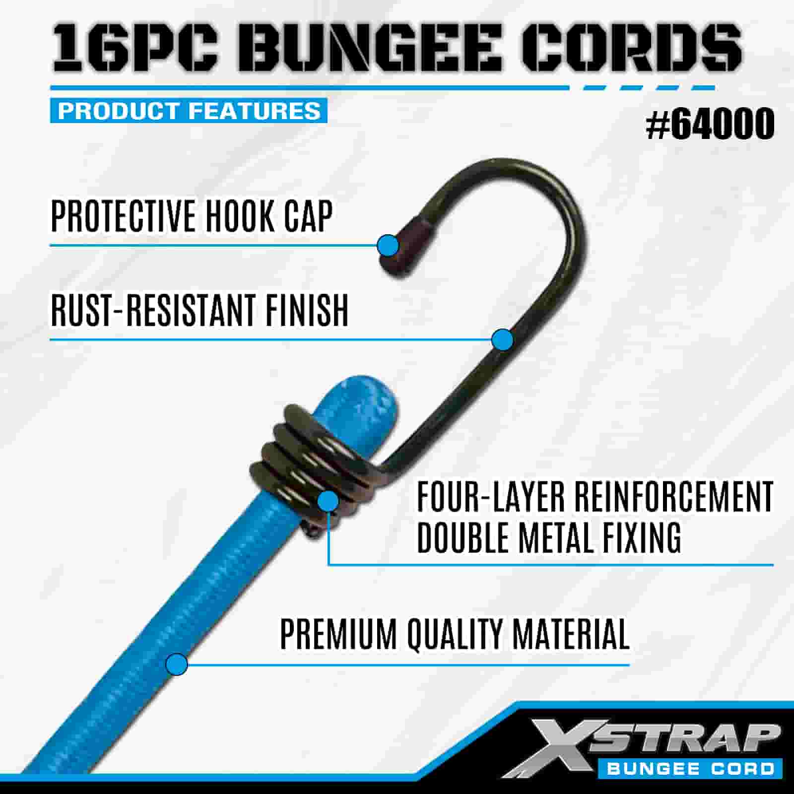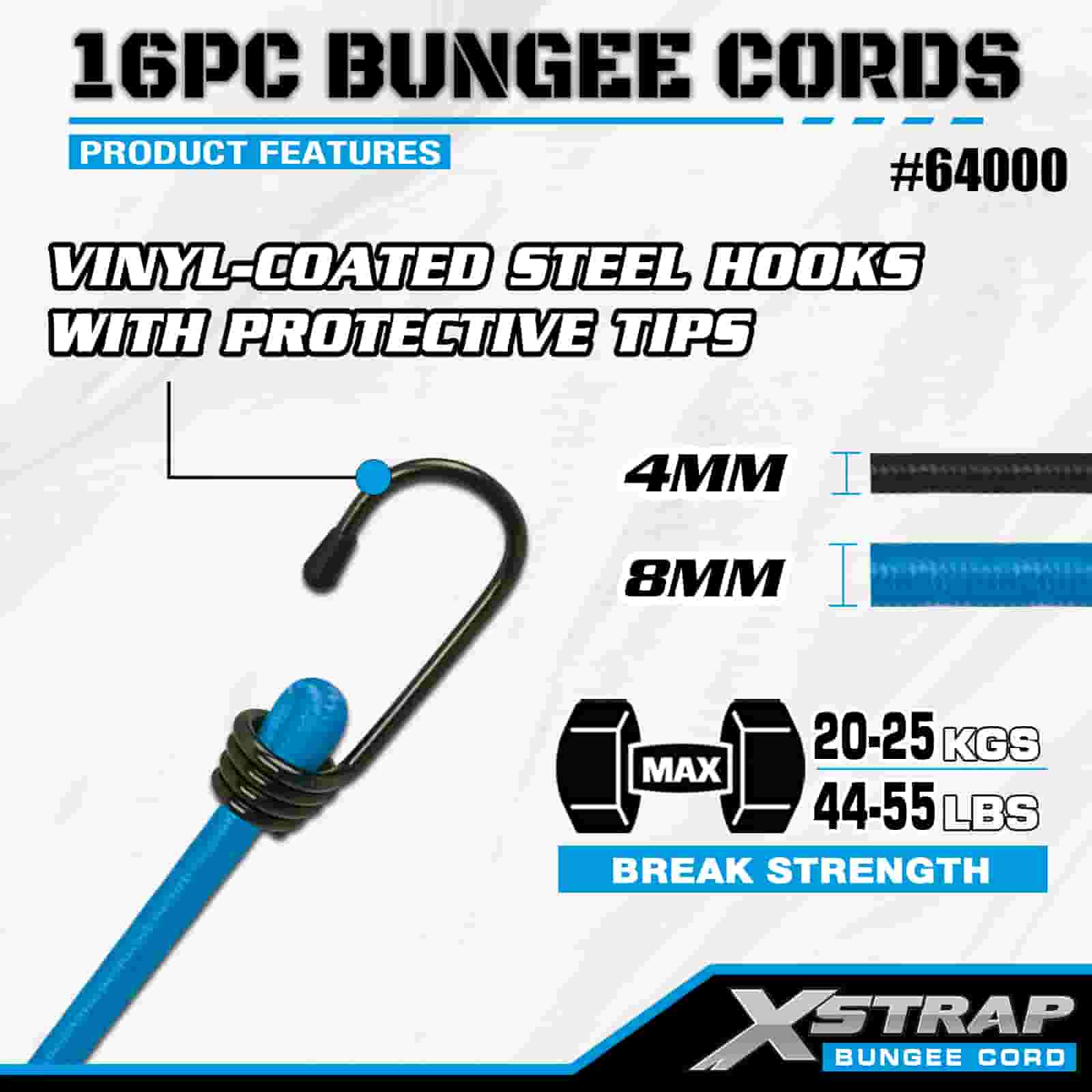 Xstrap 16PK 16PK Funiculi Bungee Pone 8mm x 12"/18"/24"/32"/40"; 4mm x 10" Mini Bungee, 44-55lbs frangunt vires cum Vinyl hamis ferro obductis cum apicibus tutelae et staandardis veris hamis.