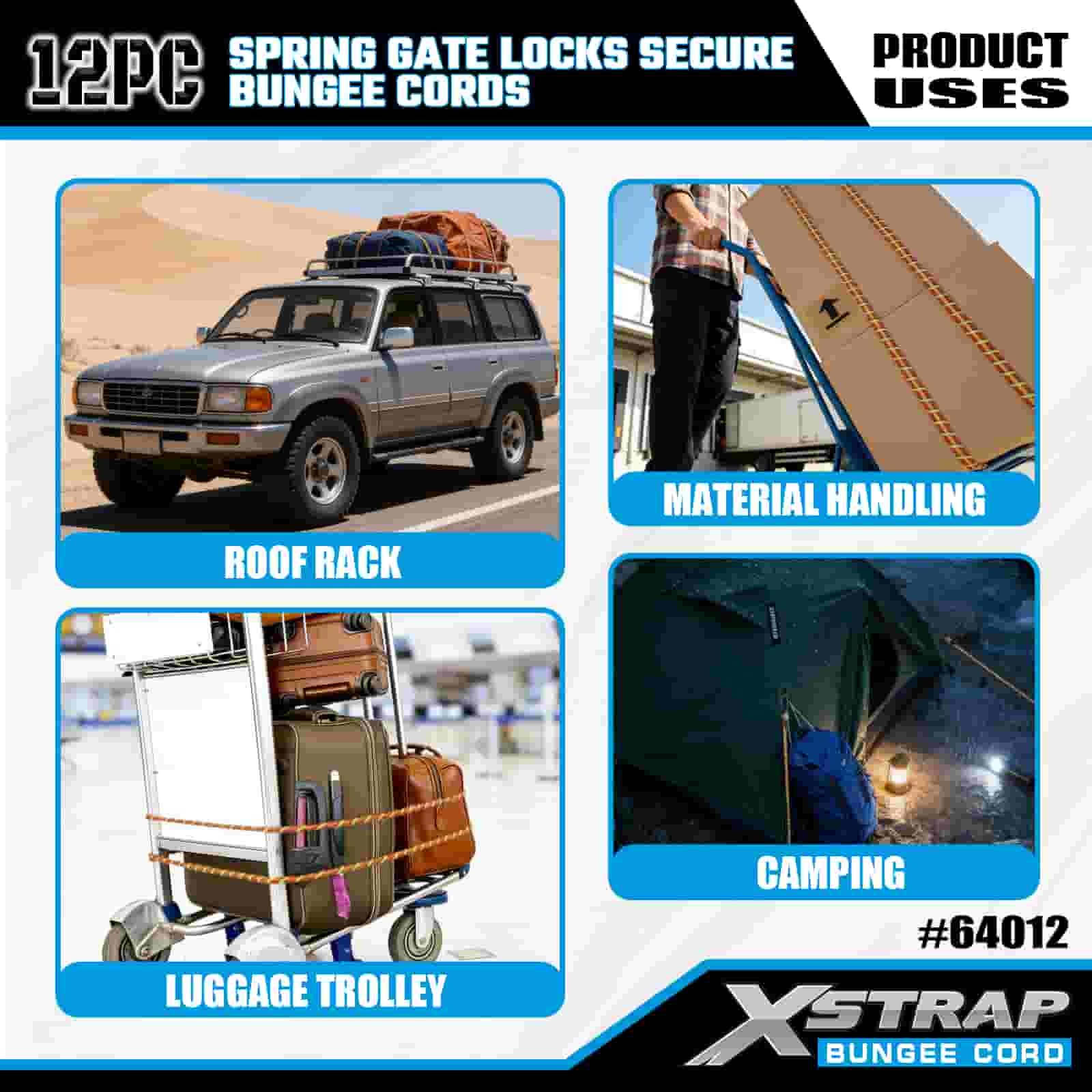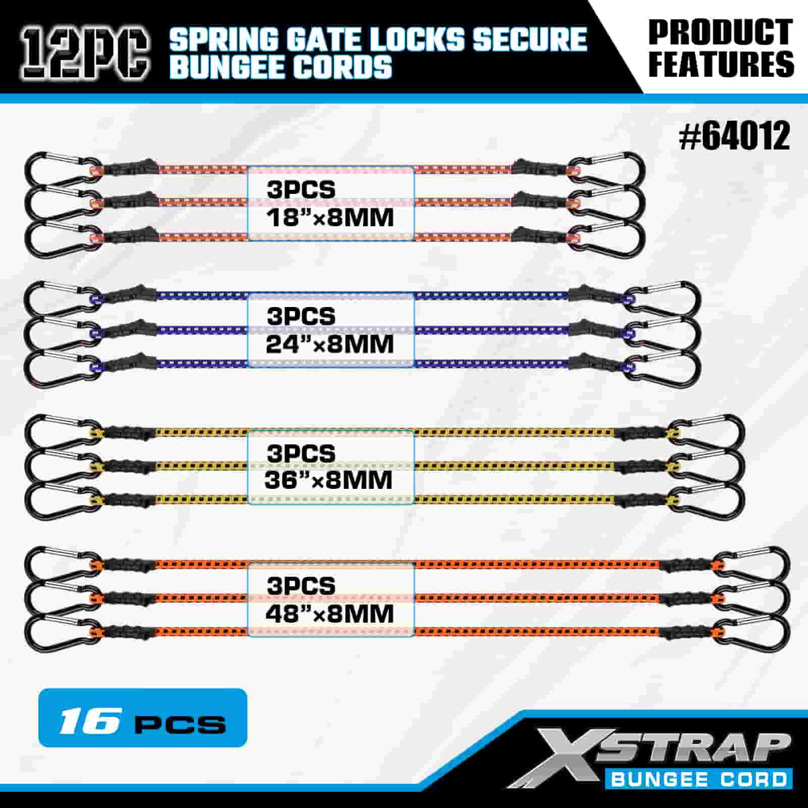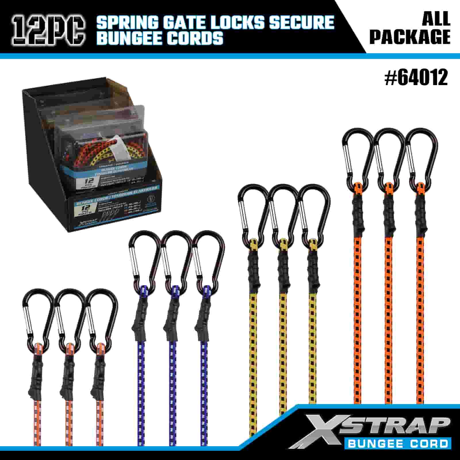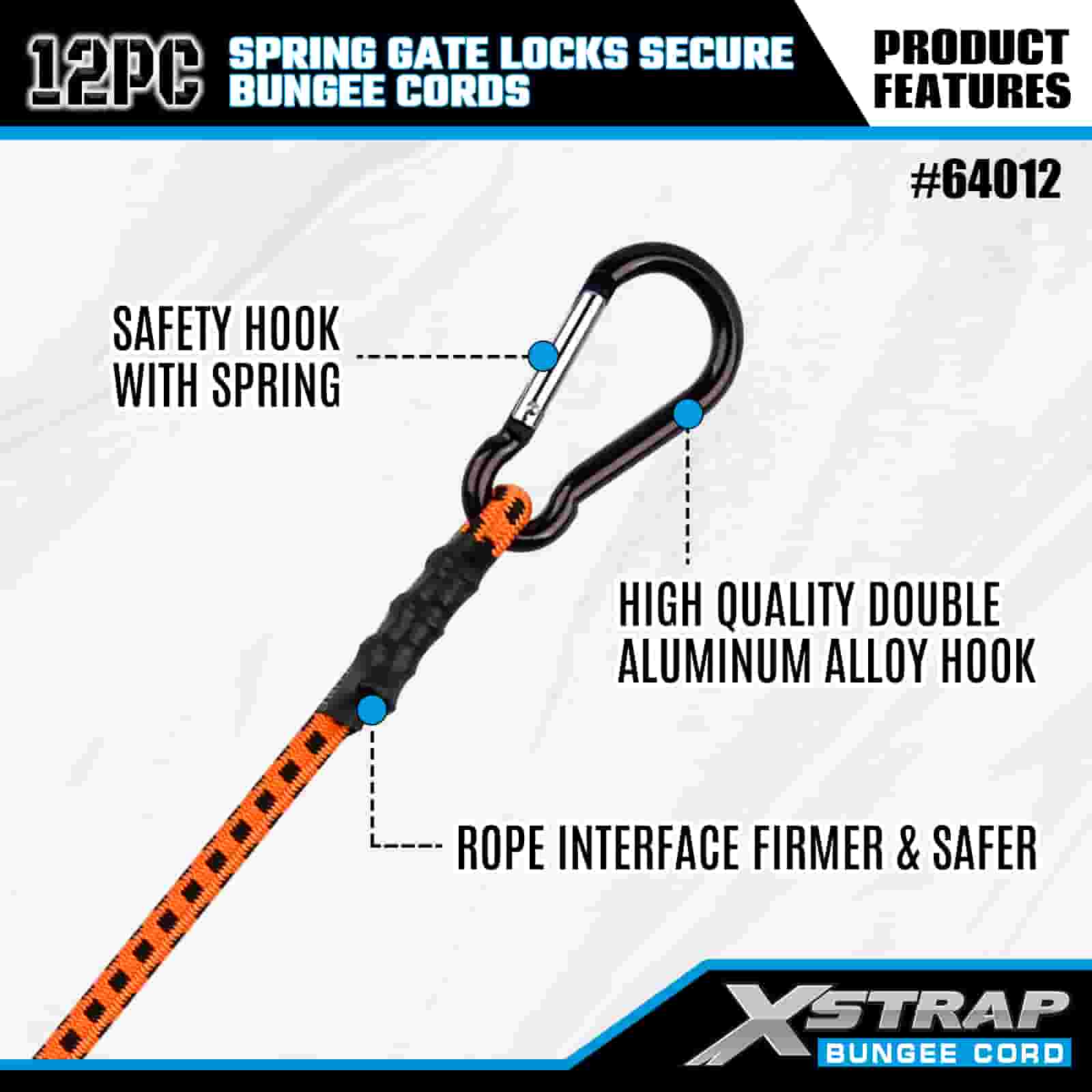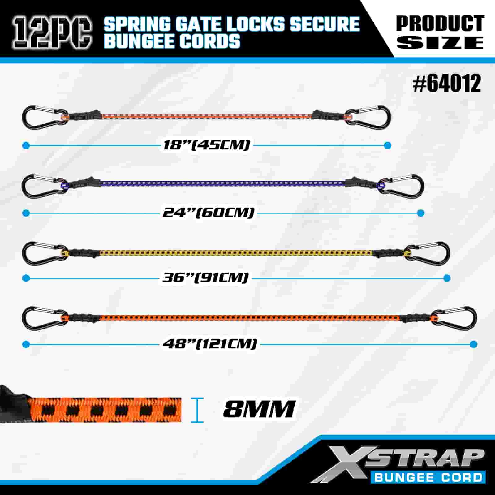 Xstrap 12PK Verna porta Seras Secure Bungee Funiculi 8mm x 18"/24" /36"/ 48", 88-110lbs vires frangunt cum carabinibus hamis veris portae seram secura.