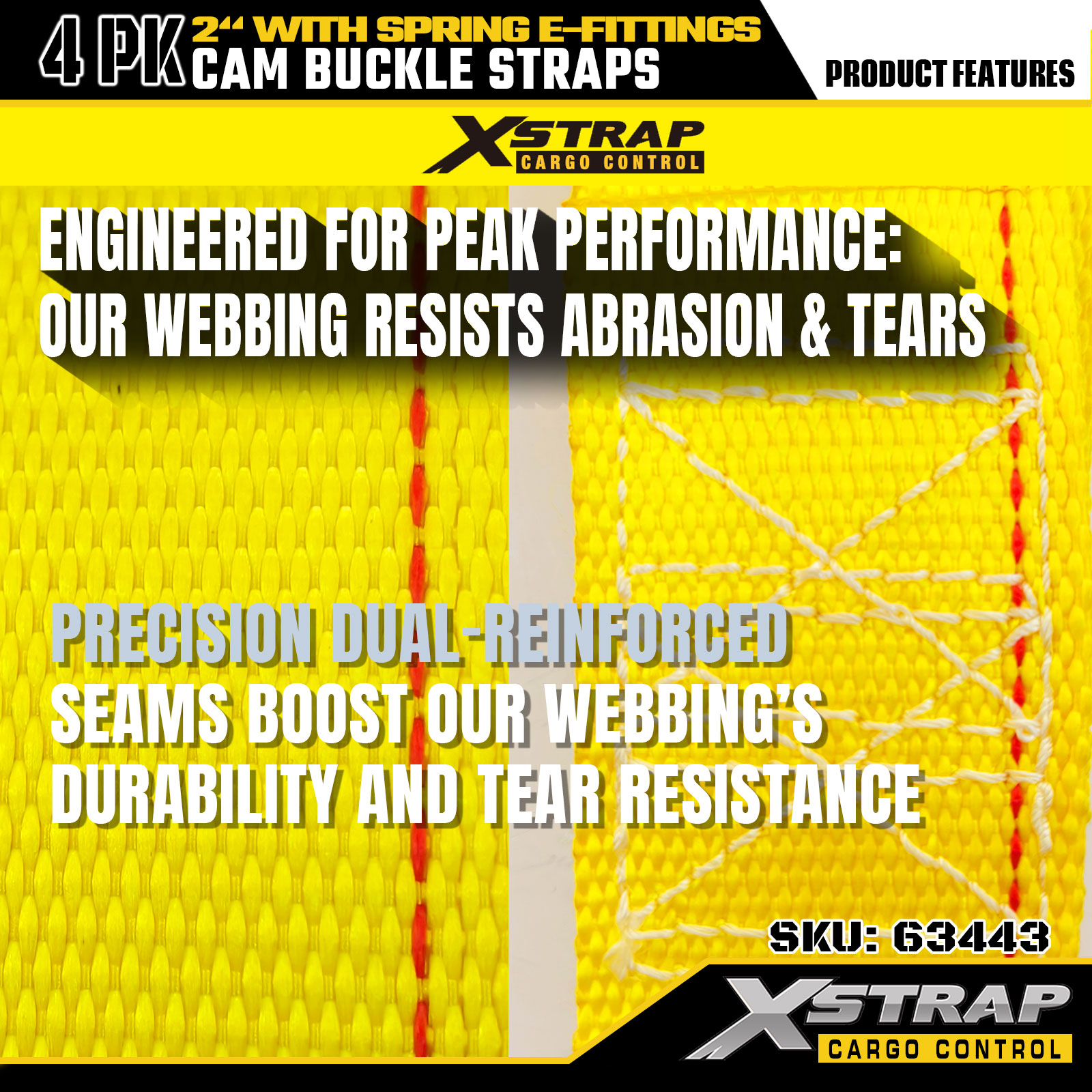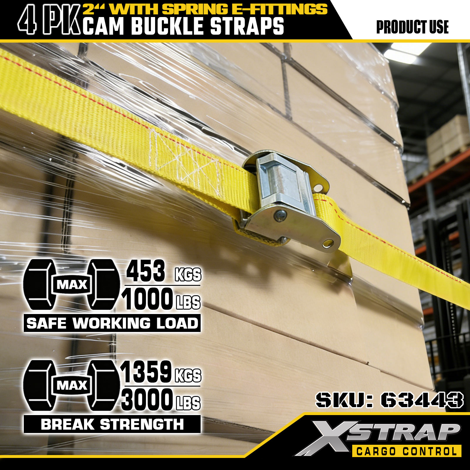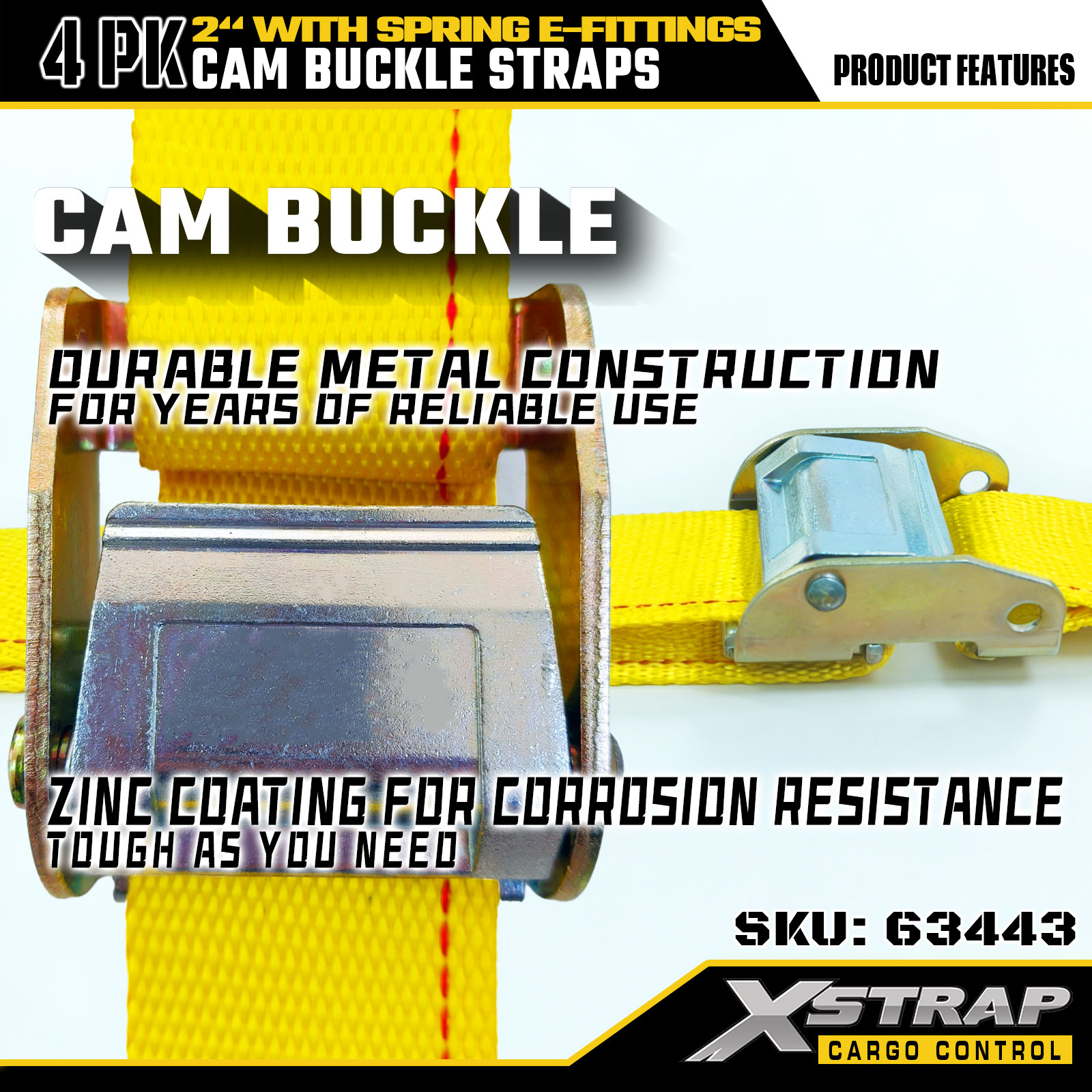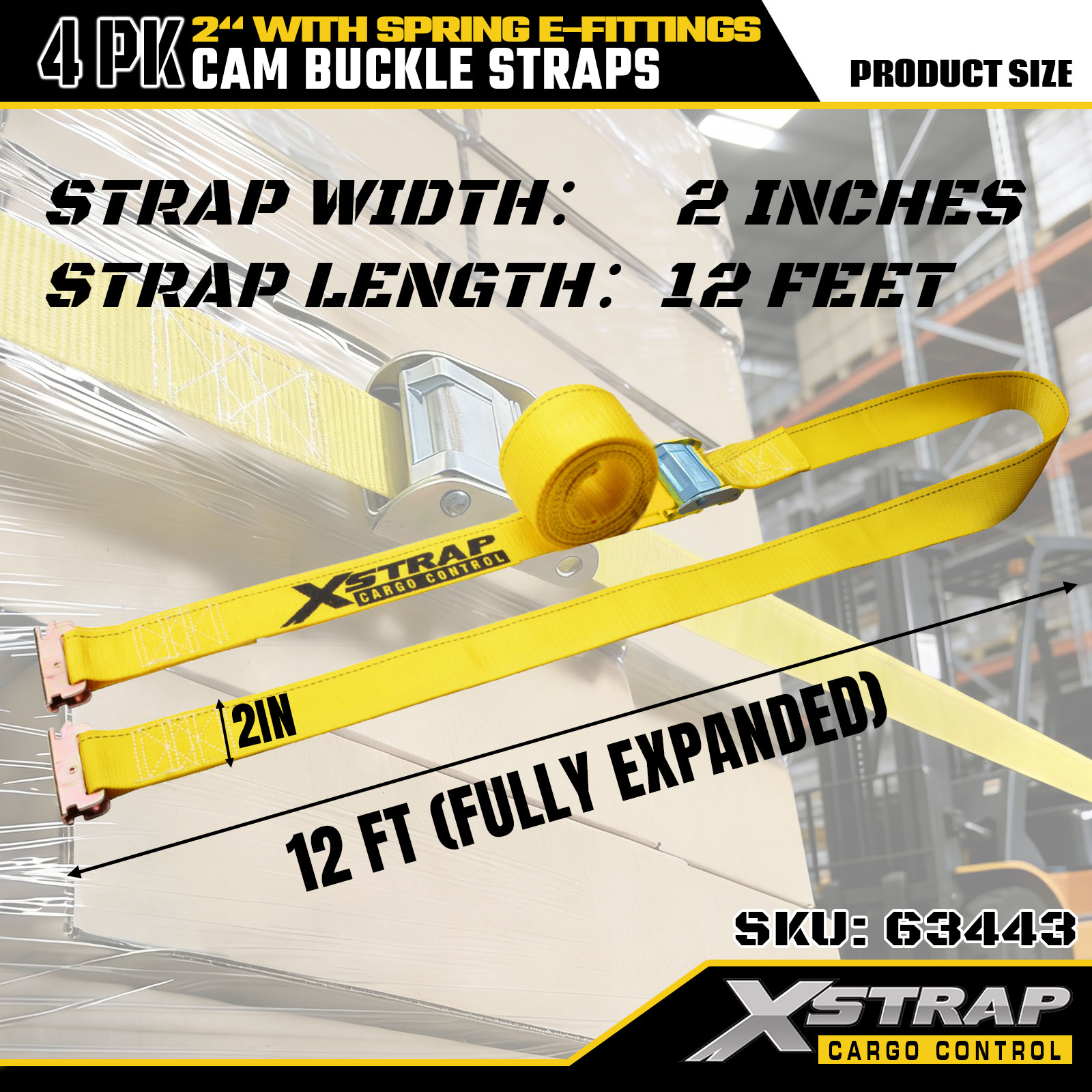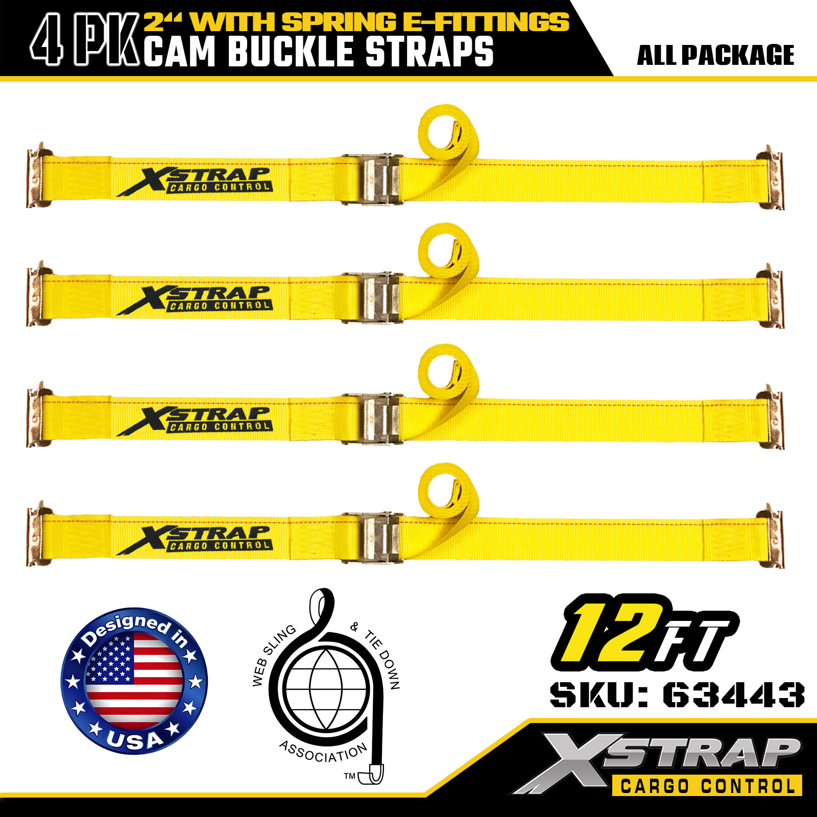Xstrap 63443 4 Pack 2" x 12' flavum Cam Buckle Straps with Spring E-Fittings, 1000 lbs SWL & 453 libras Breaking Strength for Cargo Handling, Relocation & Transit