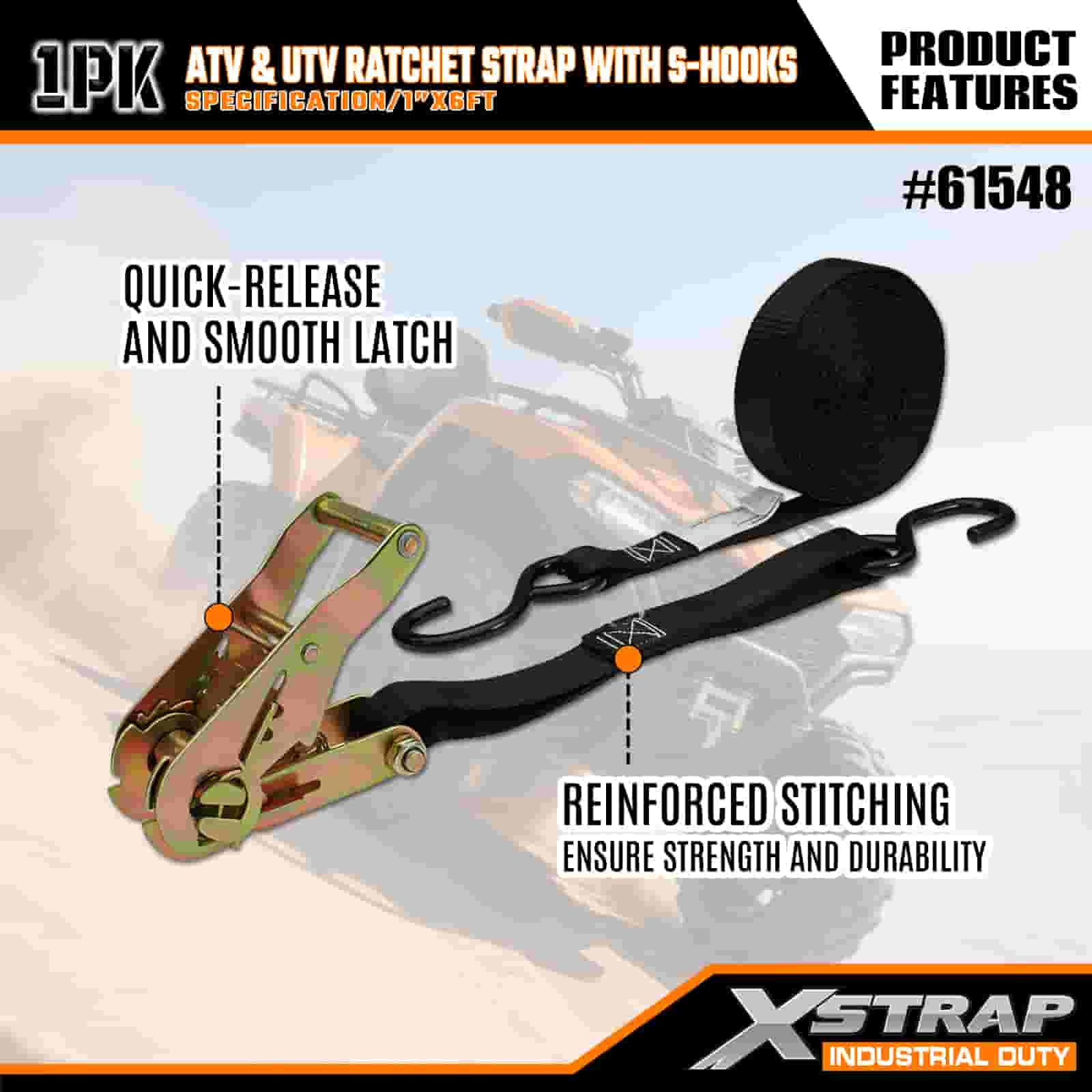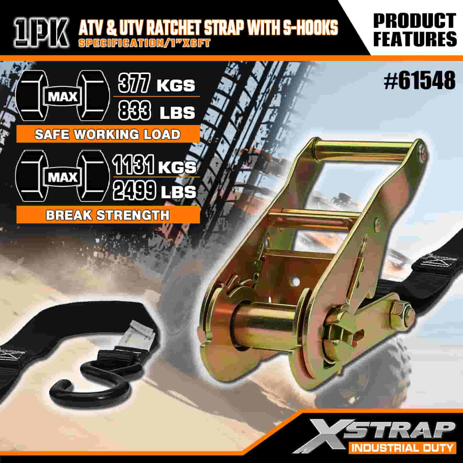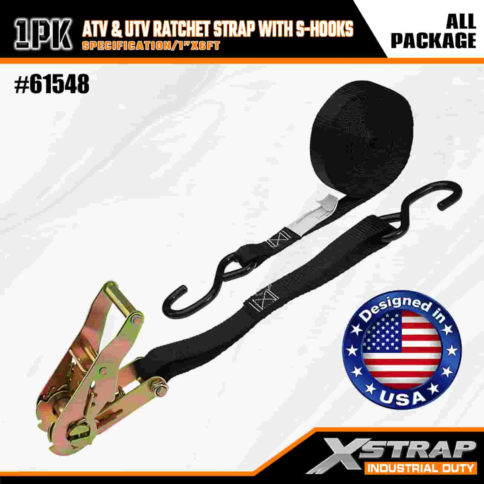 Xstrap ATV & AUV Ratchet Strap cum S Hooks, 1" x 6' Polyester ligamen Strap Ratchet Strap, 833lbs Capacitas Cargo Lashing Securing Straps cum Hooks pro Trailer, Flat Bed Trailer Ski Scapha, Vecicula, Gravis Equipment.