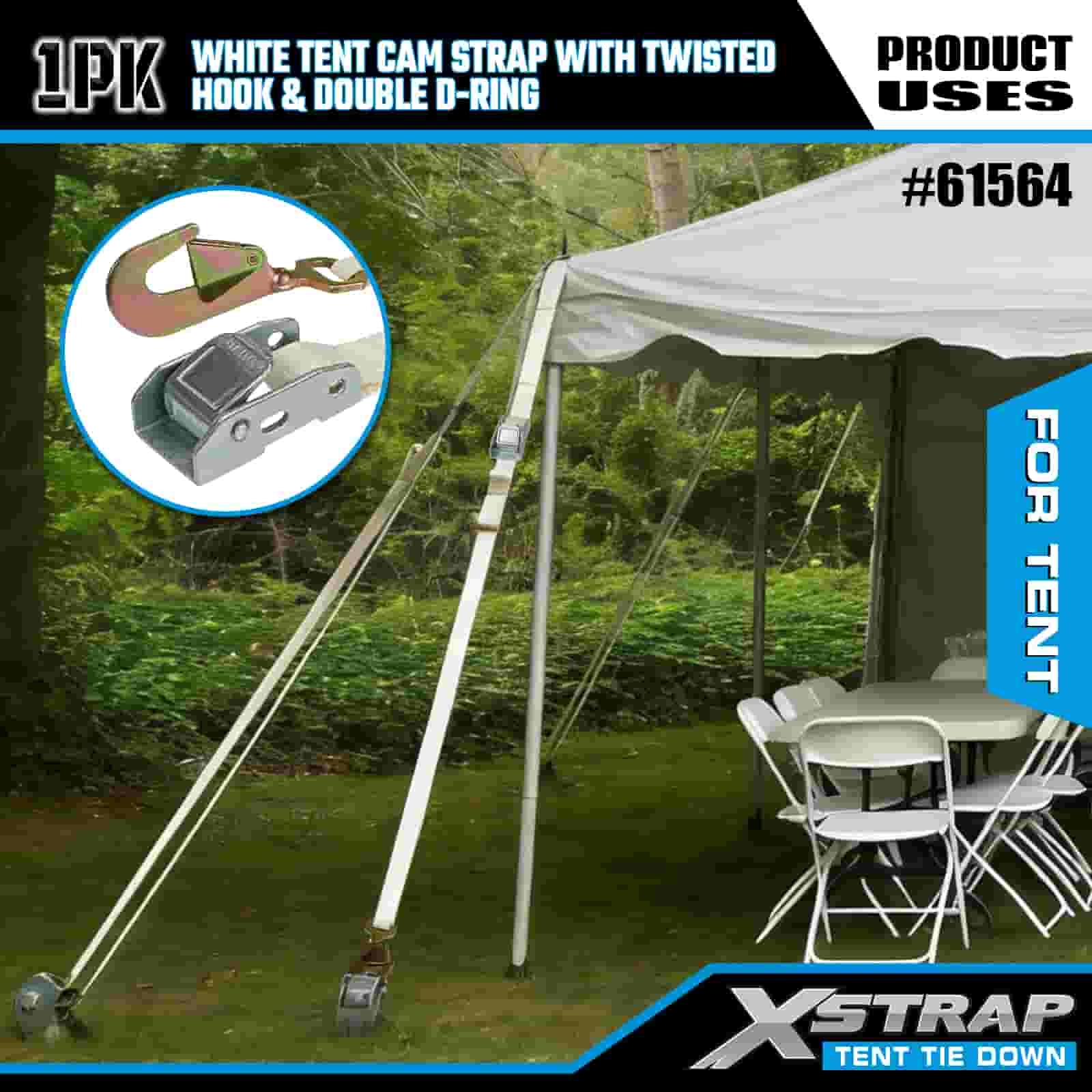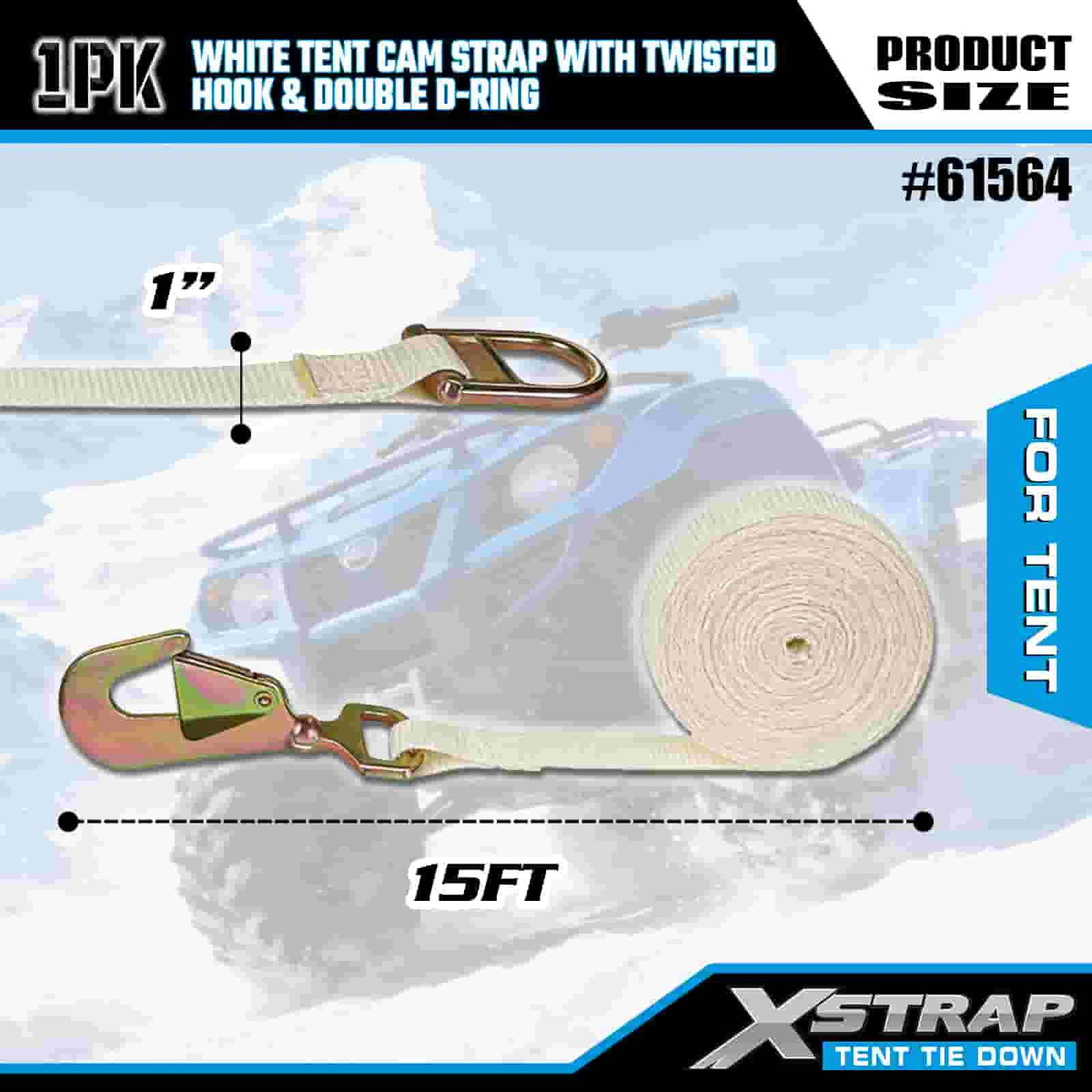 1” x 15' White Tent Cam Strap with Twisted Hook and Double D Ring