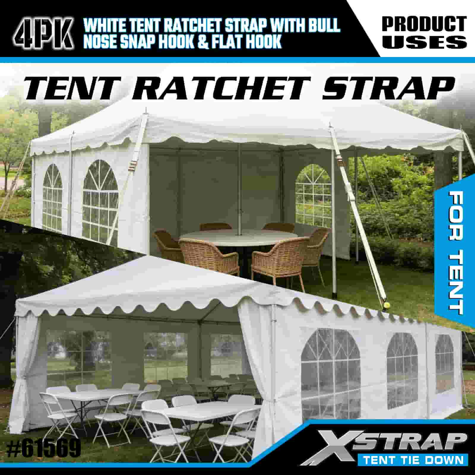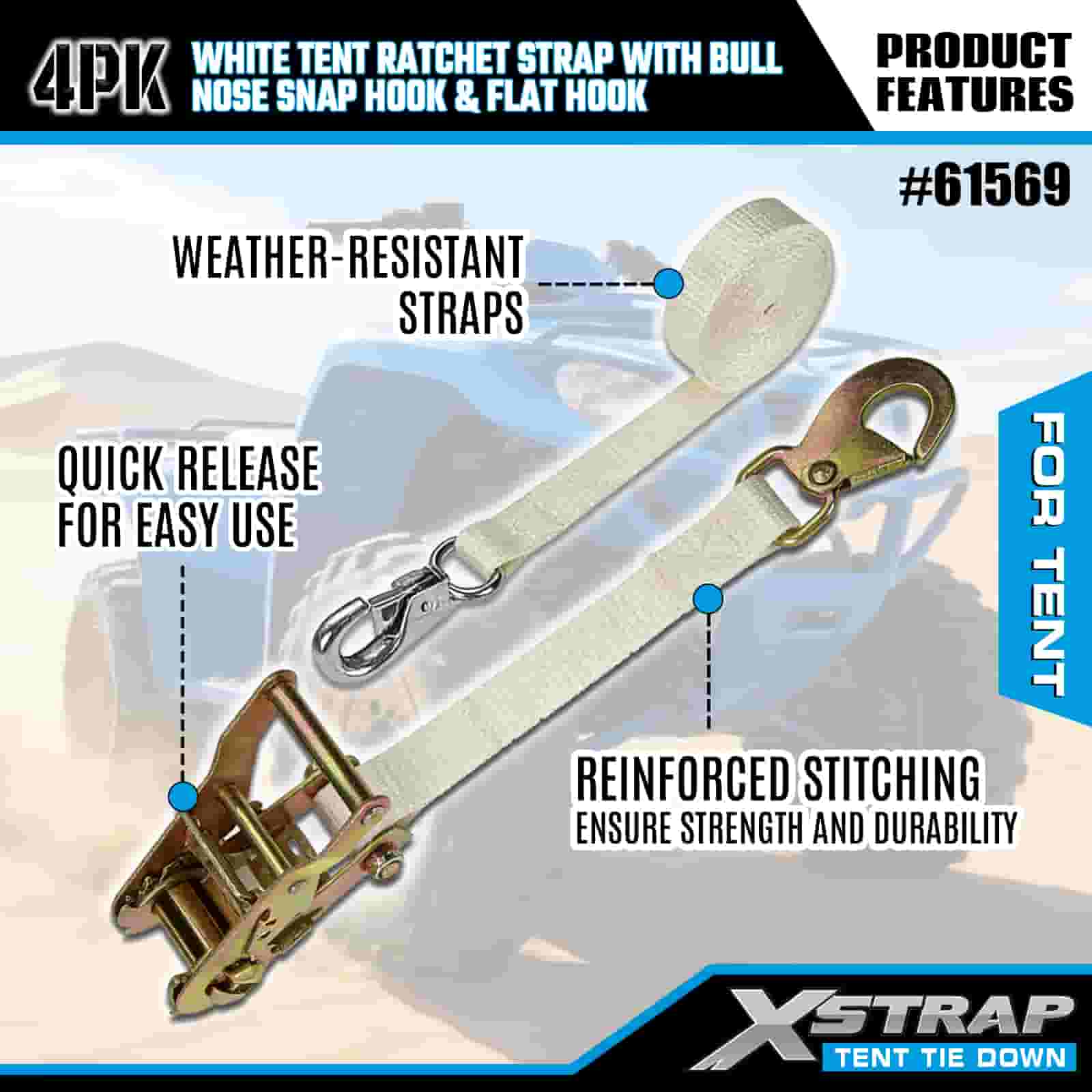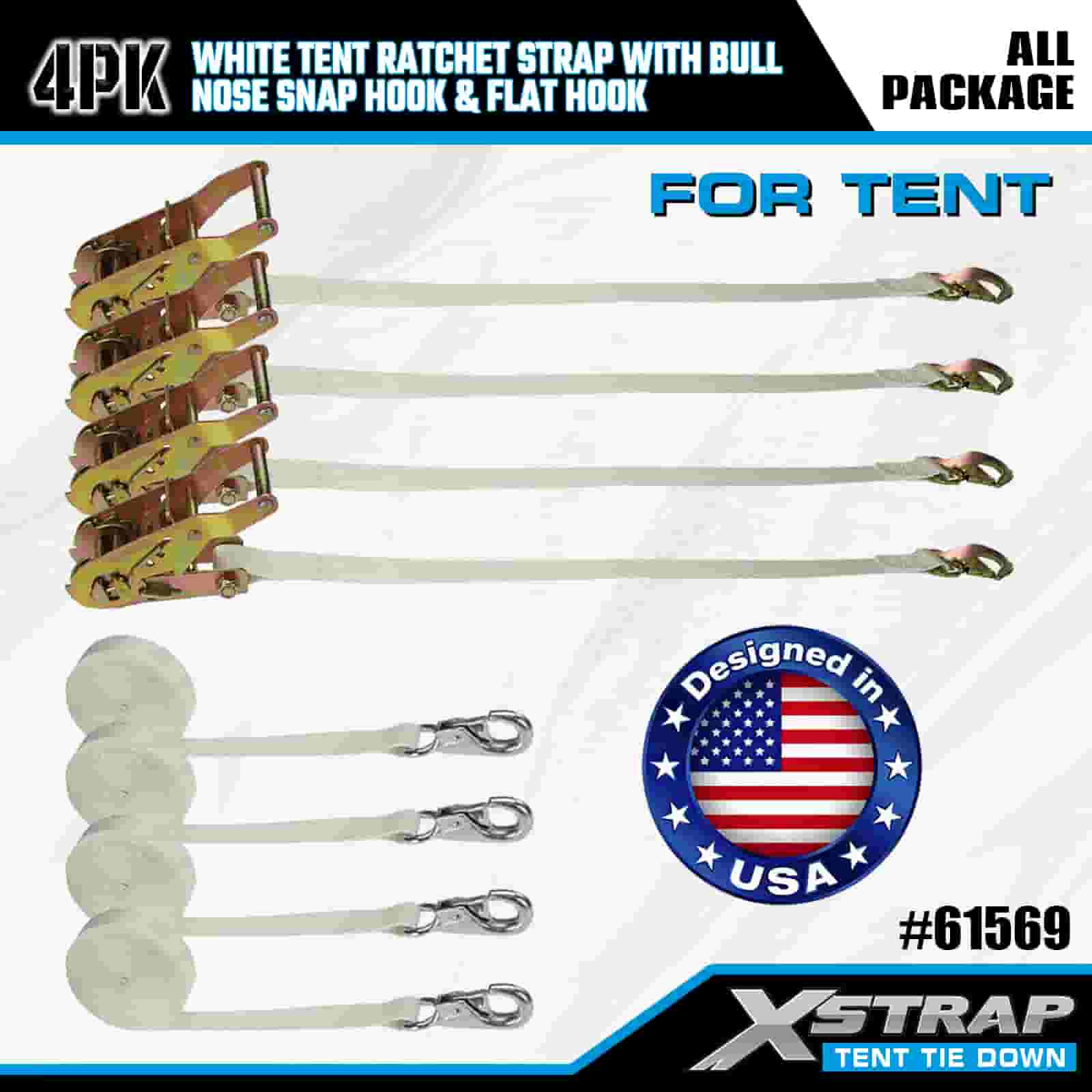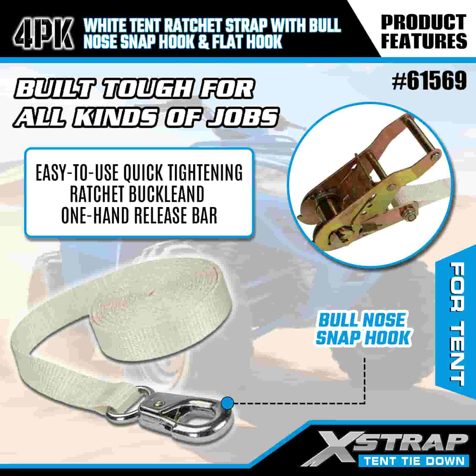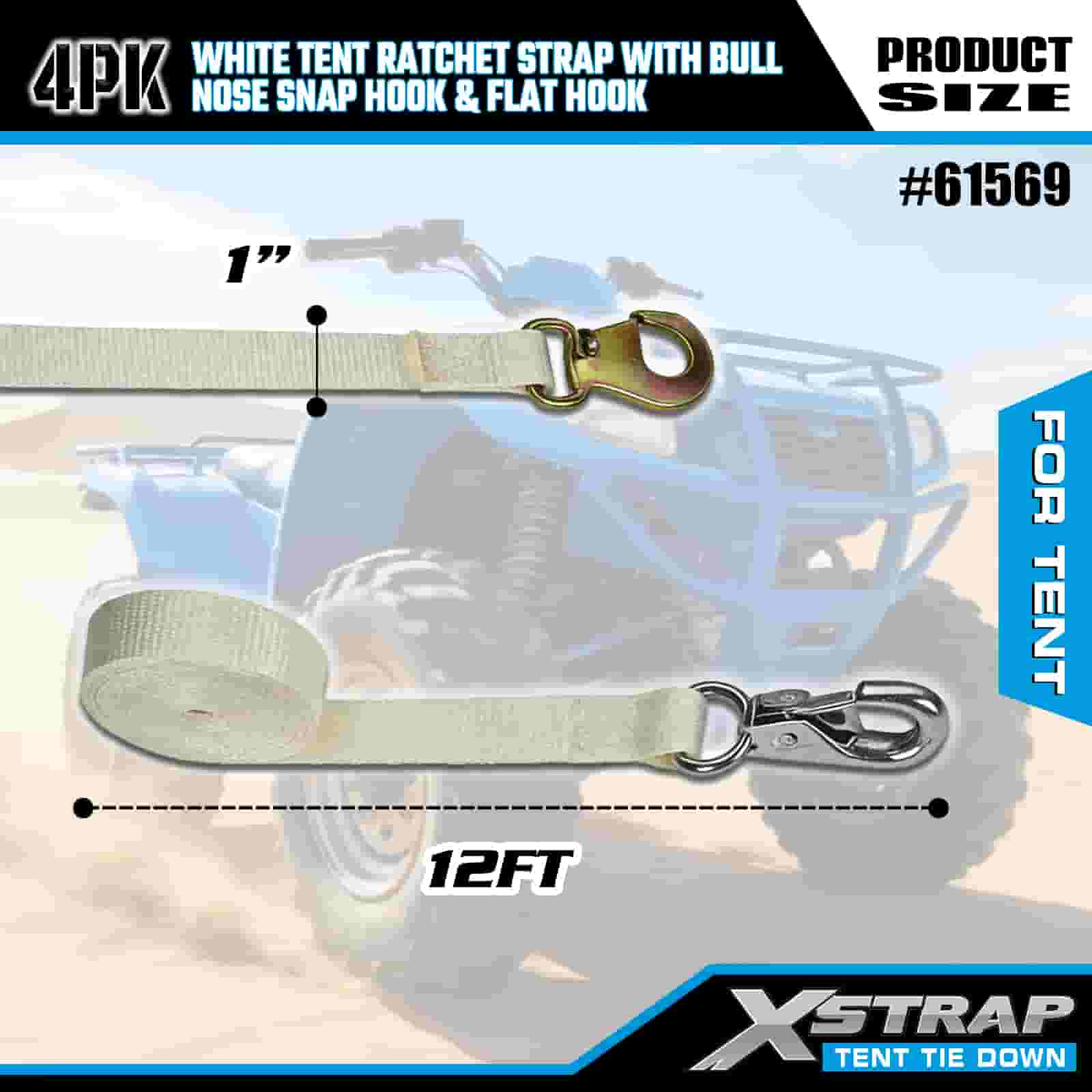 Xstrap 4PK White Tentationis Ratchet Strap cum Bulla Nose Snap Hook et Flat Hook, 1" x 12' Polyester ligare Strap Ratchet Strap, 1100lbs Capacitas Cargo Lashing Securing Straps with Nose Snap Hook and Flat Hook for Cargo Control, tent fixation.