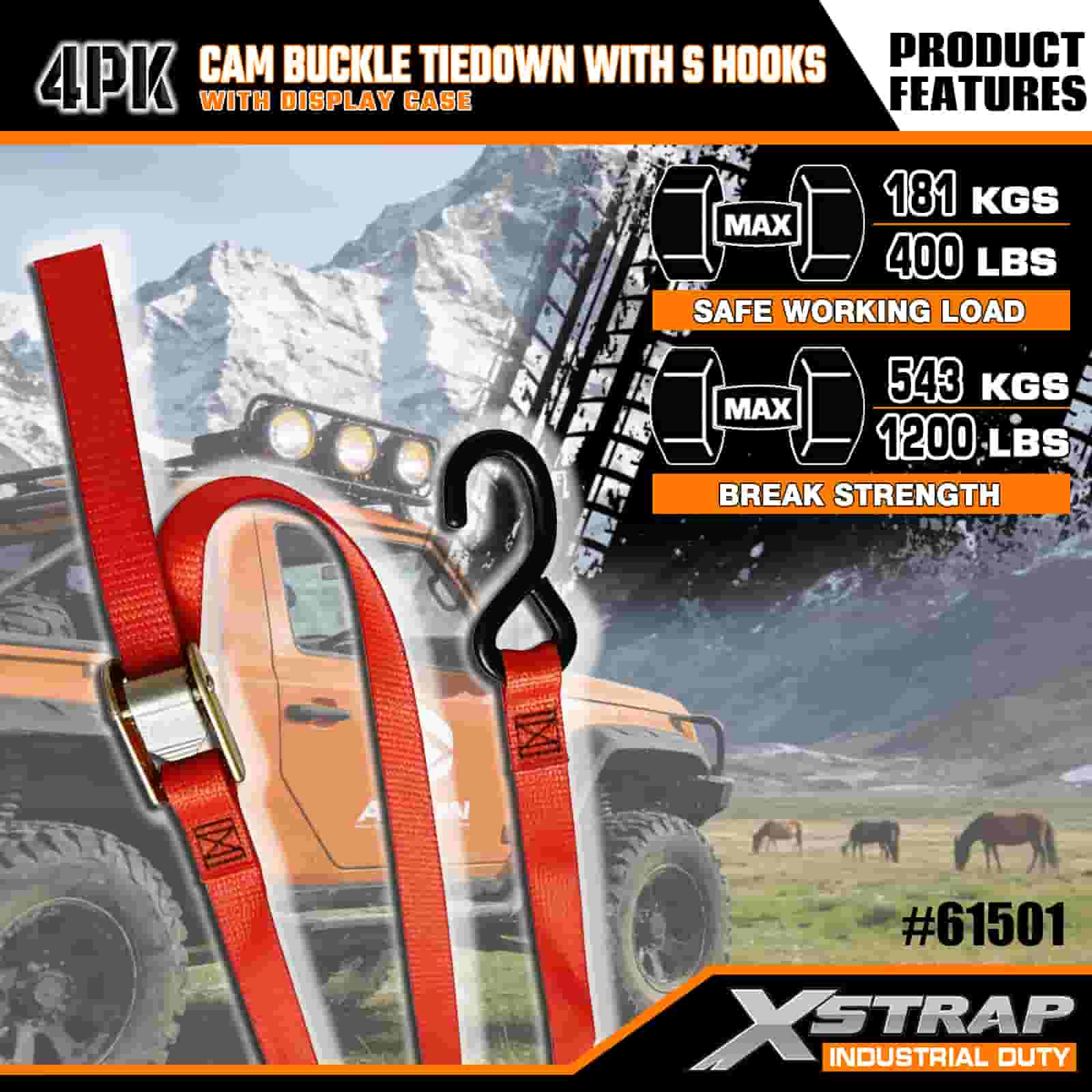 Xstrap 4 Pack Cam Buckle Tie Down with S Hooks, 2" x 6' Polyester ligare Strap cum Cam Buckle, 400lbs Capacitas Cargo Lashing Securing Straps cum S Hooks pro Serious Professional to Secure Cargo Trailer, Flat Bed Trailer, Ski Boat, Small Car.