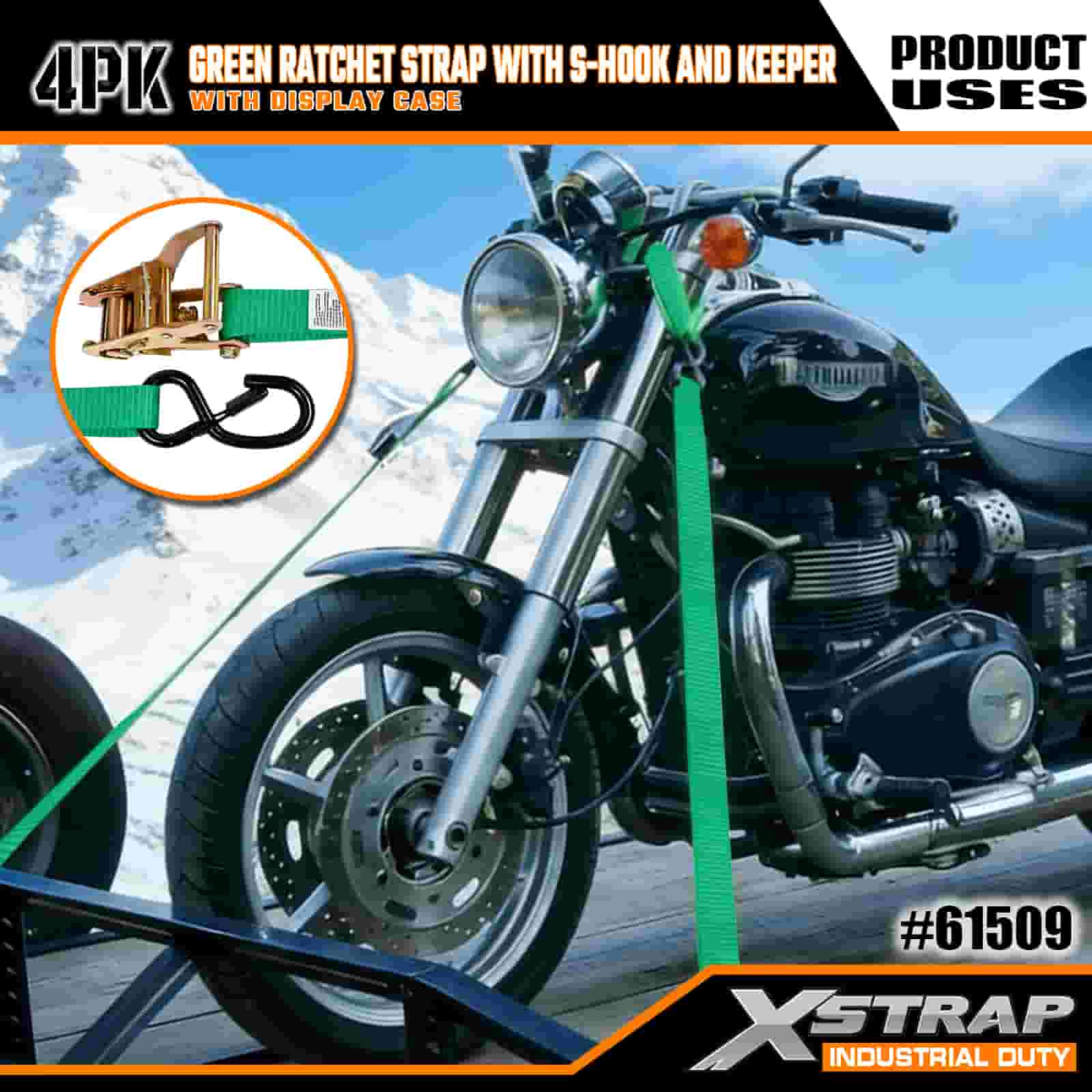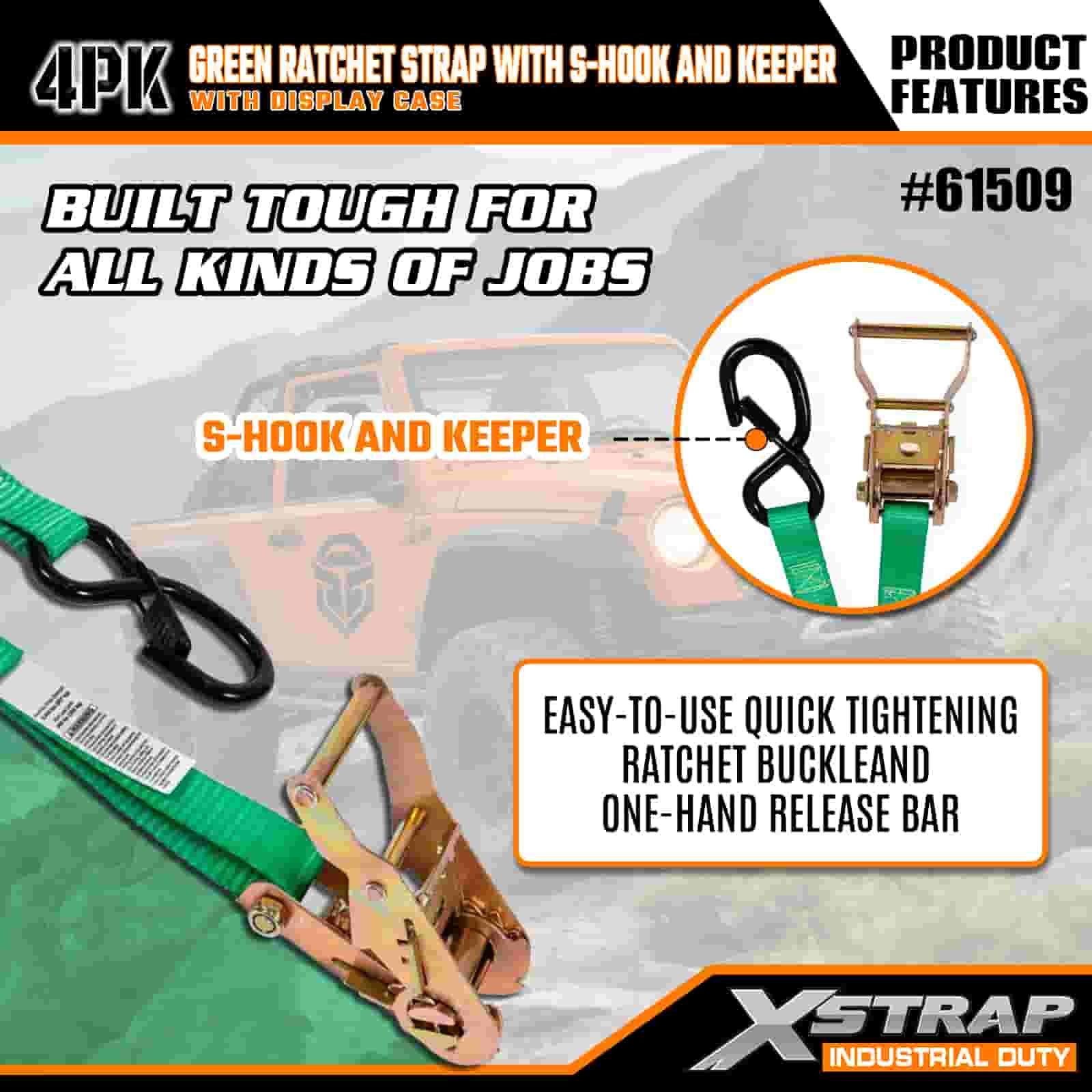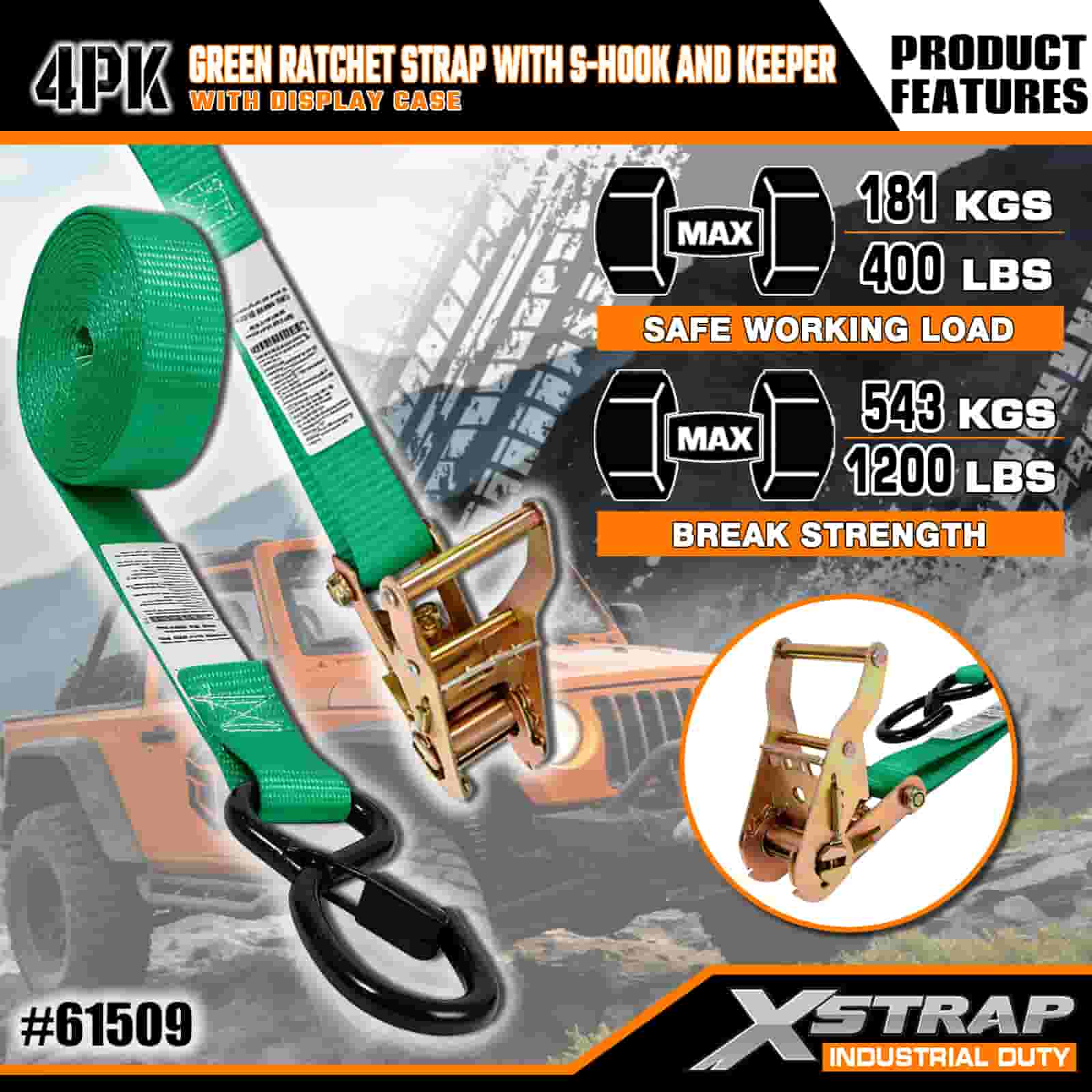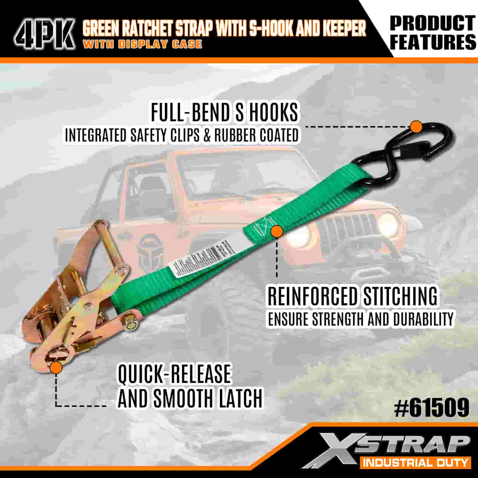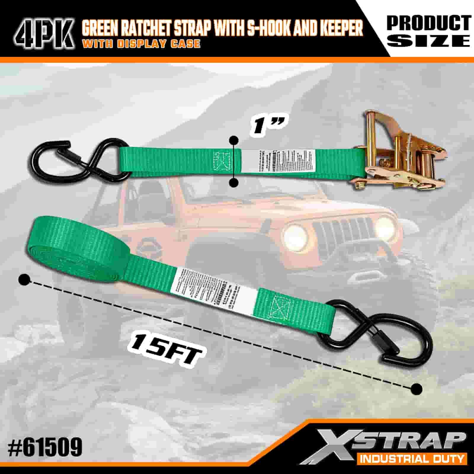 Xstrap 4 Pack Ratchet Strap with Safety S Hooks, 1" x 15' Polyester ligare Strap Pull Ratchet Strap, 400lbs Capacitas Cargo Lashing Securing Straps with Safety S Hooks for the Serious Professional to Secure Cargo Trailer, Flat Bed Trailer, Ski Boat, Small Car.