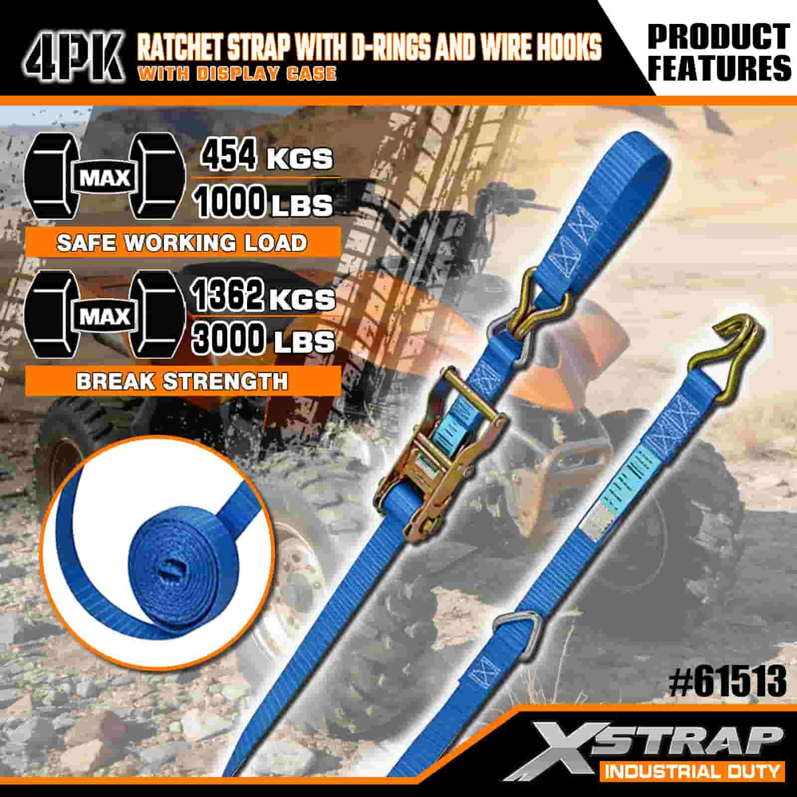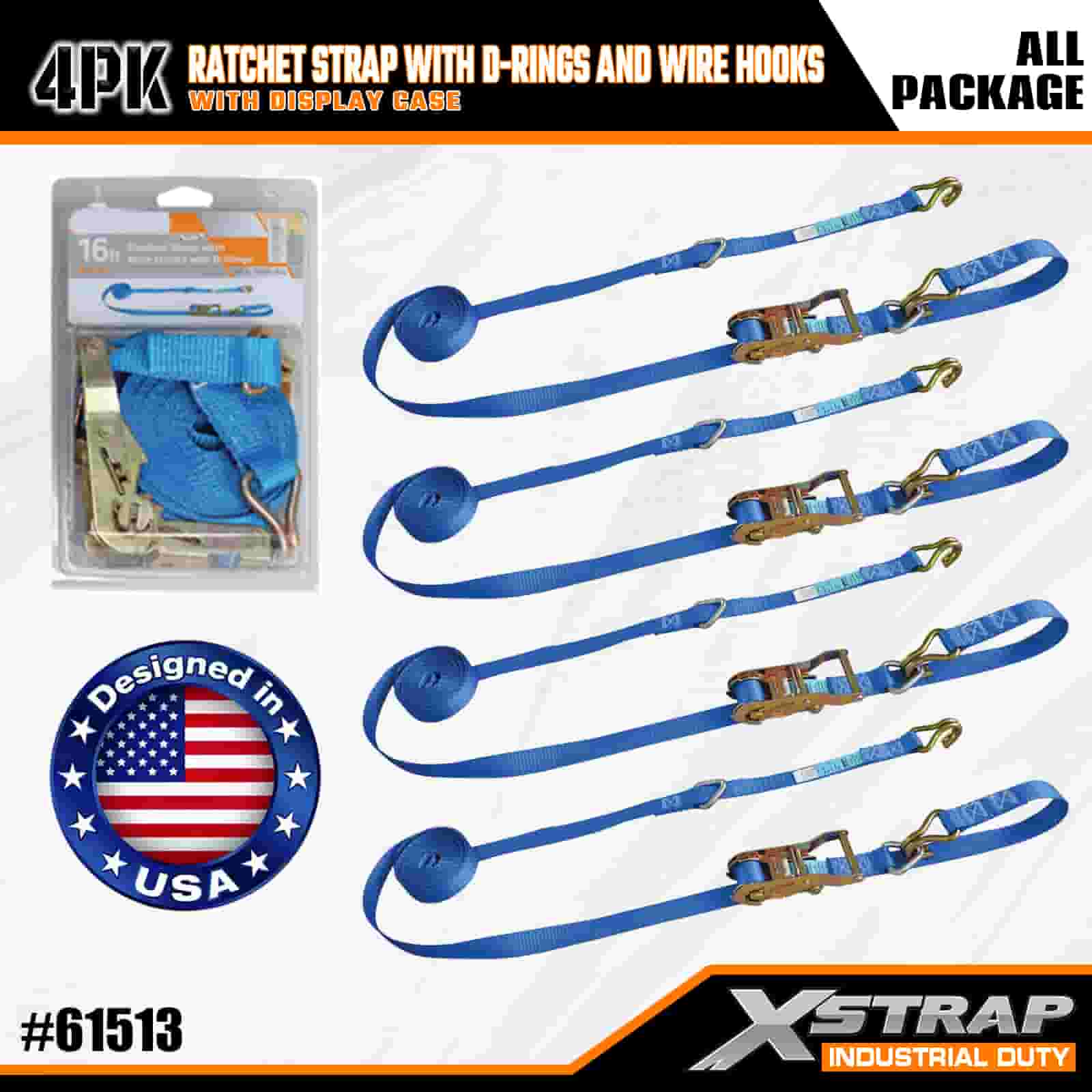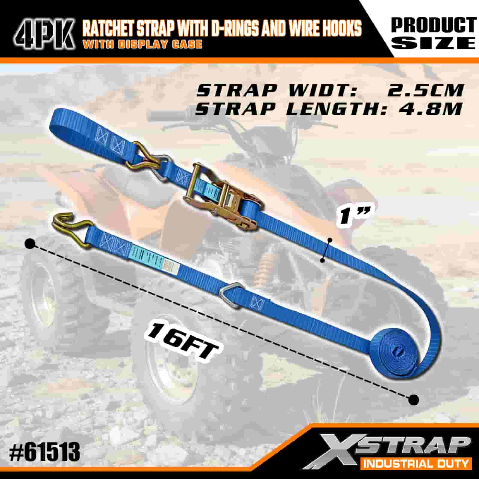 Xstrap 4 Pack Ratchet Strap cum D Annulis et Wire Hooks, 1" x 16' Polyester ligamen Strap Pull Ratchet Strap, 1000lbs capacitas Cargo Lashing Securing Straps with Wire Hooks for the Serious Professional to Secure Cargo Trailer, Flat Bed Trailer, Ski Boat, Small Car.