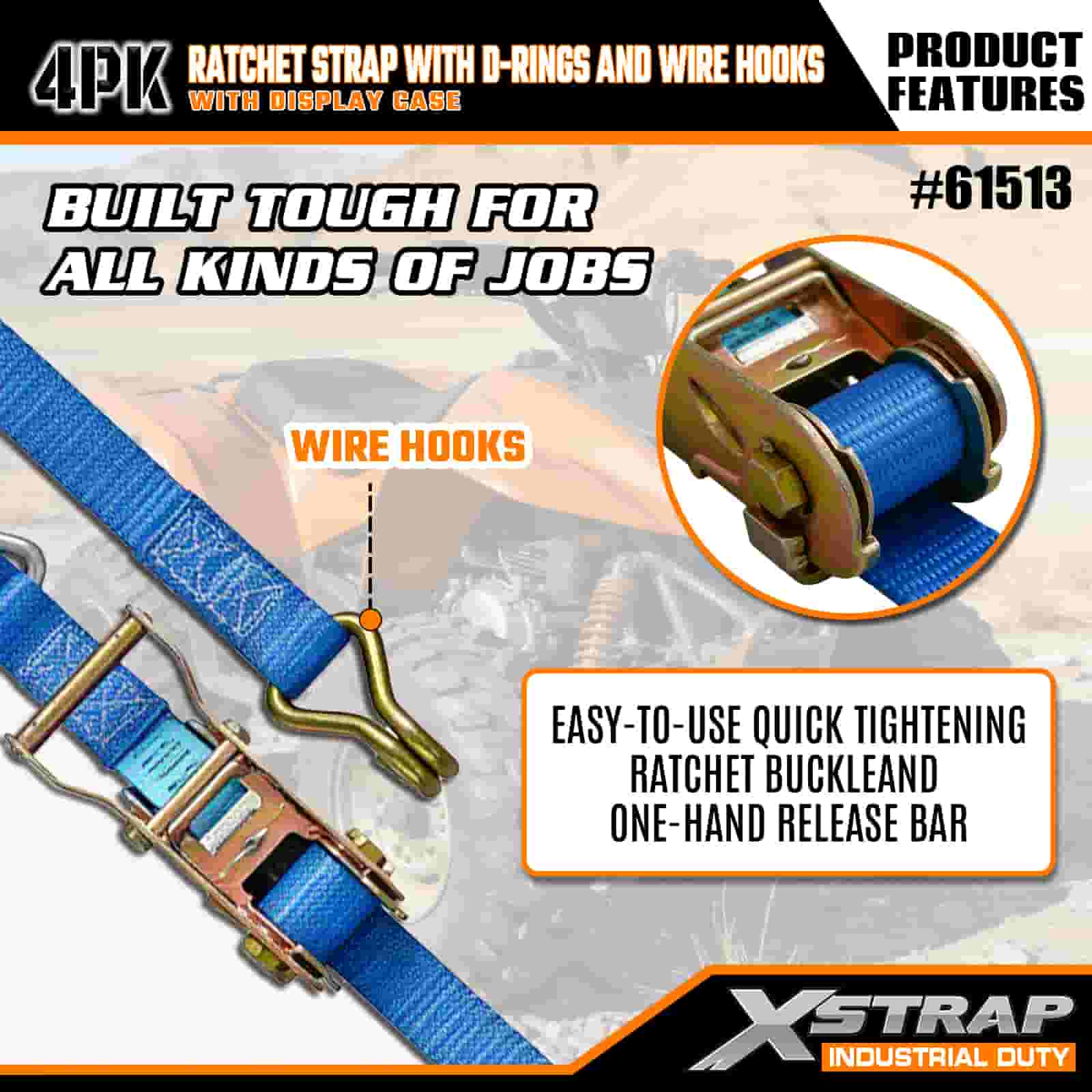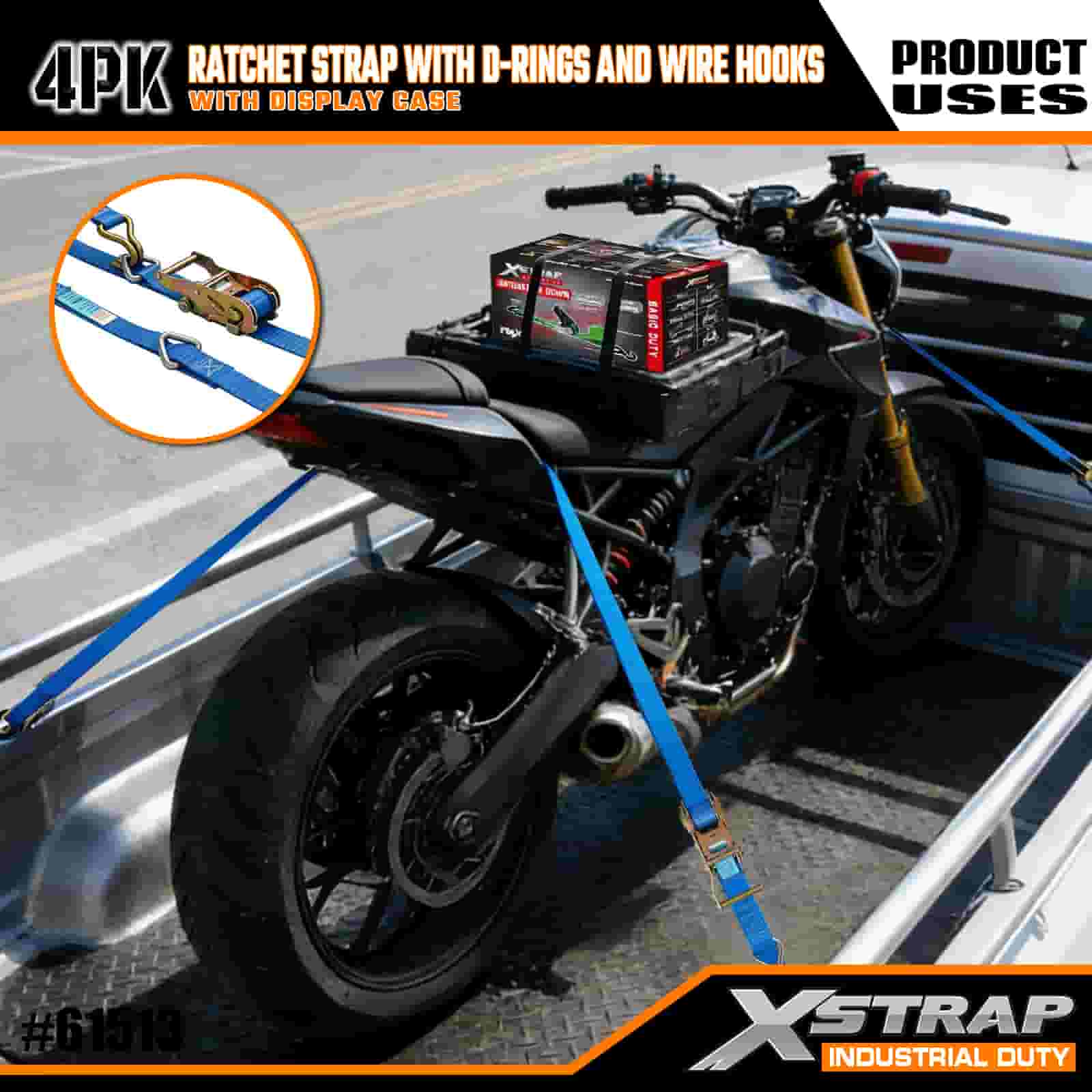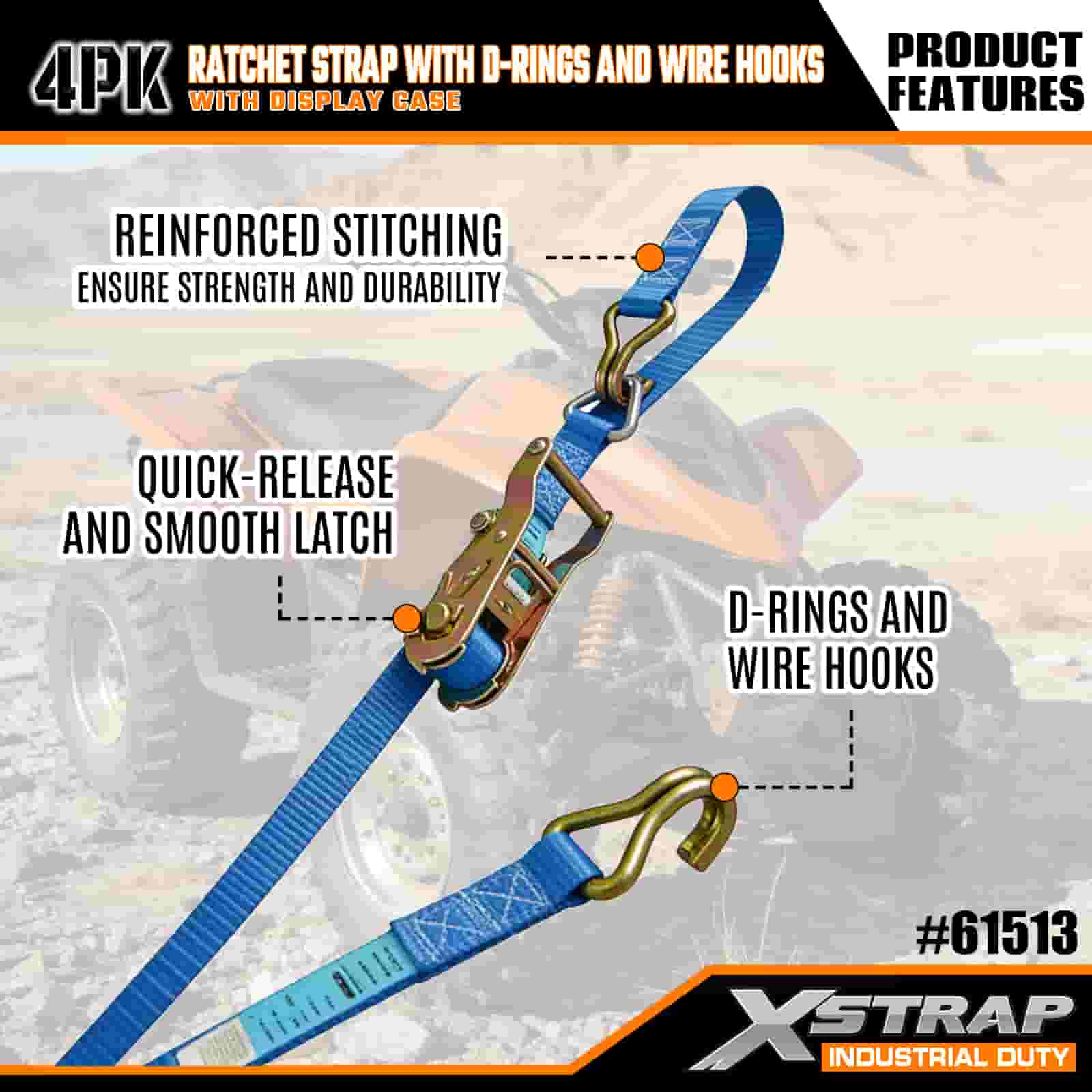 Xstrap 4 Pack Ratchet Strap cum D Annulis et Wire Hooks, 1" x 16' Polyester ligamen Strap Pull Ratchet Strap, 1000lbs capacitas Cargo Lashing Securing Straps with Wire Hooks for the Serious Professional to Secure Cargo Trailer, Flat Bed Trailer, Ski Boat, Small Car.