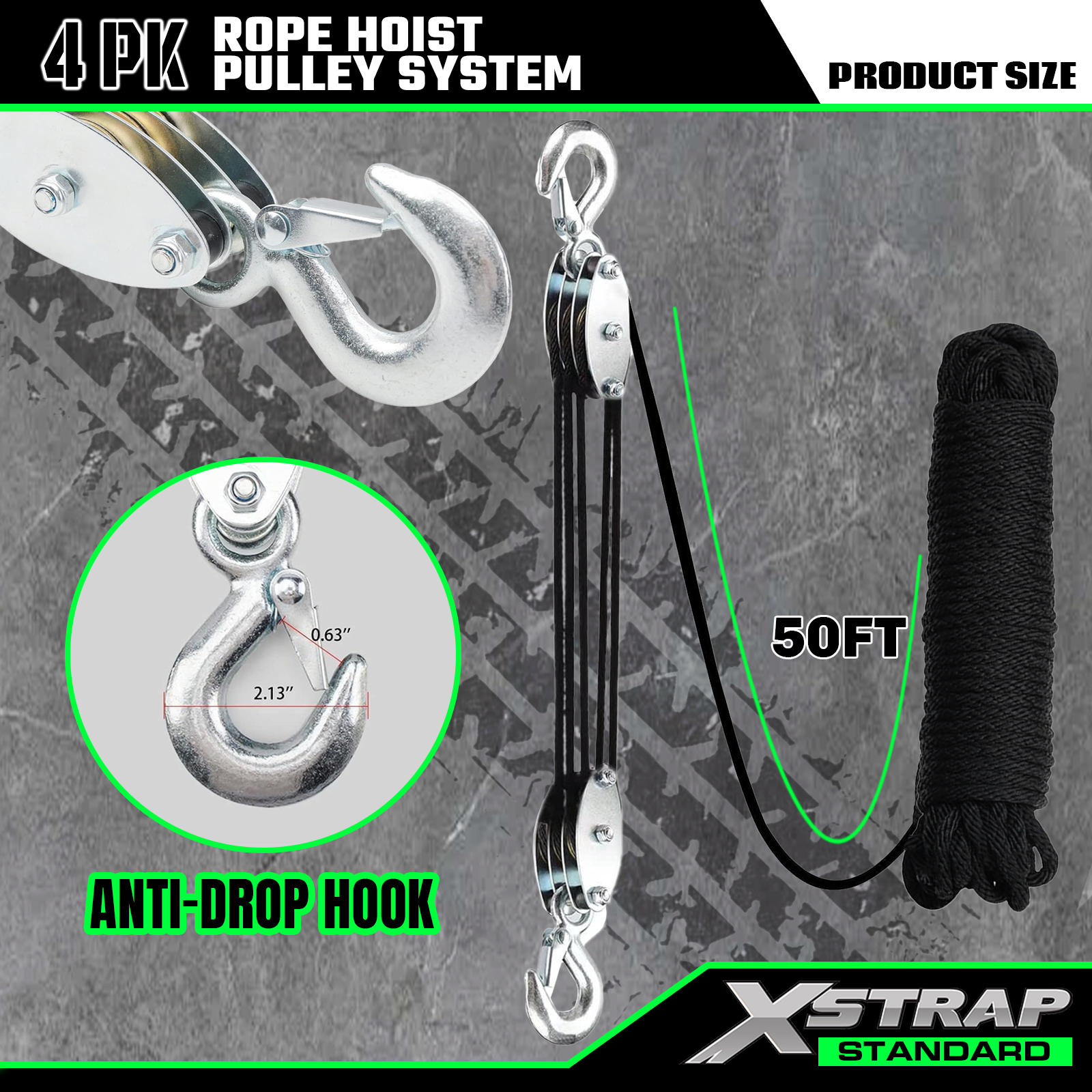 Hoc est Xstrap Standard Funis Hoist Pulley System. Facultas 1000lbs est, frangendi vires 2000lbs est. 5:1 Elevatio potentiae 50ft Gravis Officium Pulley Clausus pro Venatione, elevatio Gravia cum Anti-Slip Opus Gloves, 2pcs Mollis Loops.