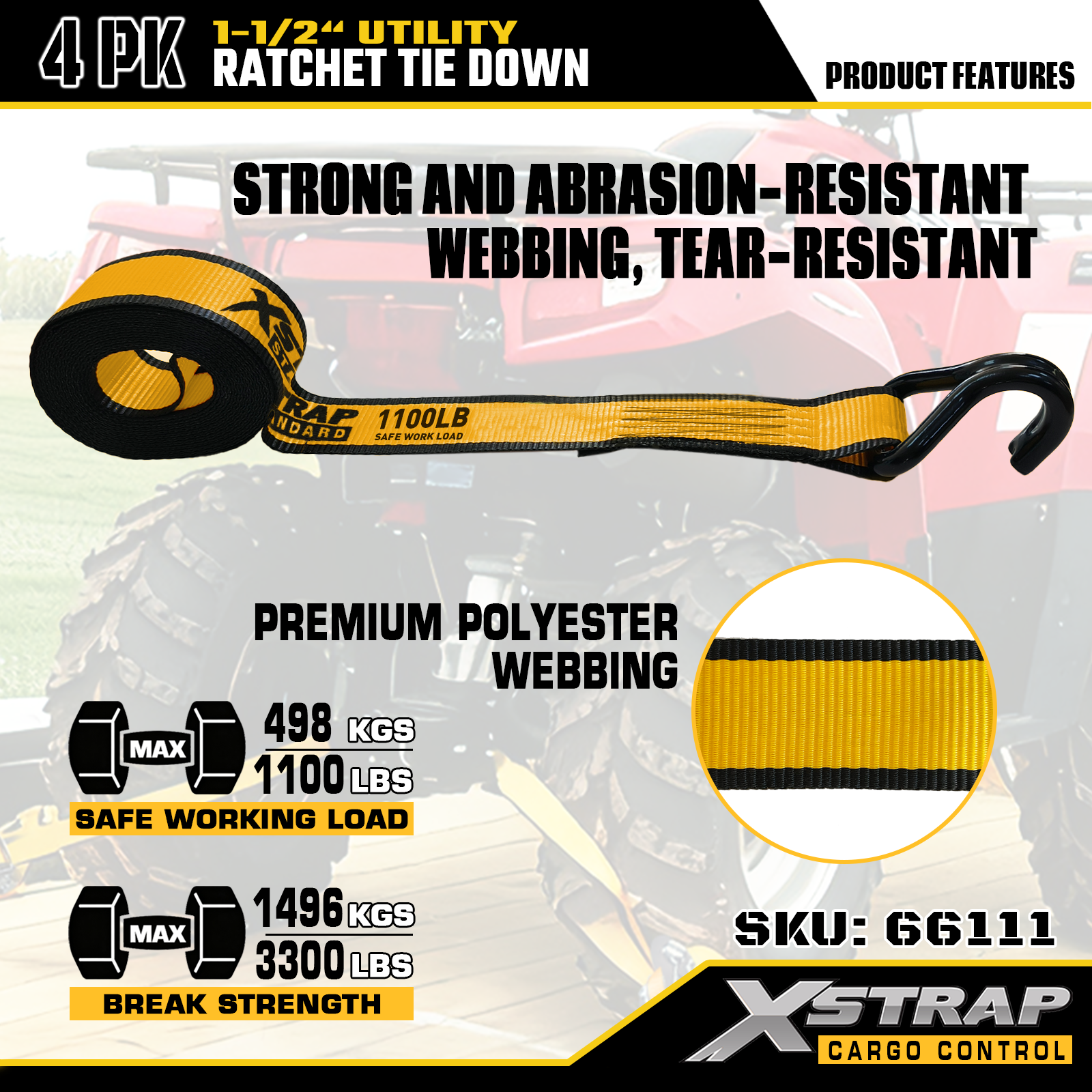 Xstrap T-tractum Ratchet Ligo Down est 1.5 digiti x 16ft, opus onus tutum 1,100lbs est et virium fractio 3,300lbs est.