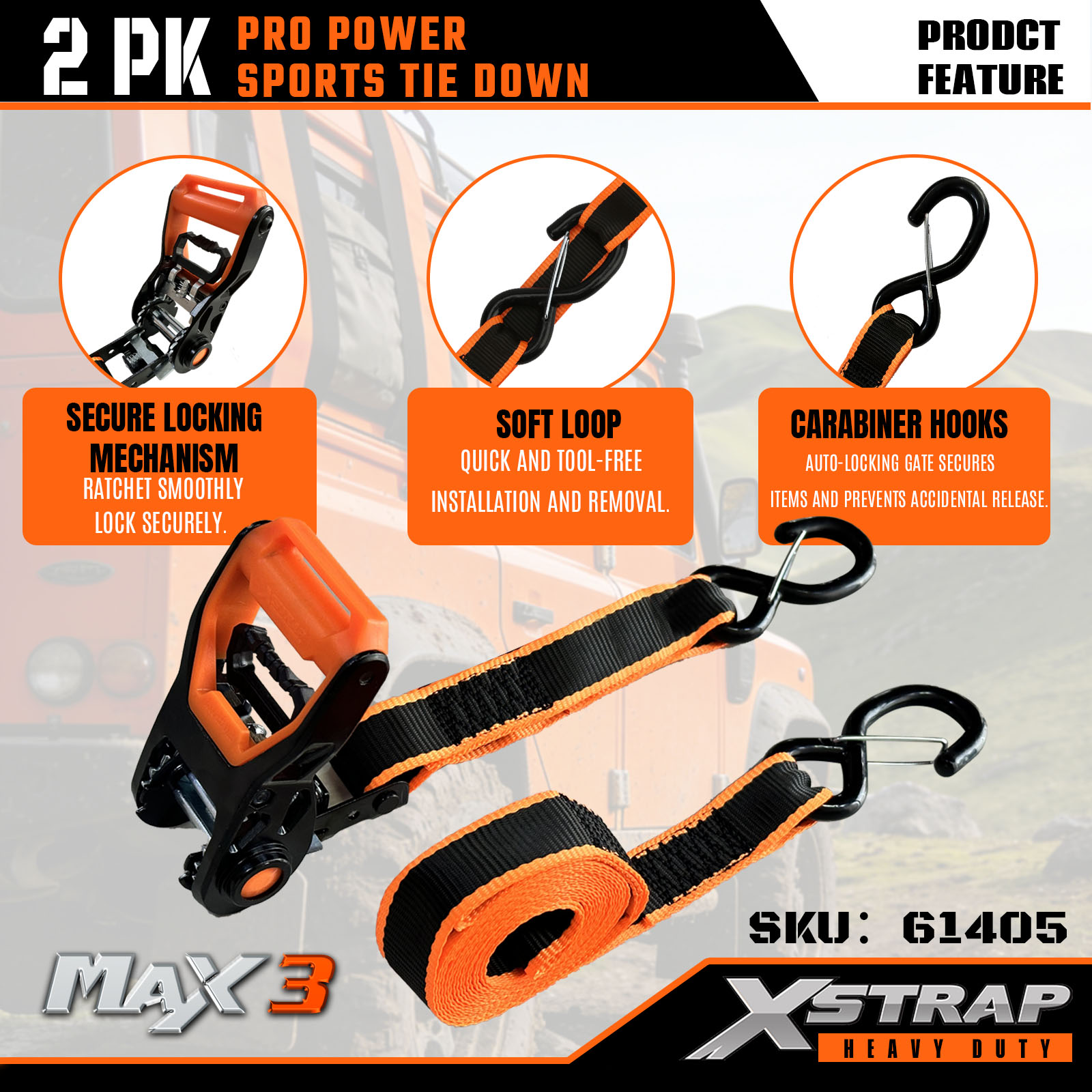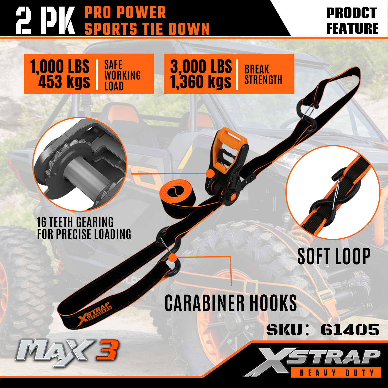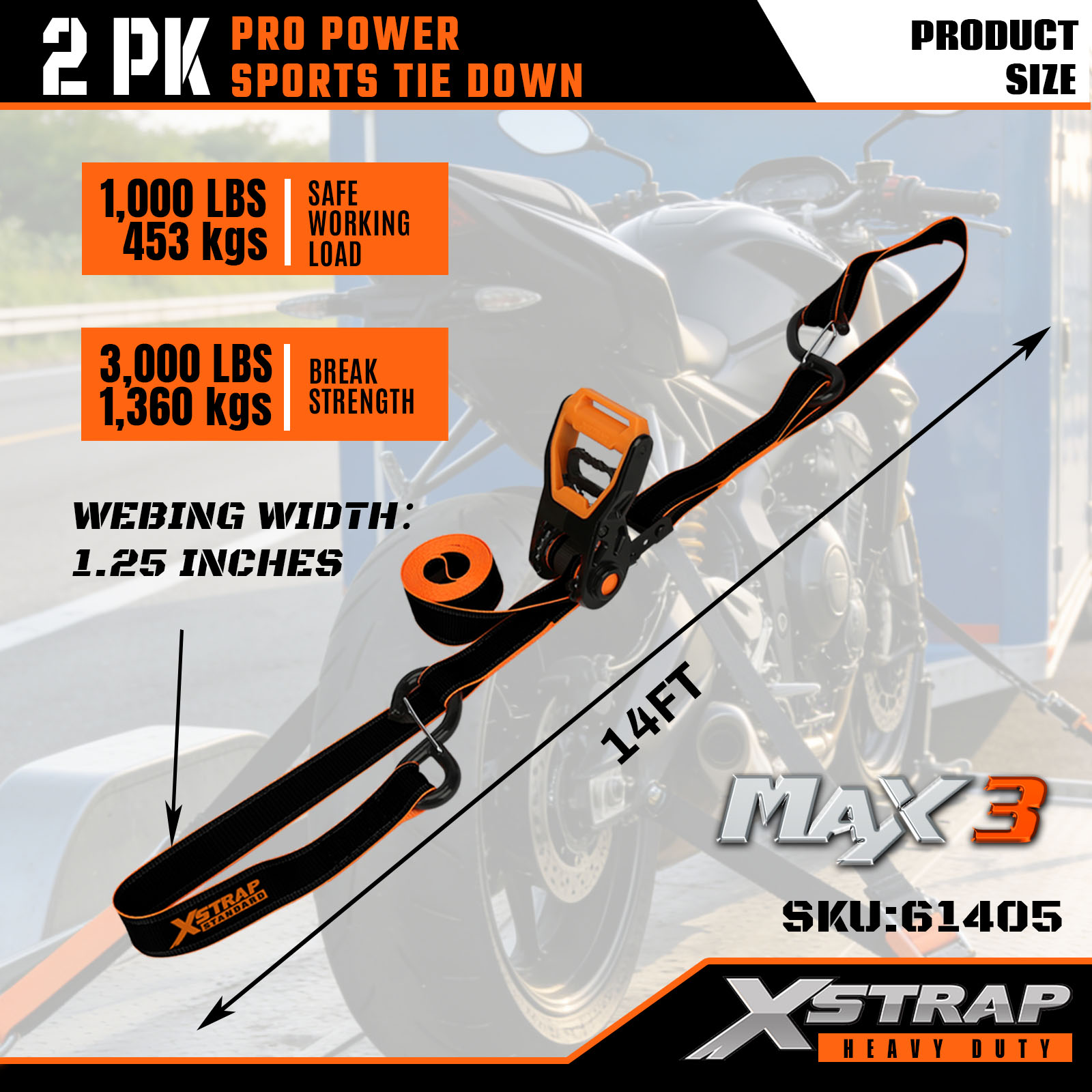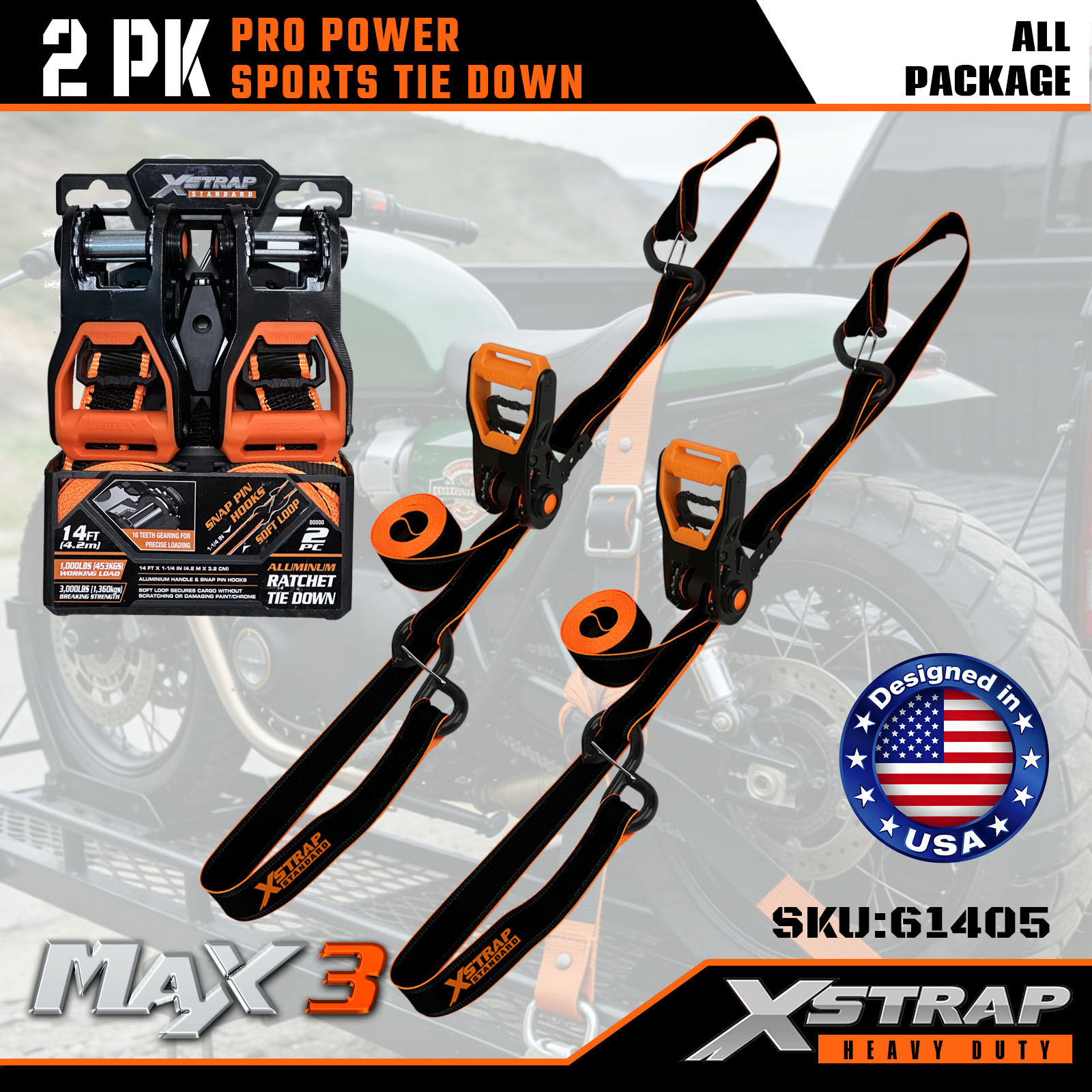 Xstrap 2 Sarcina PRO POTESTATE LUSTRUM Vinculum Straps, 1-1/4" x 14' Polyester ligamen Strap Traho Ratchet Strap, 1000lbs Capacitas Cargo Lashing Securus Straps cum CArabineris Hooks pro Truck, SUV, Car Top Racks Motorcycle.