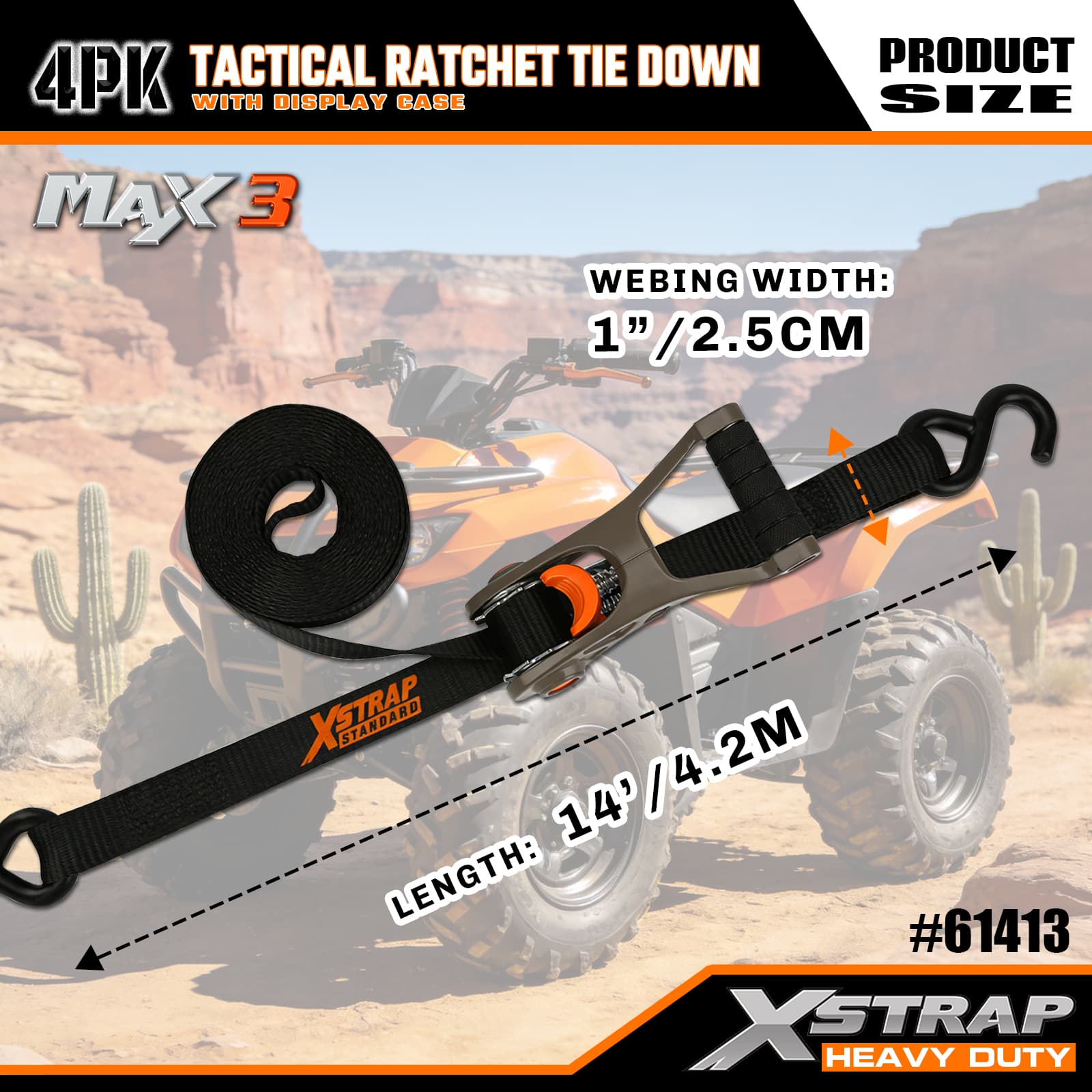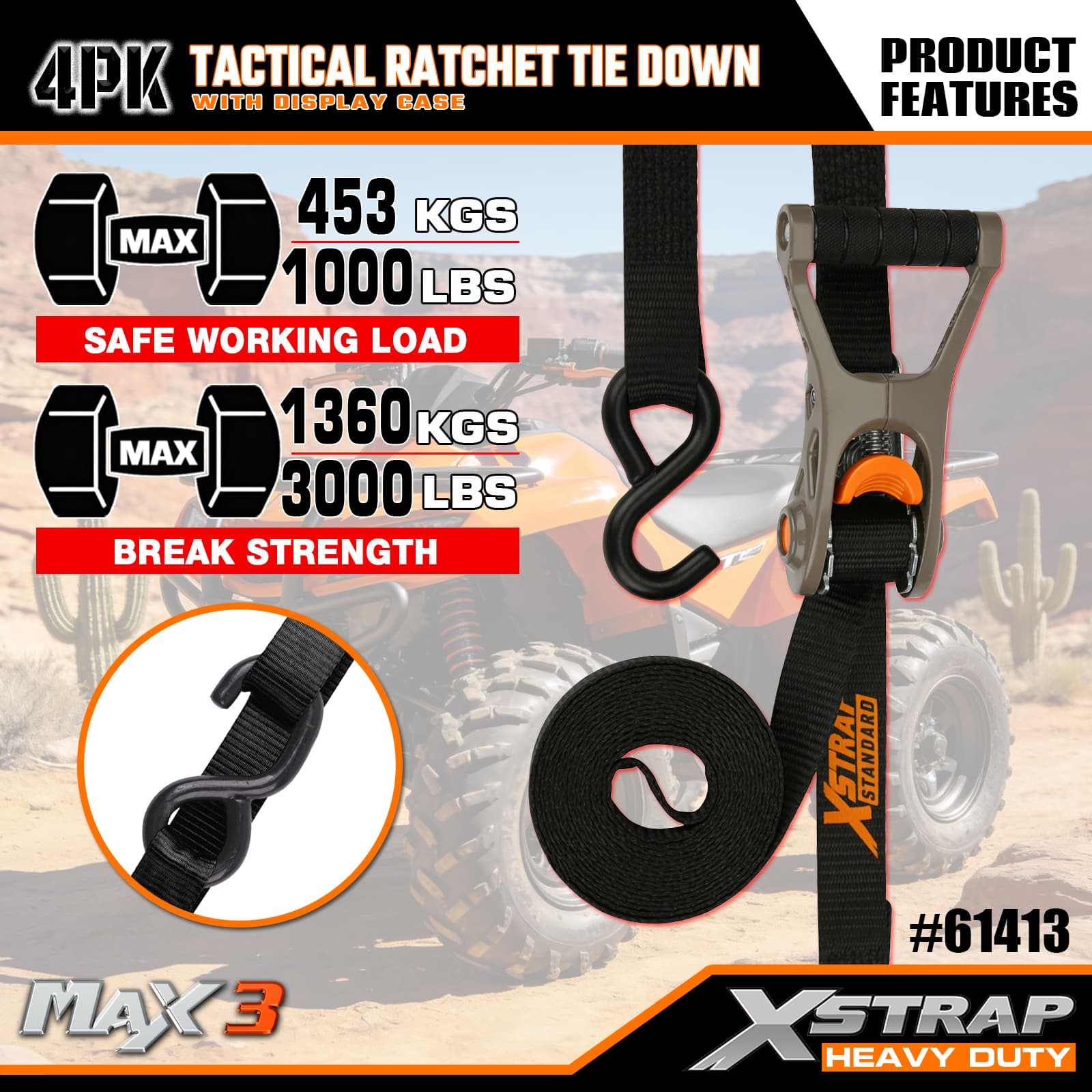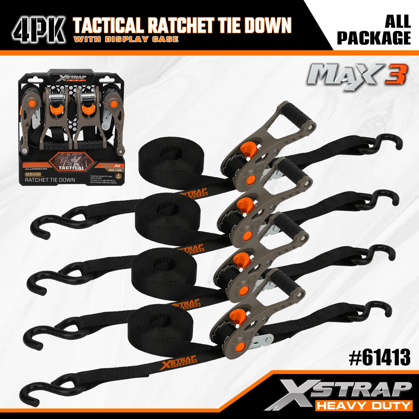 Xstrap 4 Packt Tactical Ratchet Constringe cum mollis Loop, 1" x 14 Polyester Coram stringe Strap trahes Ratchet strap, 1000lbs Capacitas Cargo Lashing Astra securis cum Huncis pro Truck, SUV, Car Top Racks Motorcycle.