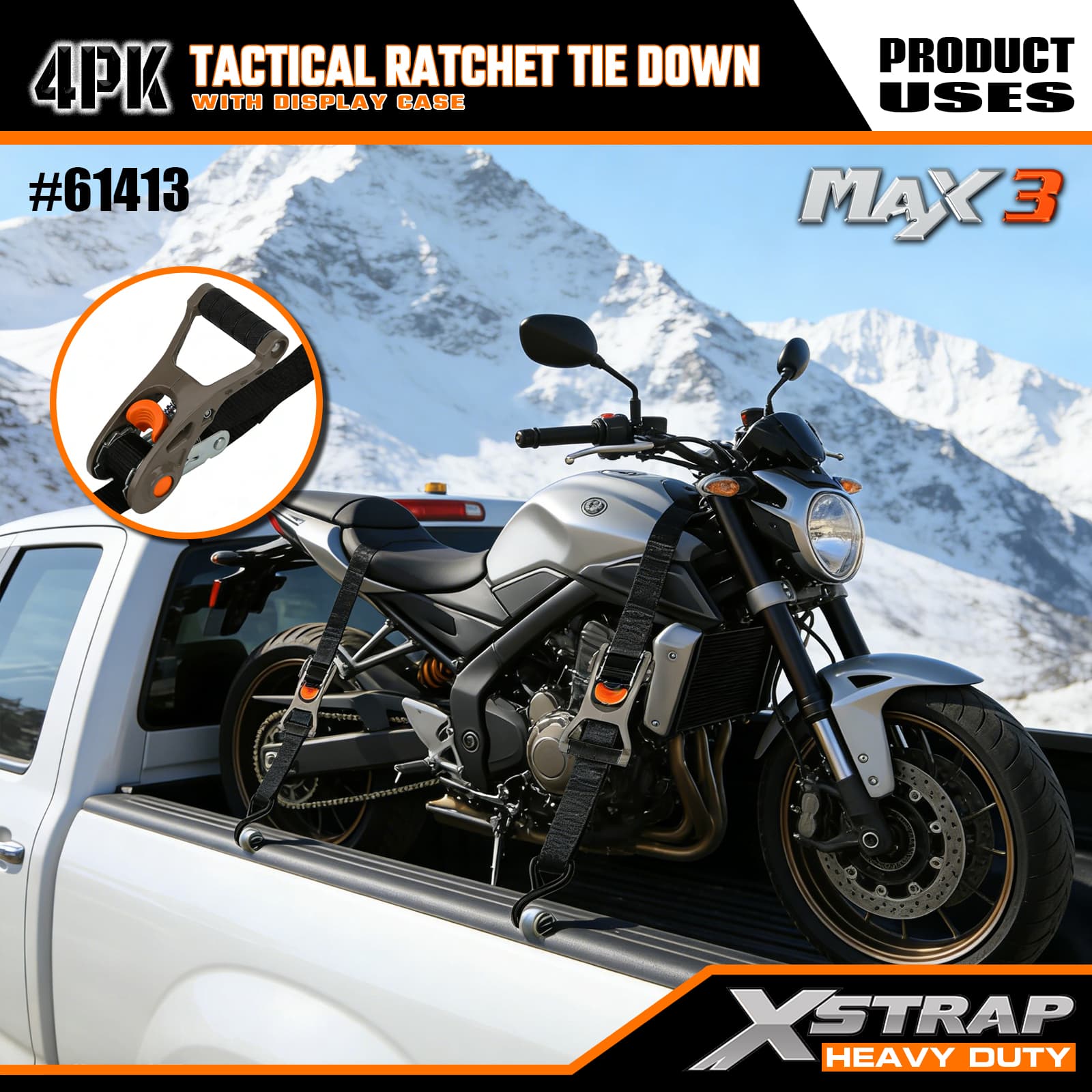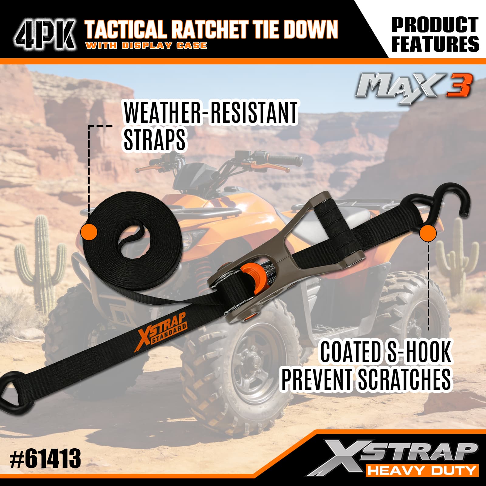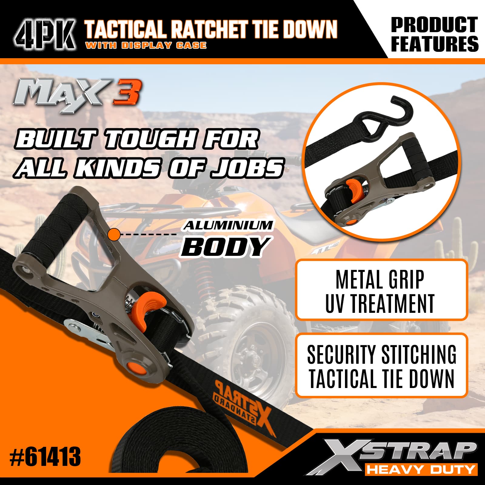 Xstrap 4 Packt Tactical Ratchet Constringe cum mollis Loop, 1" x 14 Polyester Coram stringe Strap trahes Ratchet strap, 1000lbs Capacitas Cargo Lashing Astra securis cum Huncis pro Truck, SUV, Car Top Racks Motorcycle.
