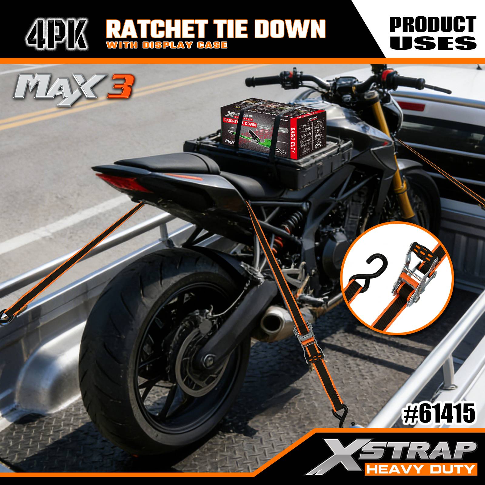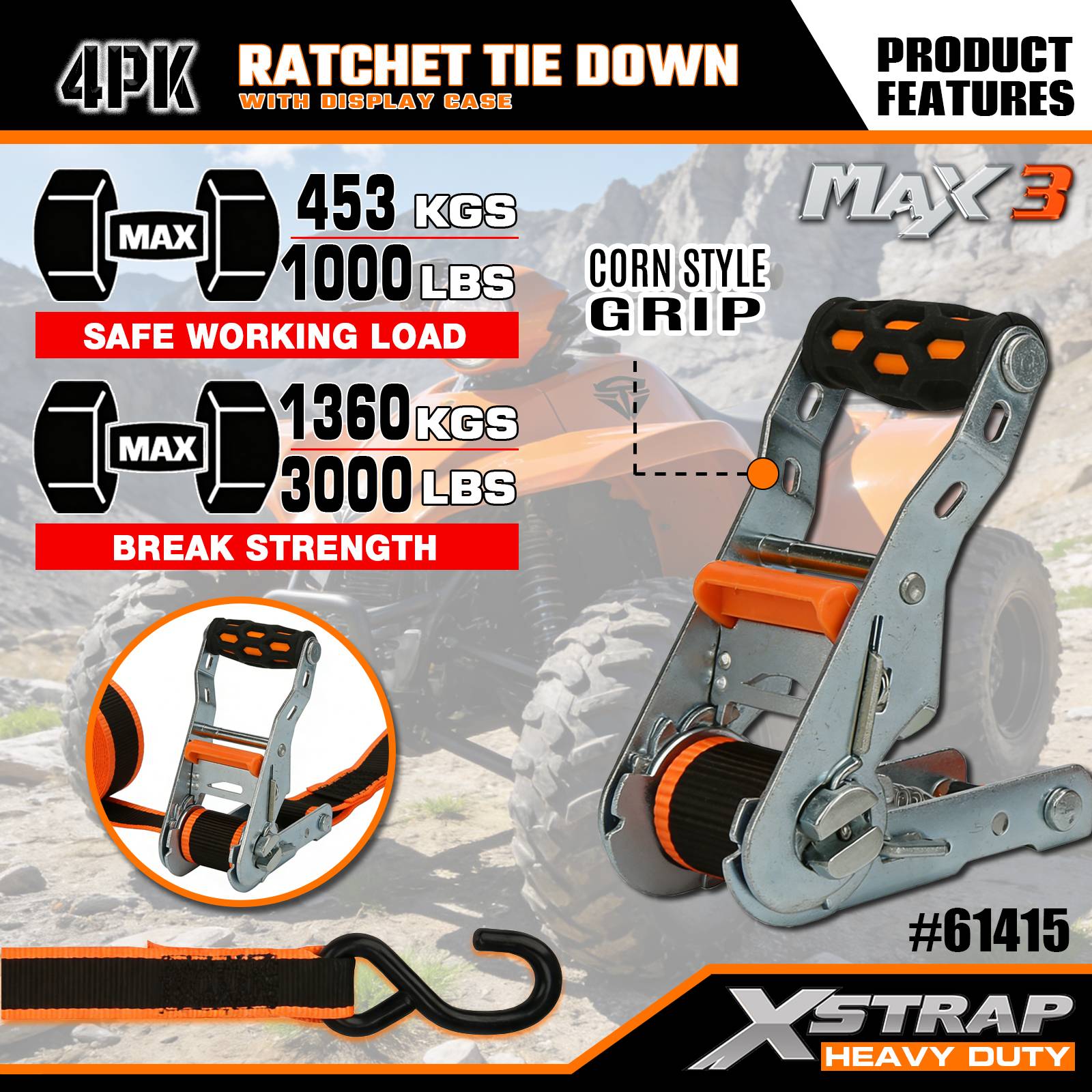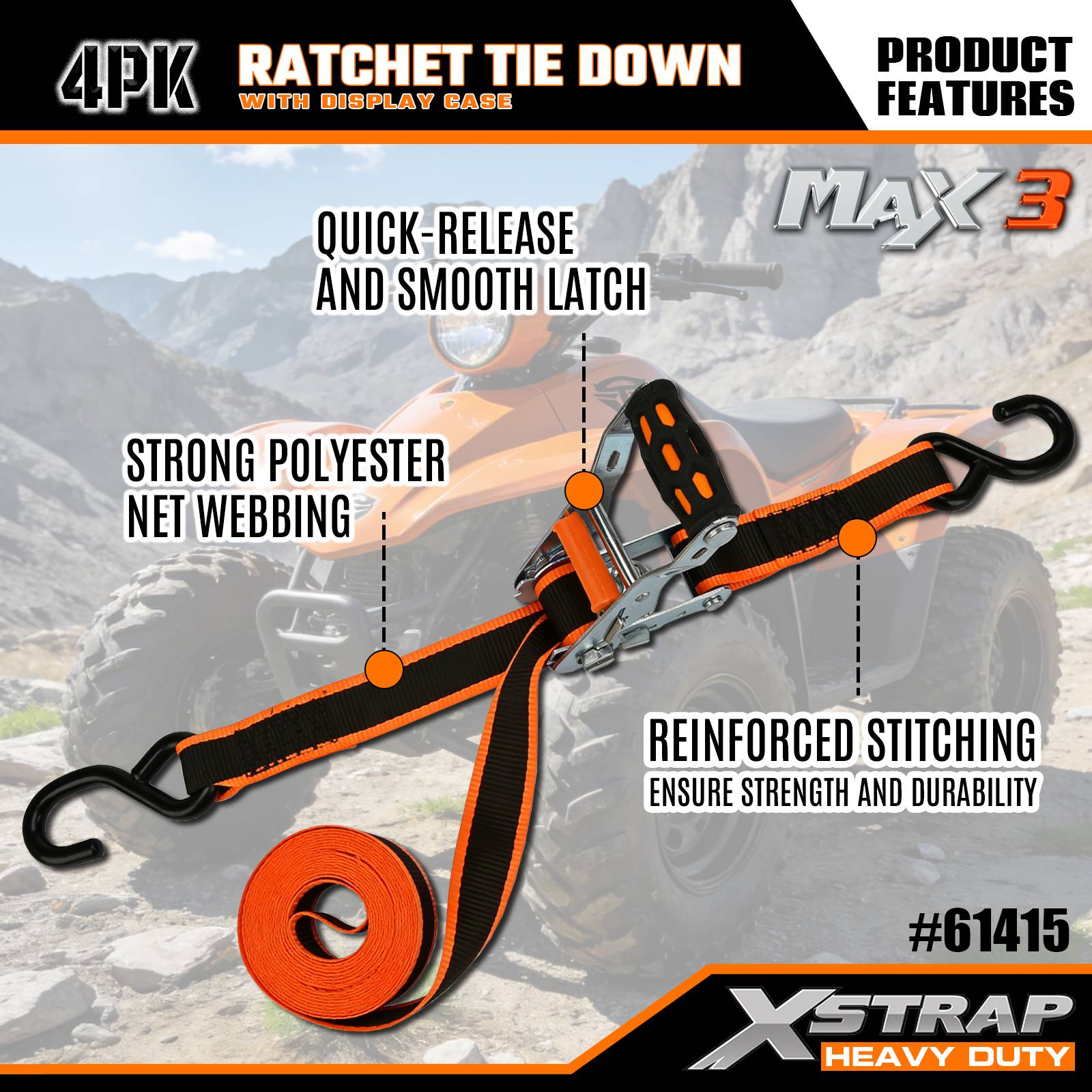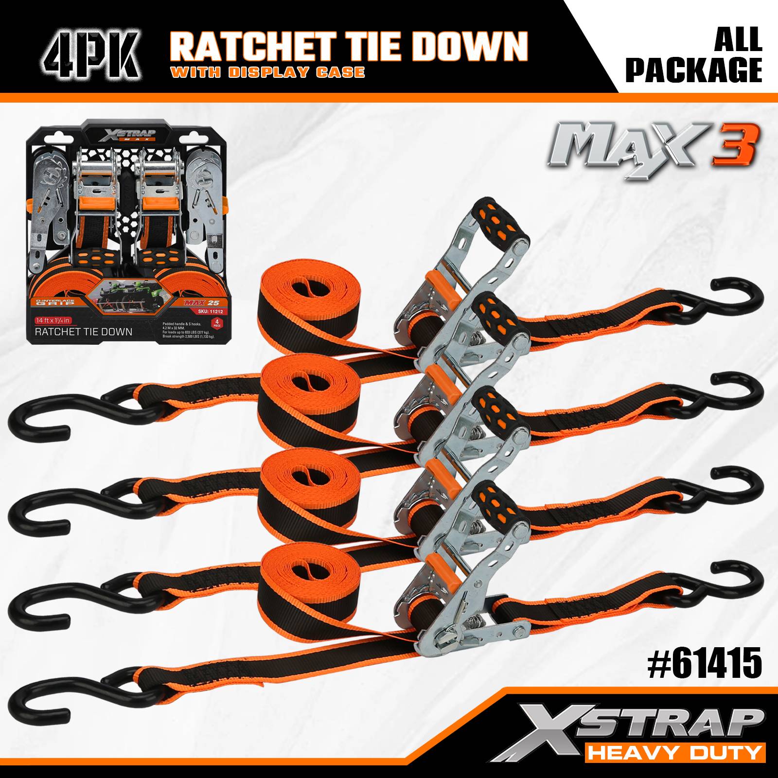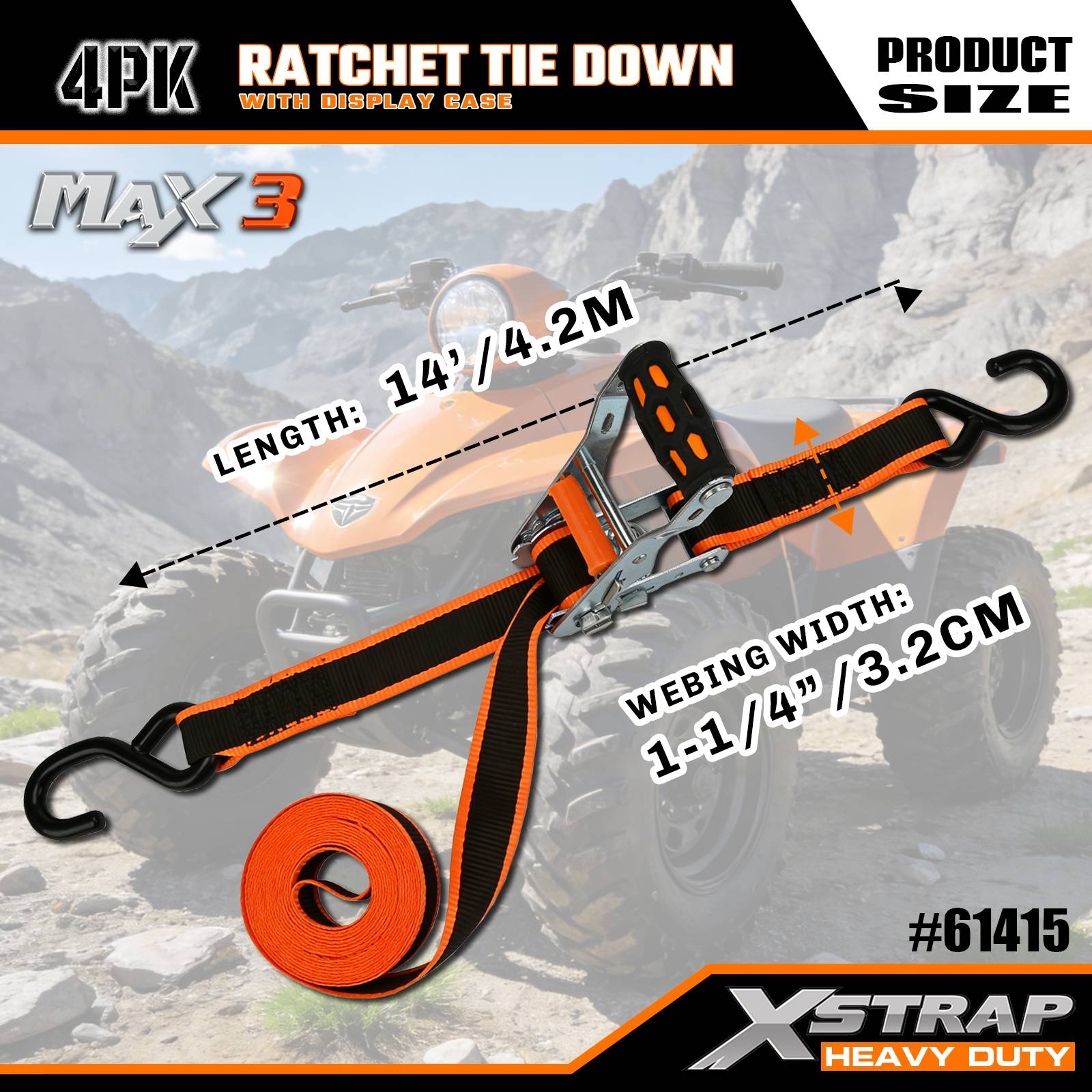 Xstrap 4 Sarcinam Ratchet stringe, 1-1/4" x 14' Polyester ligamen Strap Trahendum Ratchet Strap, 1000lbs Capacitas Cargo Lashing Securus Stragula cum Hooks pro Truck, SUV, Car Top Racks Motorcycle.