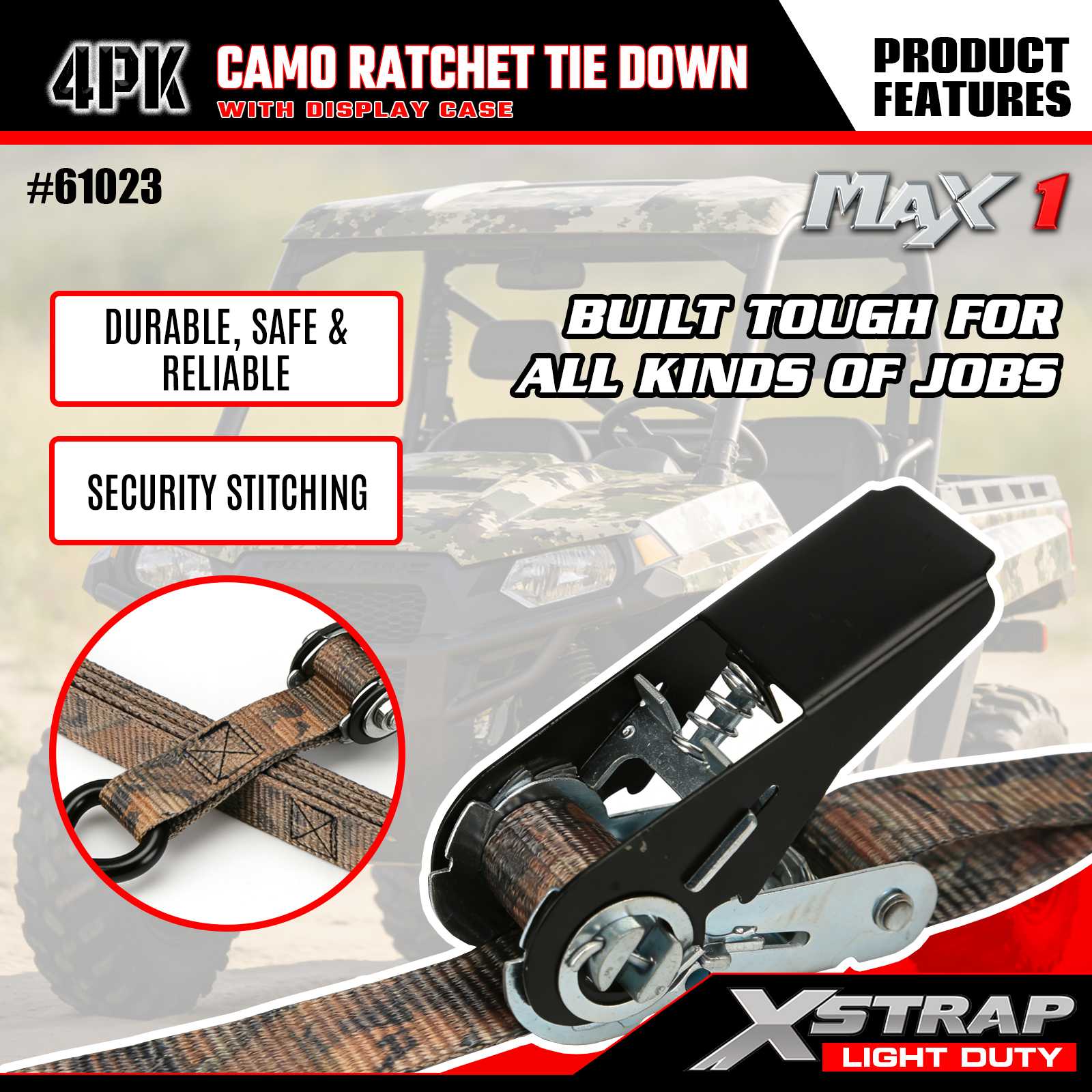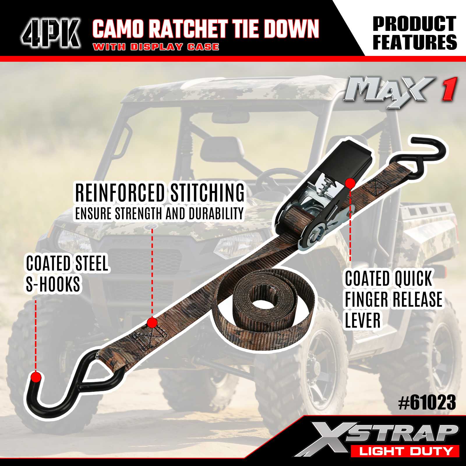 Xstrap 4PK CAMO Ratchet ligamen Stramenta est 1 in x 10 ft, onus operis tutus 300lbs est et vires fractae 900lbs sunt.
