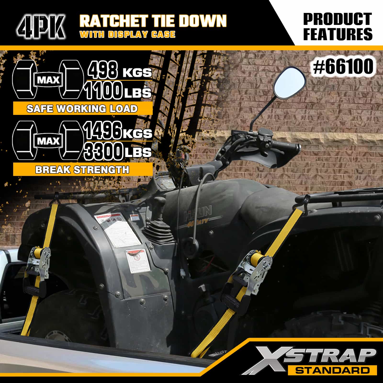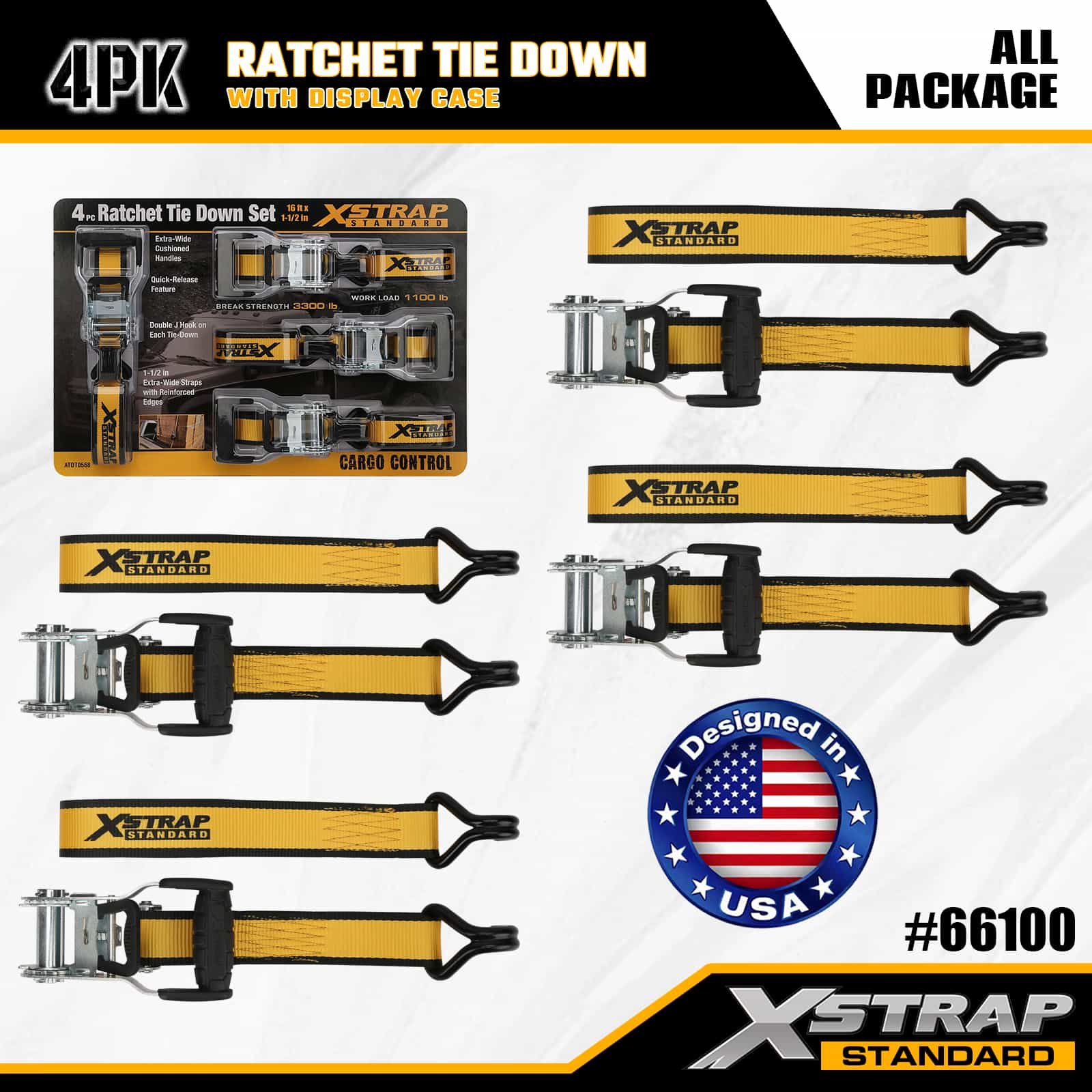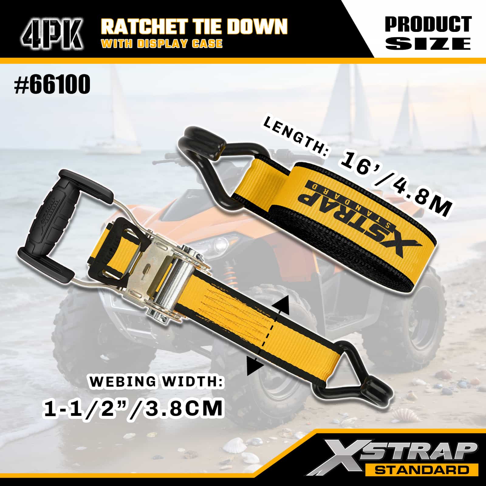 Xstrap 4 Pack Ratchet Tie Down with Double J Hooks, 1-1/2" x 16' Polyester ligare Strap Pull Ratchet Strap, 1100lbs Capacitas Cargo Lashing Securing Straps with Double J Hooks for Pickup Truck, SUV, Car Top Racks Motorcycle, Light Fishing Boat, Jet Ski, Snowmobile, Lawn Tractor.