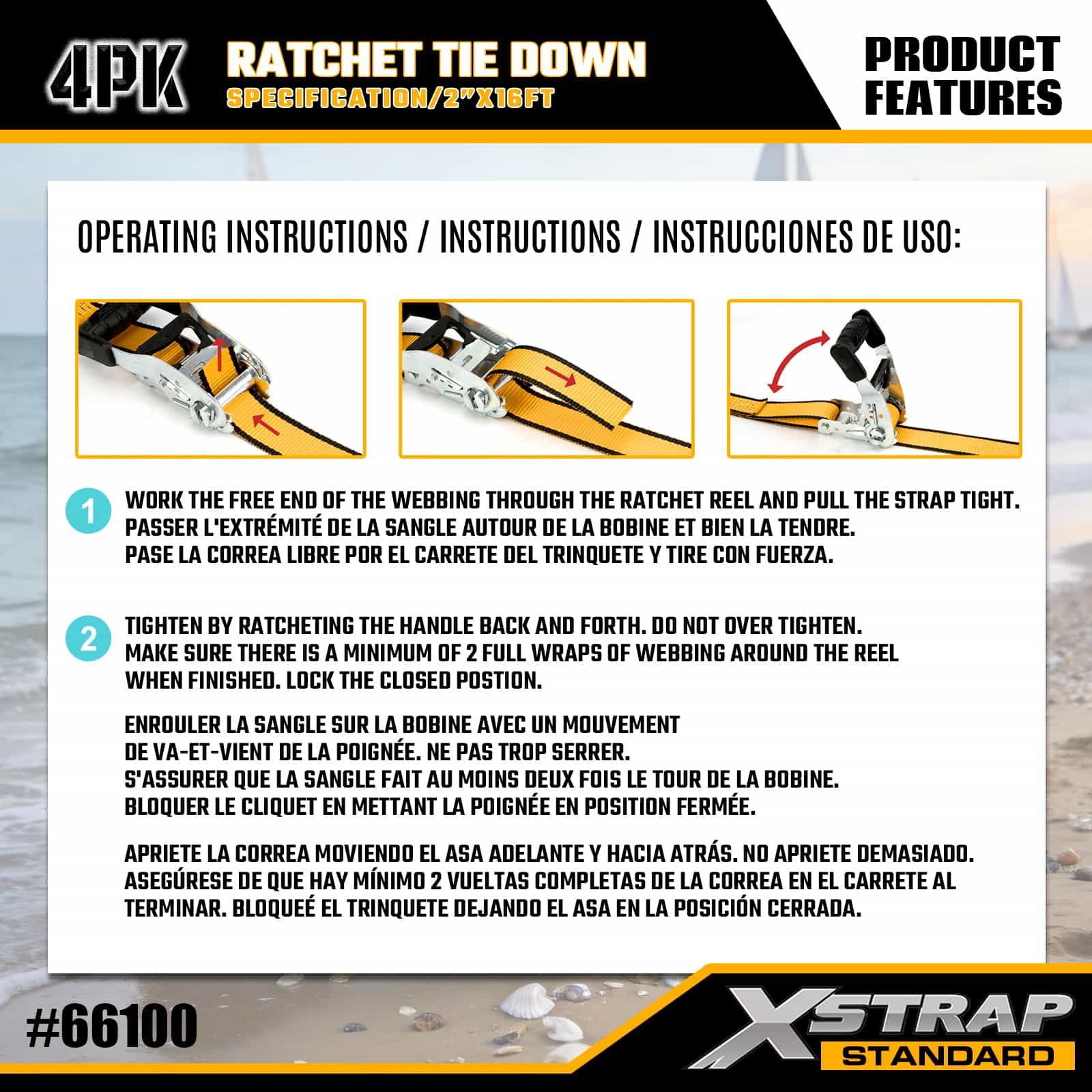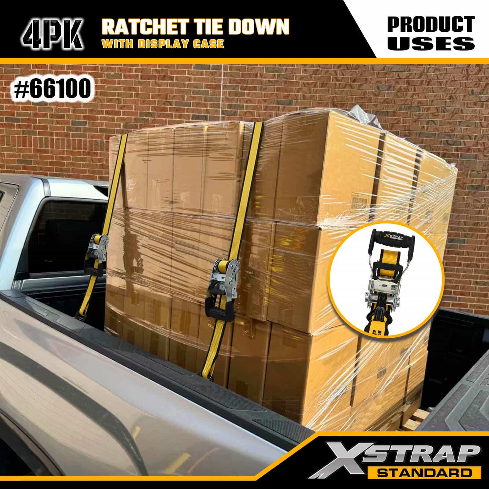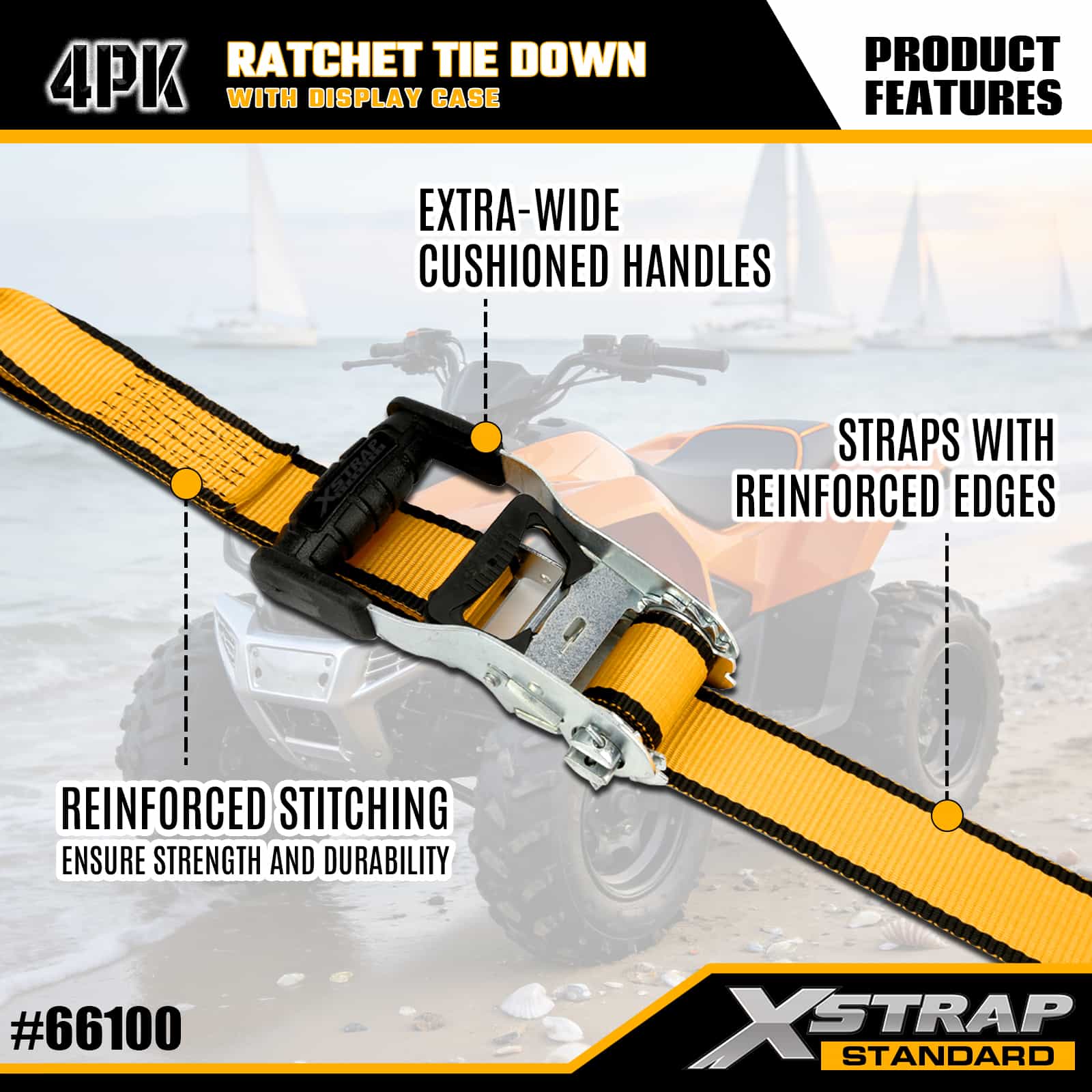Xstrap 4 Pack Ratchet Tie Down with Double J Hooks, 1-1/2" x 16' Polyester ligare Strap Pull Ratchet Strap, 1100lbs Capacitas Cargo Lashing Securing Straps with Double J Hooks for Pickup Truck, SUV, Car Top Racks Motorcycle, Light Fishing Boat, Jet Ski, Snowmobile, Lawn Tractor.