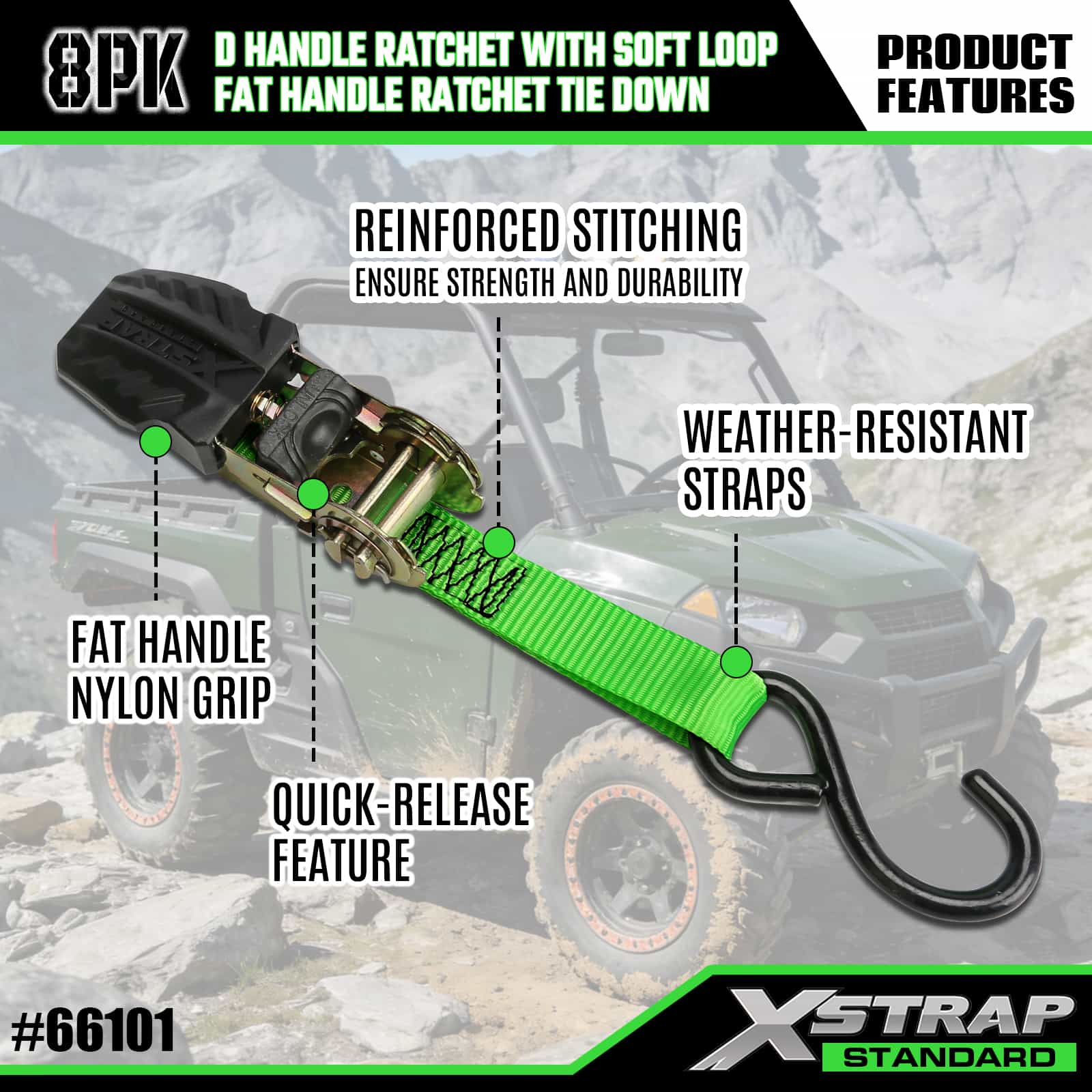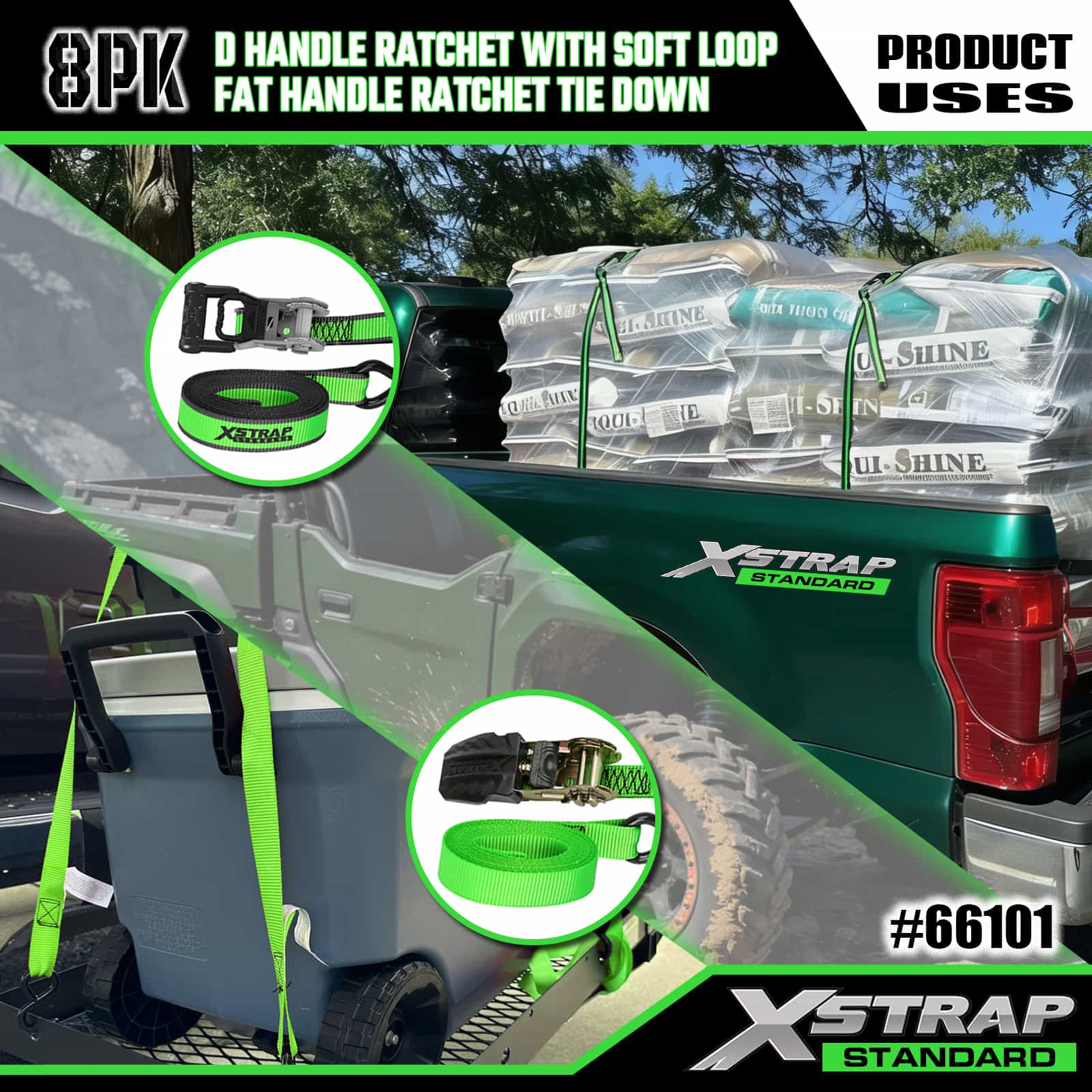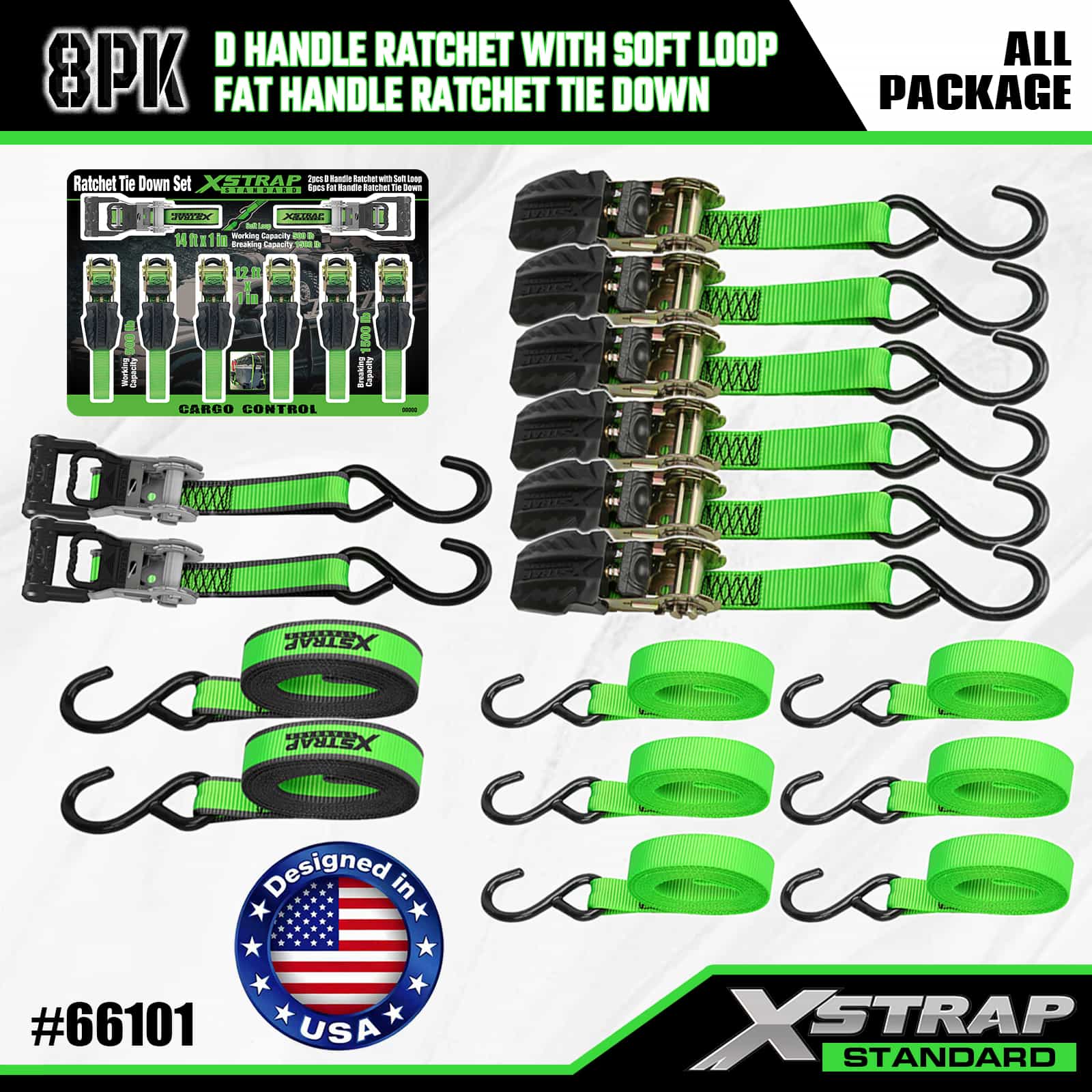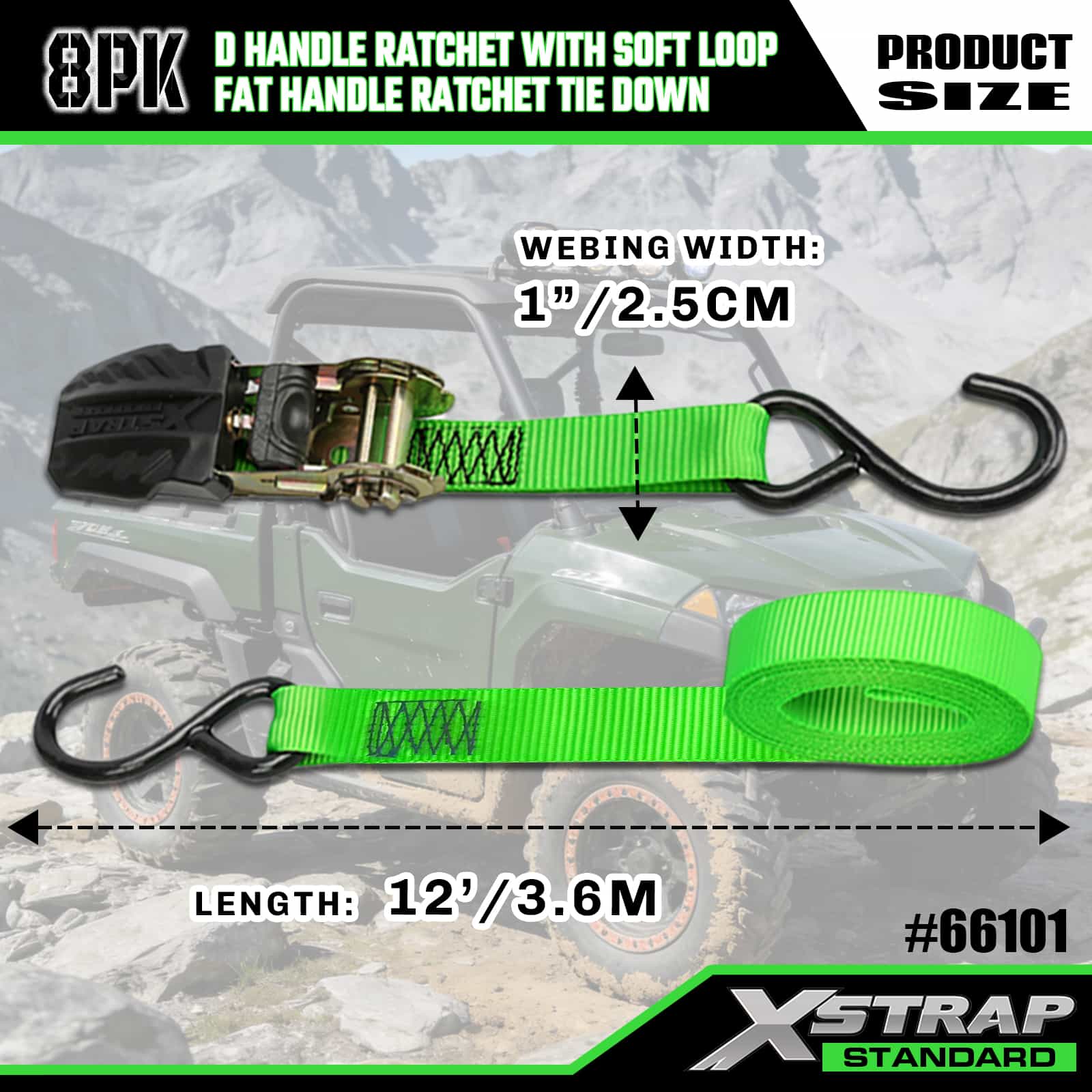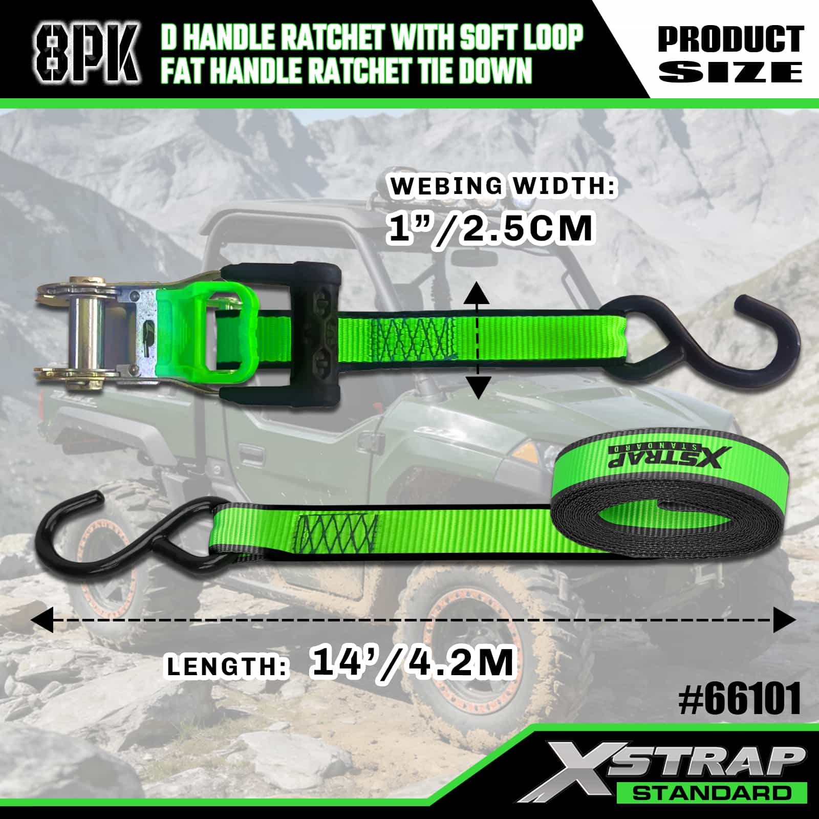 Xstrap 8 Pack Aluminium Ratchet obstringe, 1” x 14’ et 1” x 12’ Polyester ligamen Strap excute Ratchet Strap, 500lbs Capacitas Cargo Lashing Securus Astra cum falcibus pro Cargo dicionis Truck, SUV, Car Top Racks Motorcycle,.