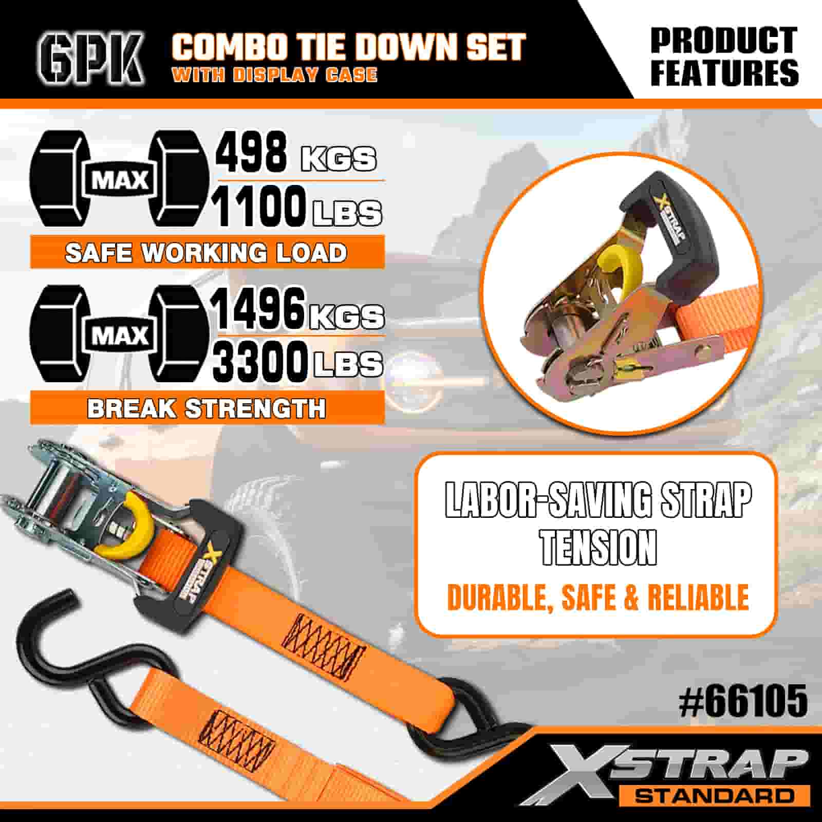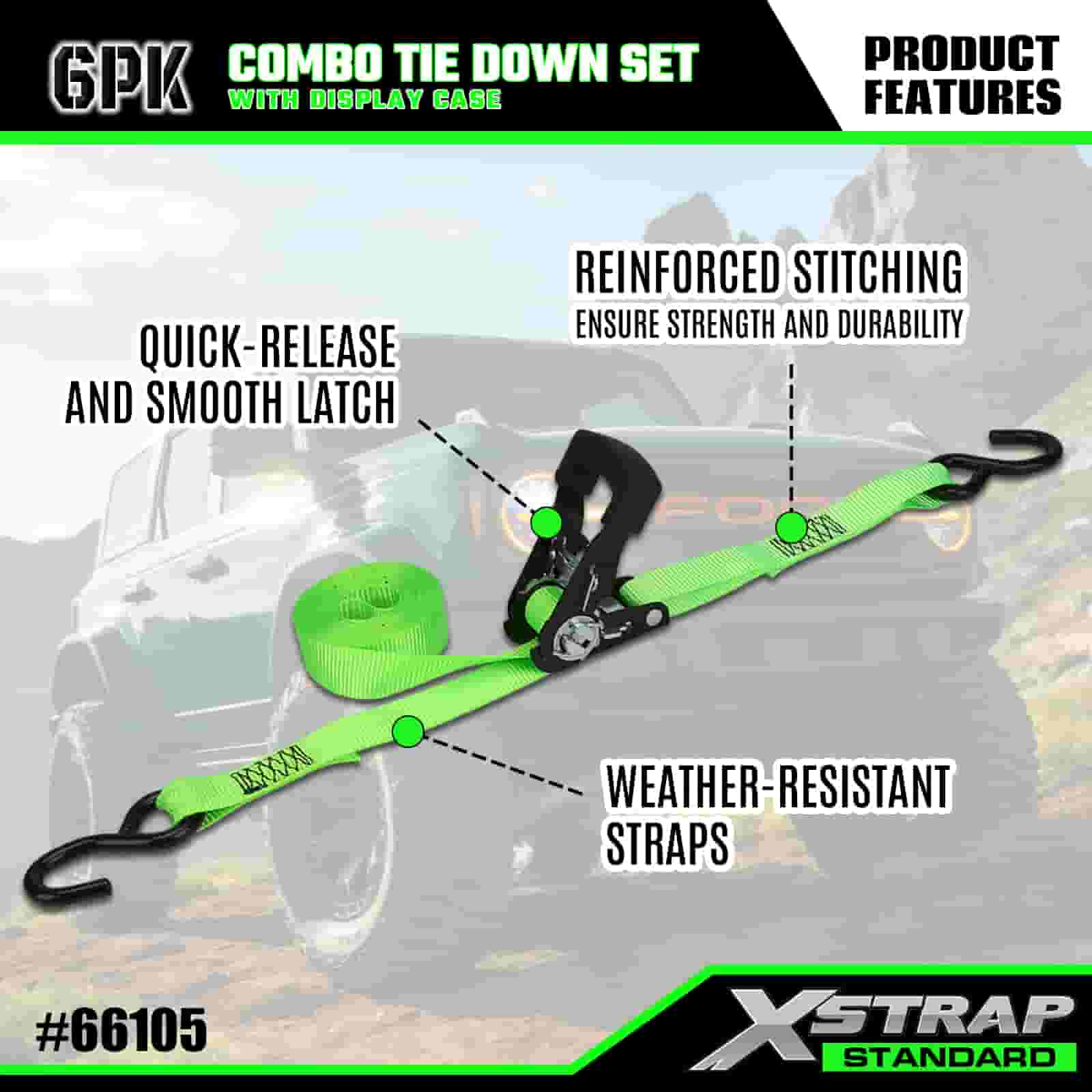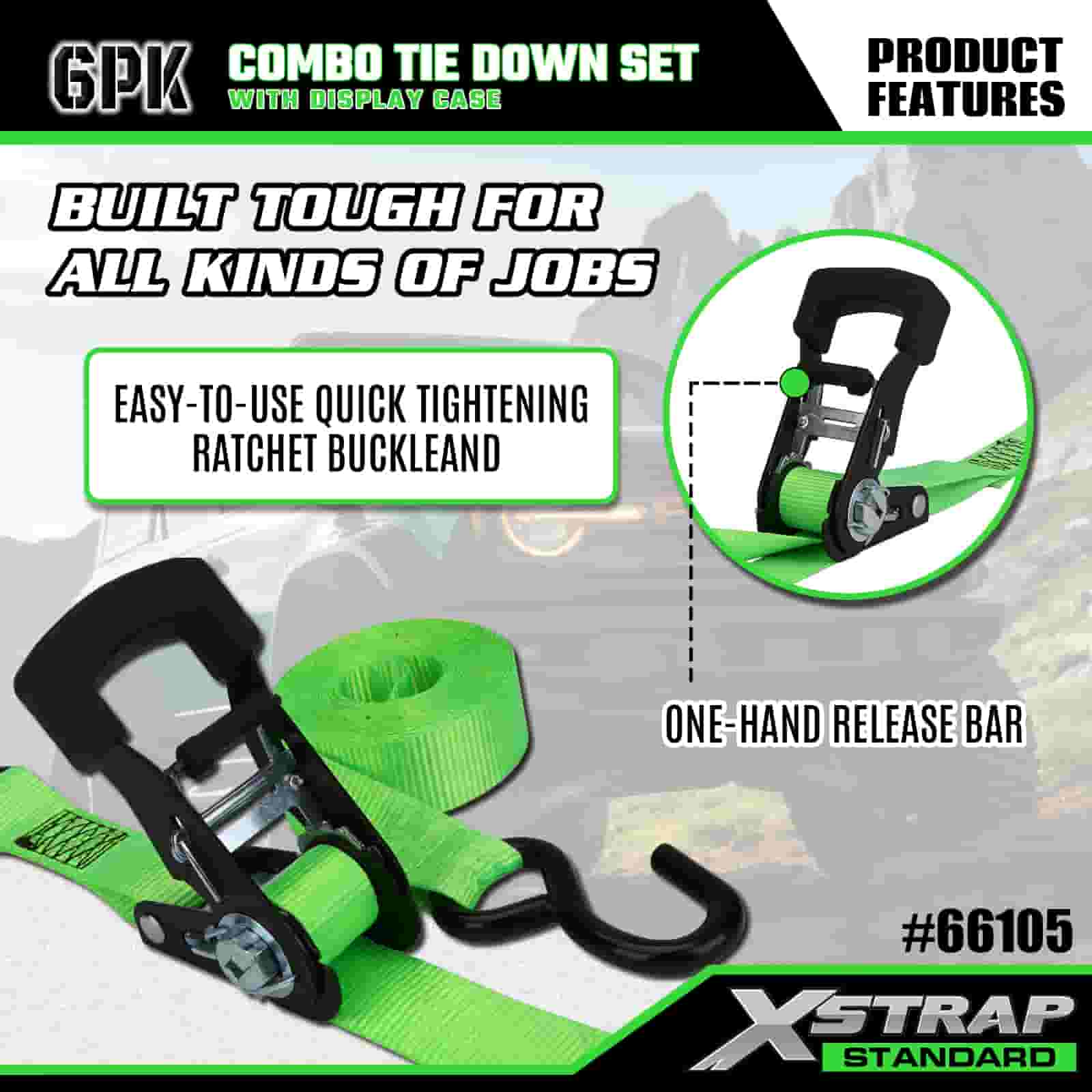 Xstrap 6 Packa Aluminium Ratchet obstringe, 1” x 14’ et 1” x 10 Polyester stringe Strap trahe Ratchet Strap, 500lbs et 1100lbs Capacitas Cargo Lashing Securae Astra cum Hookibus pro Cargo control Truck, SUV, Car Top Racks Motorcycle Dlbum et capacitas Cargo lashing Securae Astra cum Hookibus pro mercibus Principatus Truck, SUV, Car Top Racks Motorcycle Autocinetum.