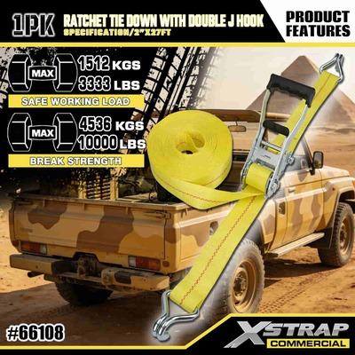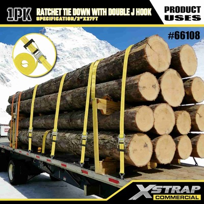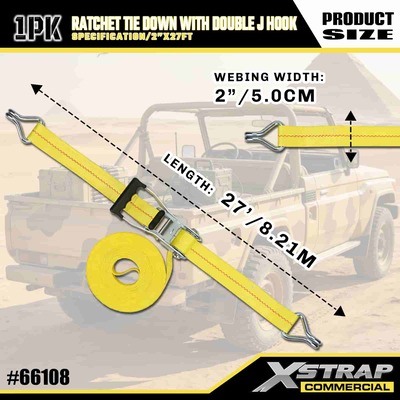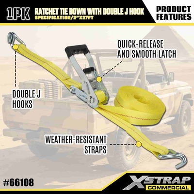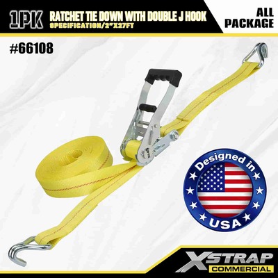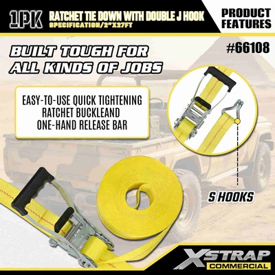 Xstrap Ratchet deprime cum Duplex J Hooks, 2" x 27' Polyester ligamen Strap Excute Ratchet Strap, 3333lbs Capacitas Cargo Lashing Securus Stragula cum Duplex J Hooks pro Cargo dicionis Truck, SUV, Car Top Racks Motorcycle,.