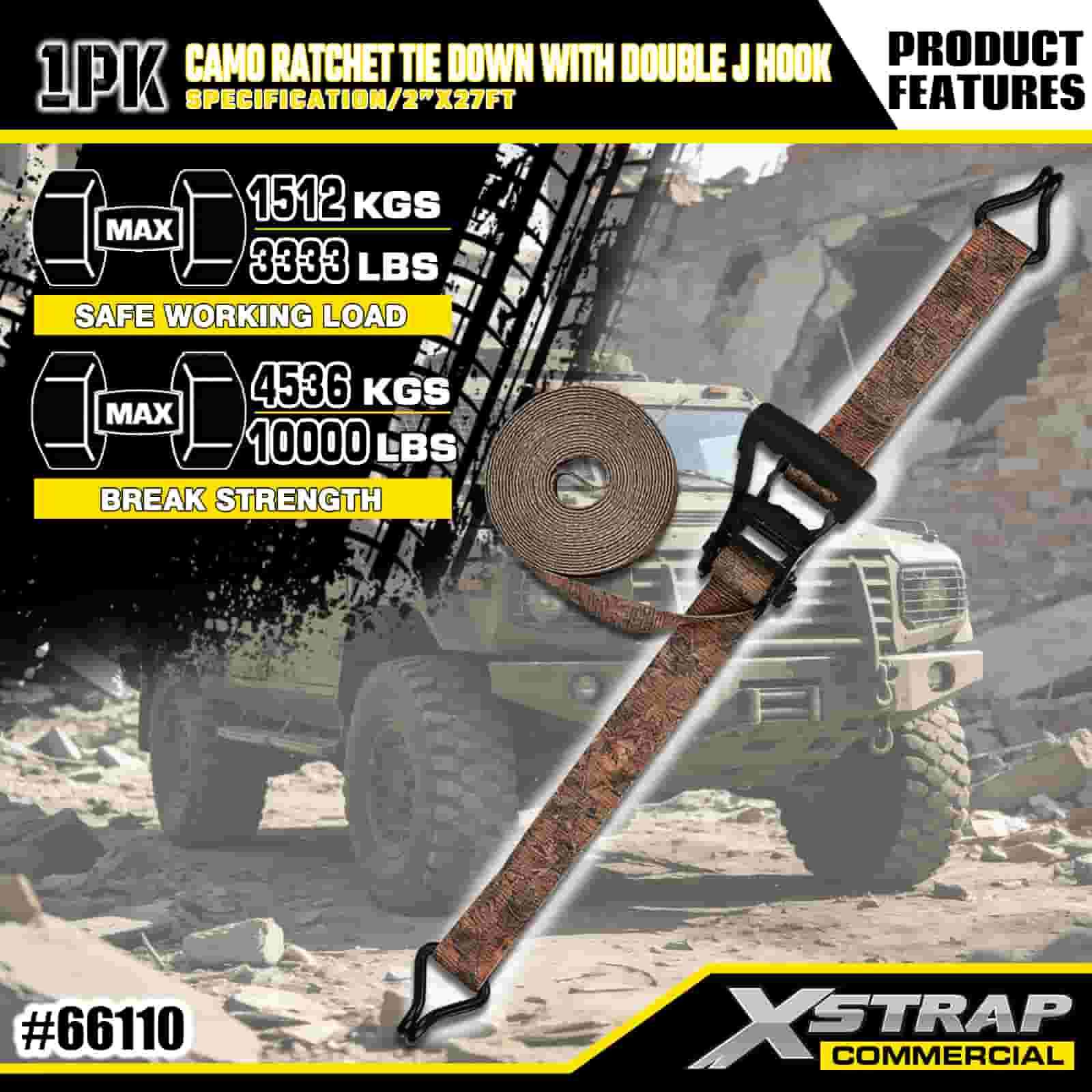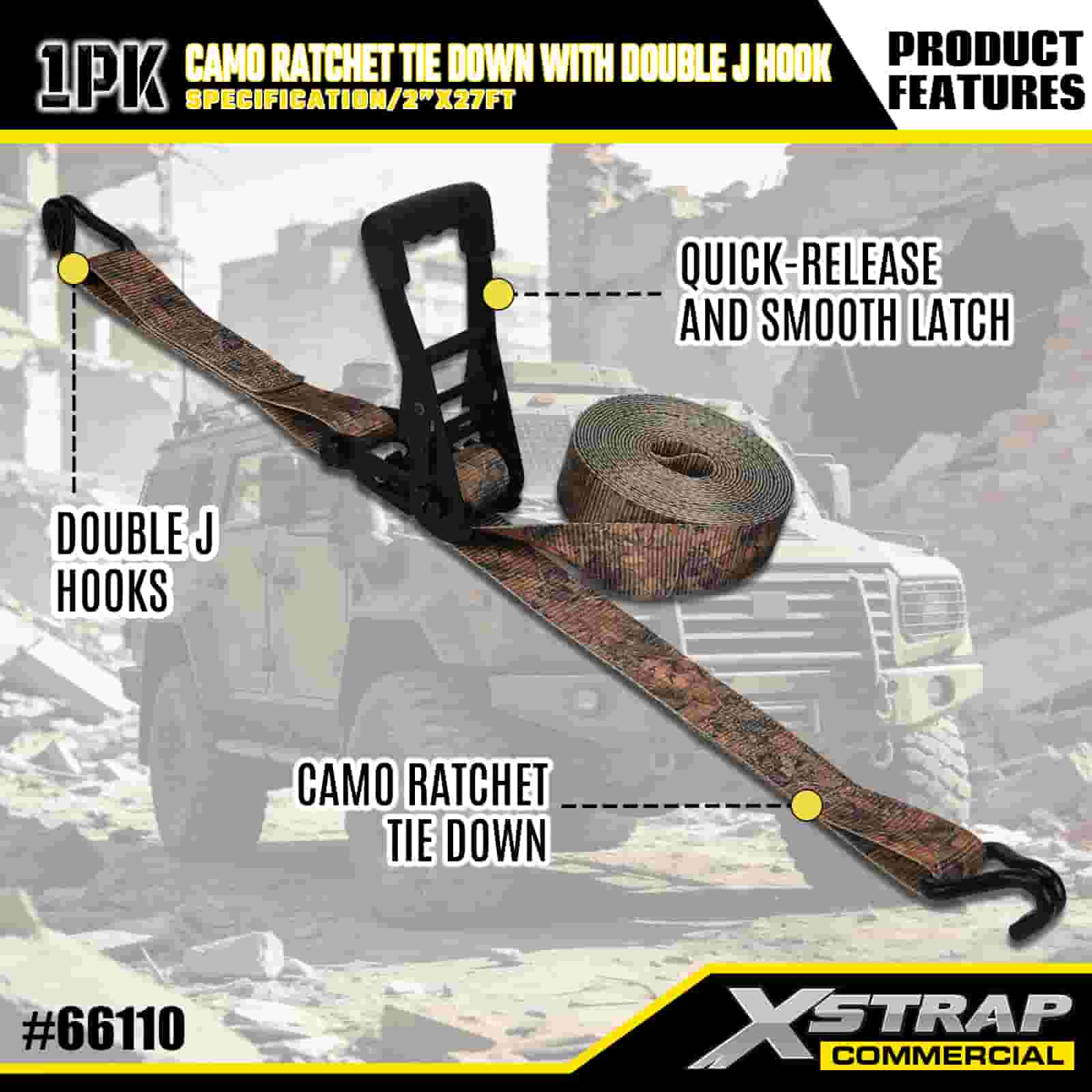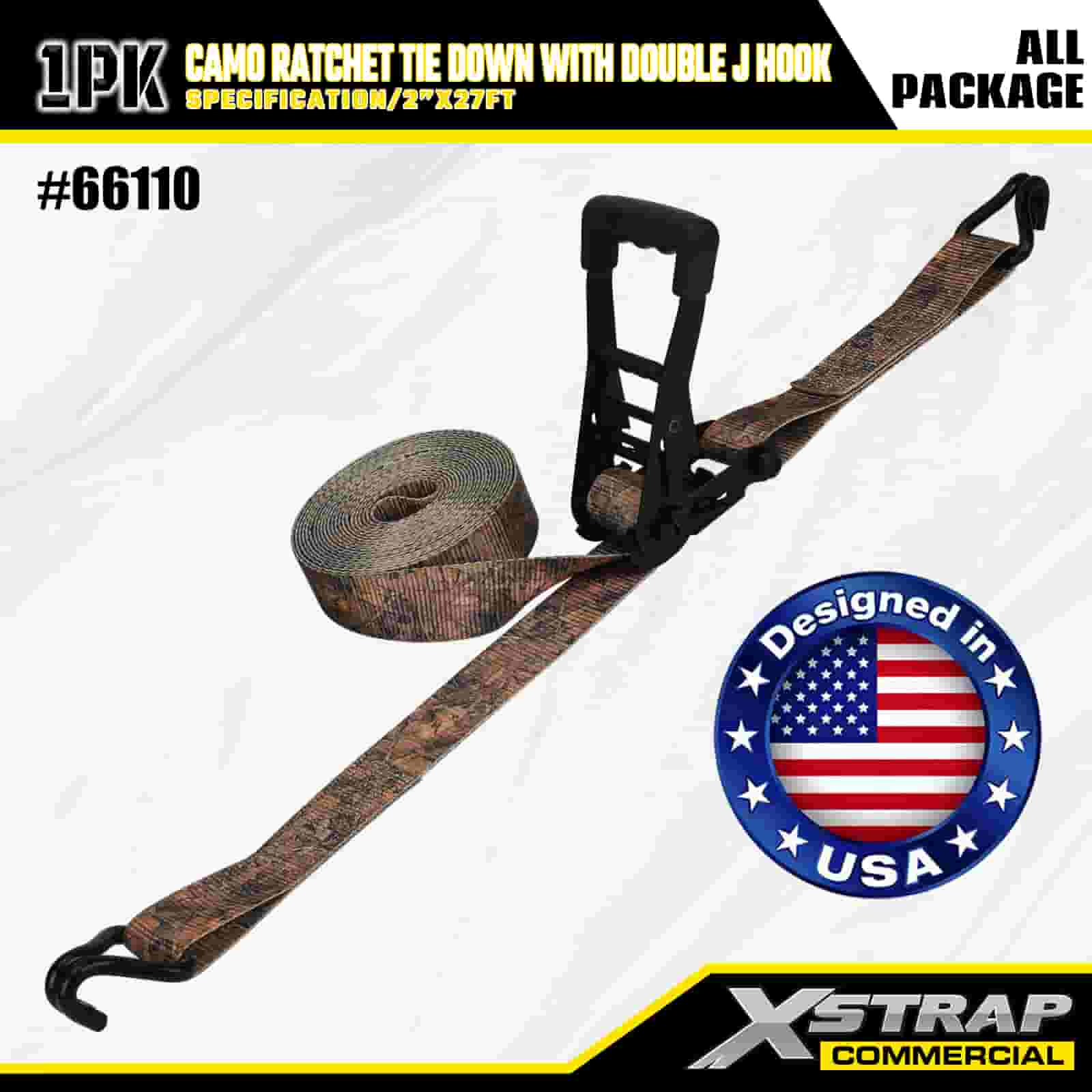 Xstrap CAMO Ratchet nexum cum Duplex J Hooks, 2" x 27' Polyester deprime Strap Excute Ratchet Strap, 3333lbs Capacitas Cargo Lashing Securus Abras cum Duplici J Hooke pro Cargo dicionis Truck, SUV, Car Top Racks Motorcycle,.