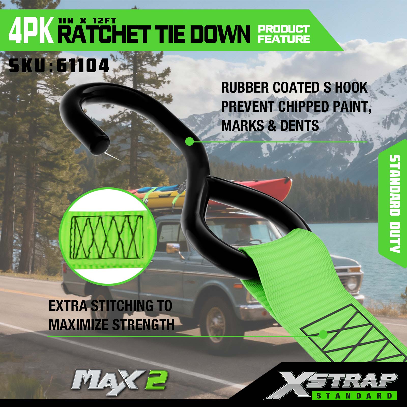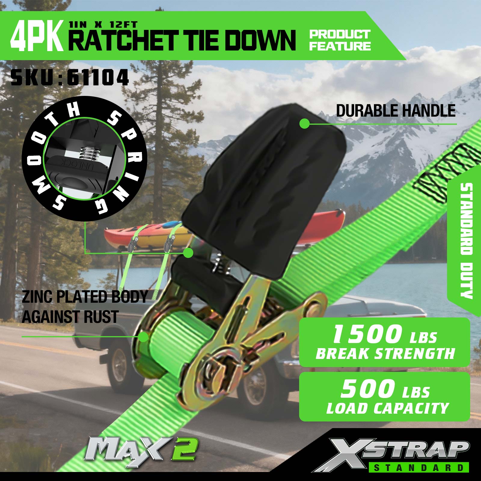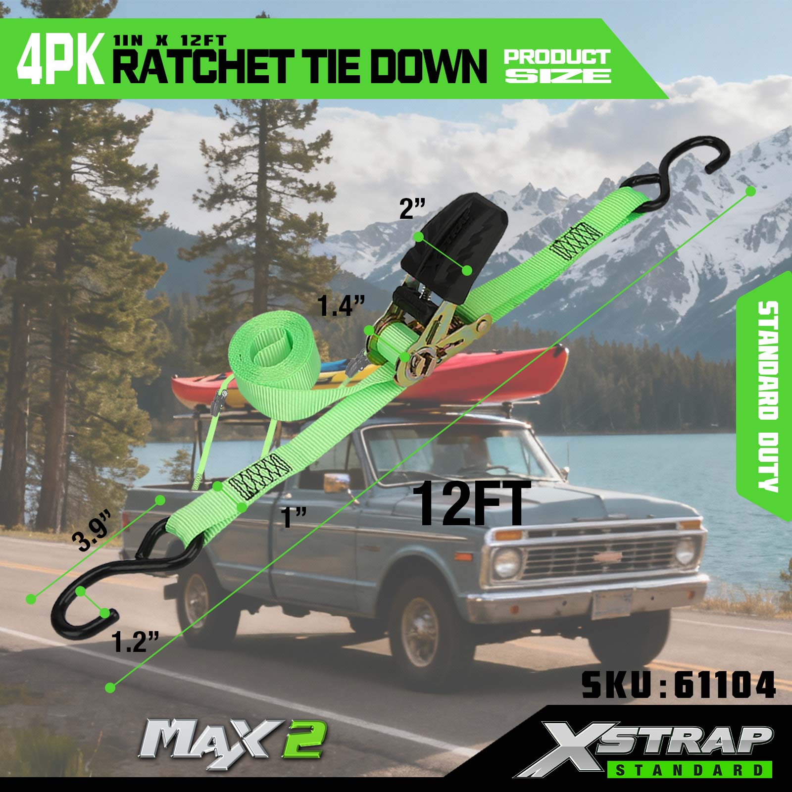 Xstrap 4 Sarcina Ratchet obstringe, 1” x 12' Polyester ligamen Strap Trahendum Ratchet Strap, 500lbs Capacitas Cargo Lashing Securae Stragula cum Uncis pro RAPINA Truck, Lucis Officii Trailer motorcycle, Cymba levis, Jet Ski, Snowmobile.