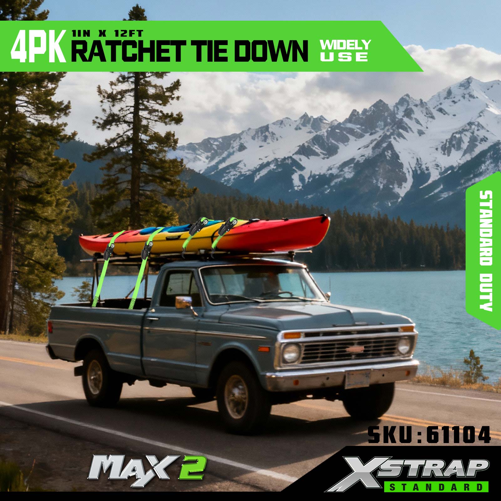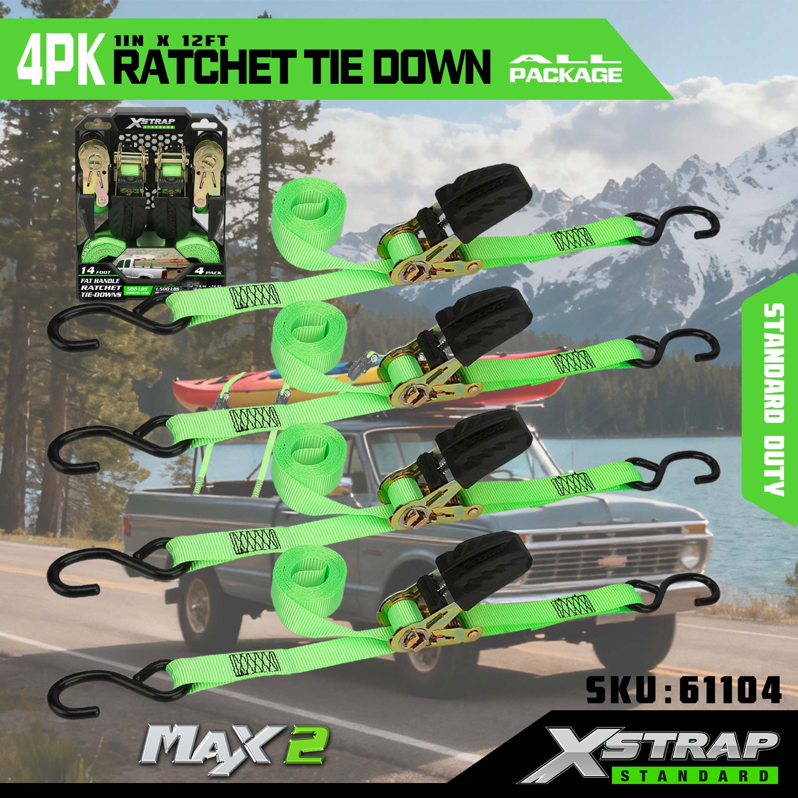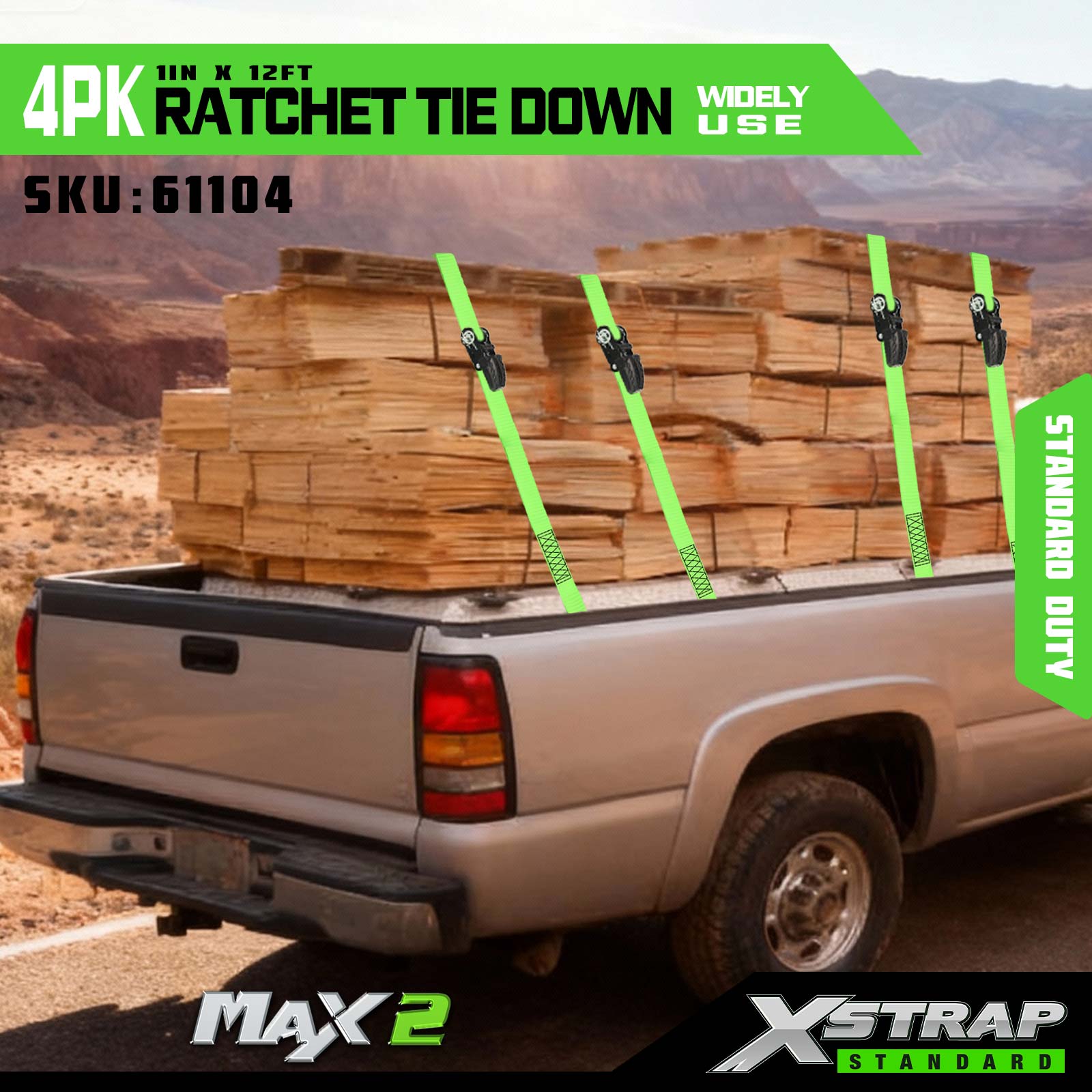 Xstrap 4 Sarcina Ratchet obstringe, 1” x 12' Polyester ligamen Strap Trahendum Ratchet Strap, 500lbs Capacitas Cargo Lashing Securae Stragula cum Uncis pro RAPINA Truck, Lucis Officii Trailer motorcycle, Cymba levis, Jet Ski, Snowmobile.