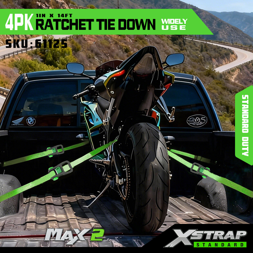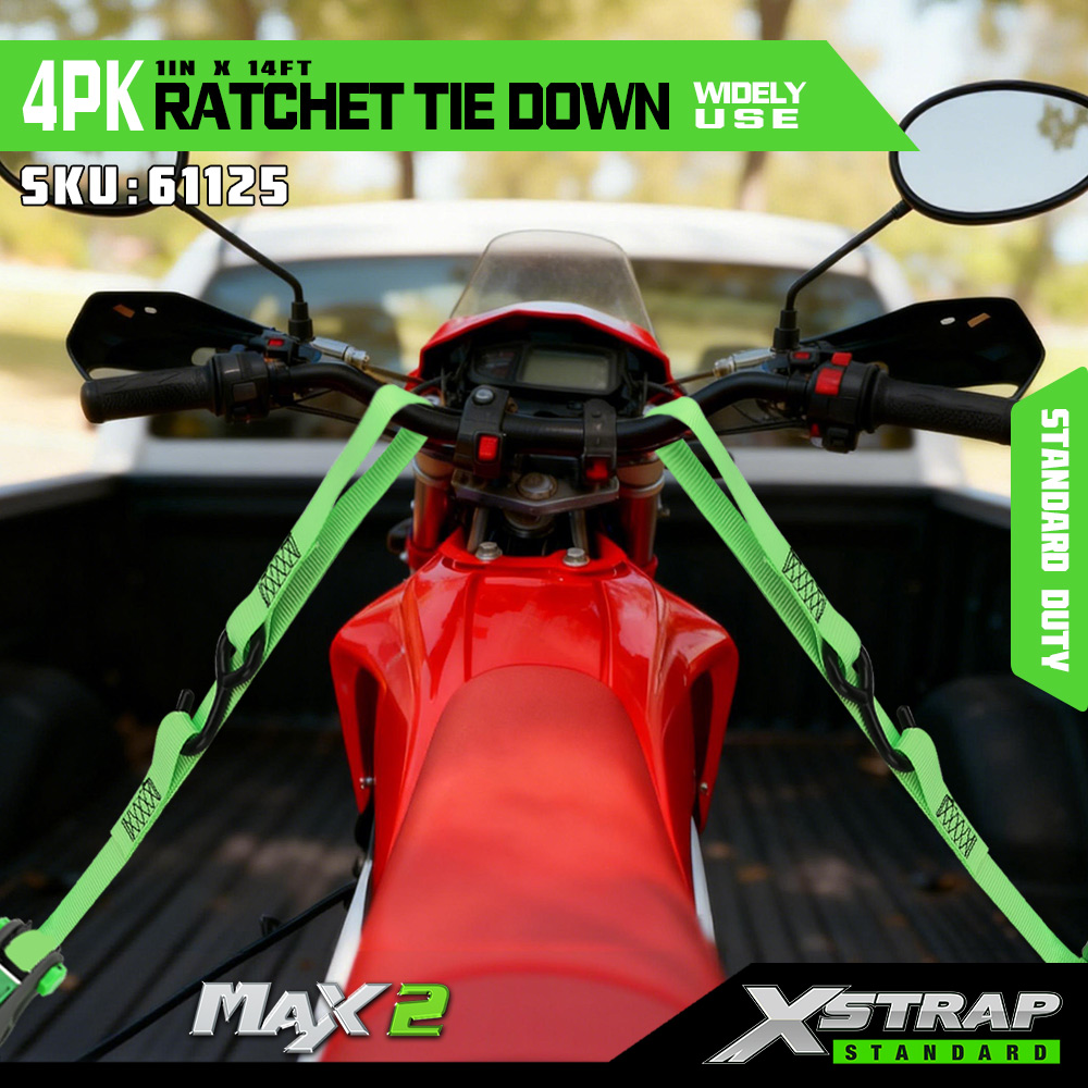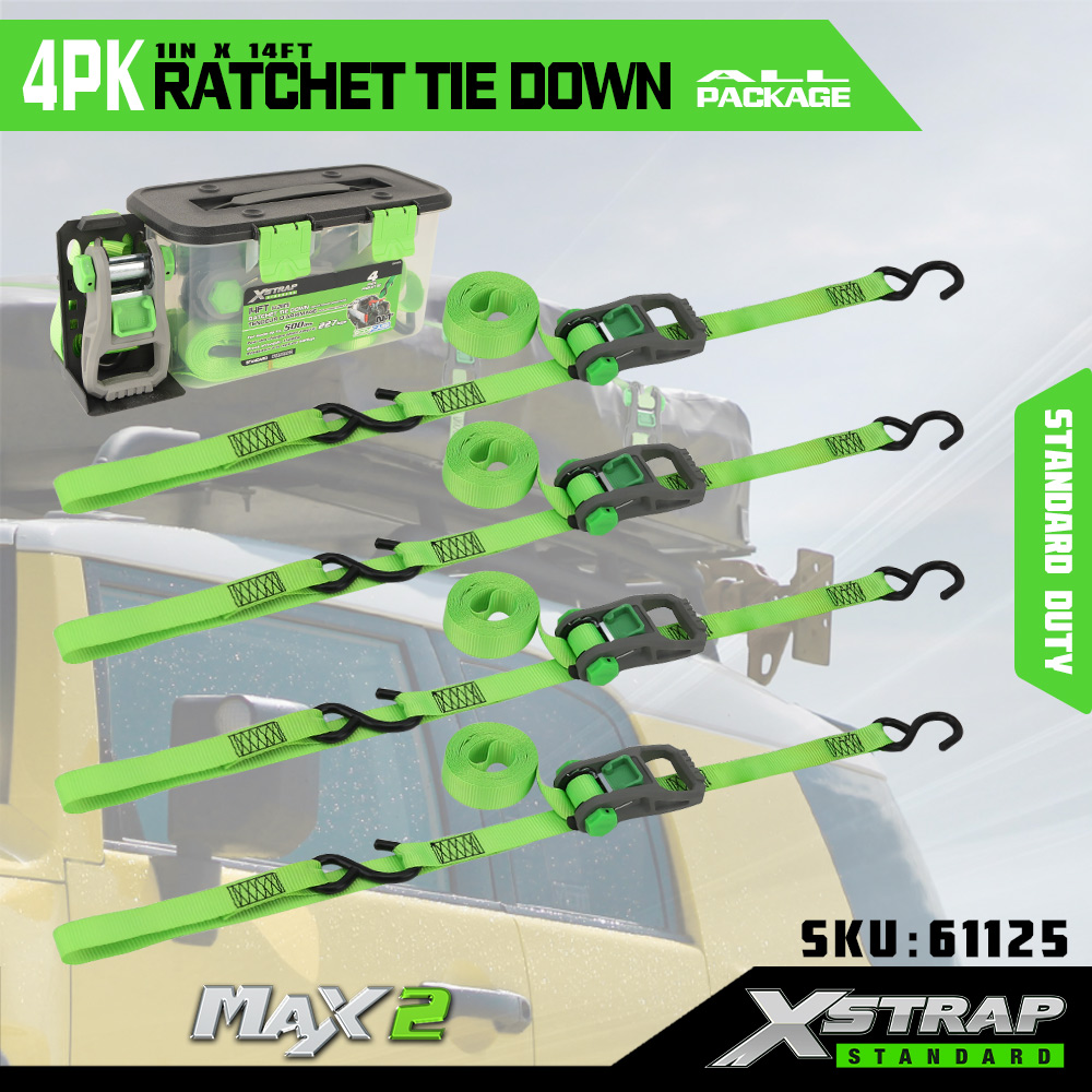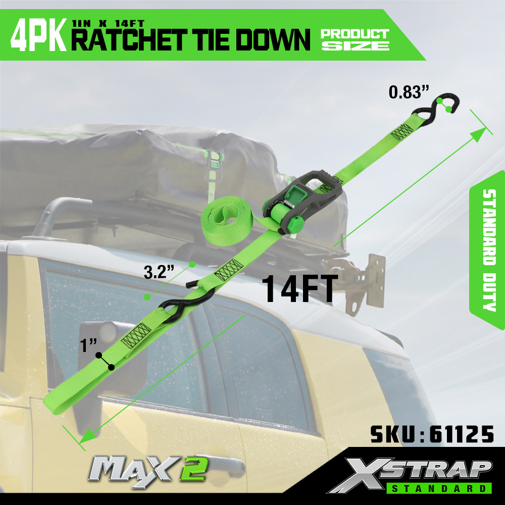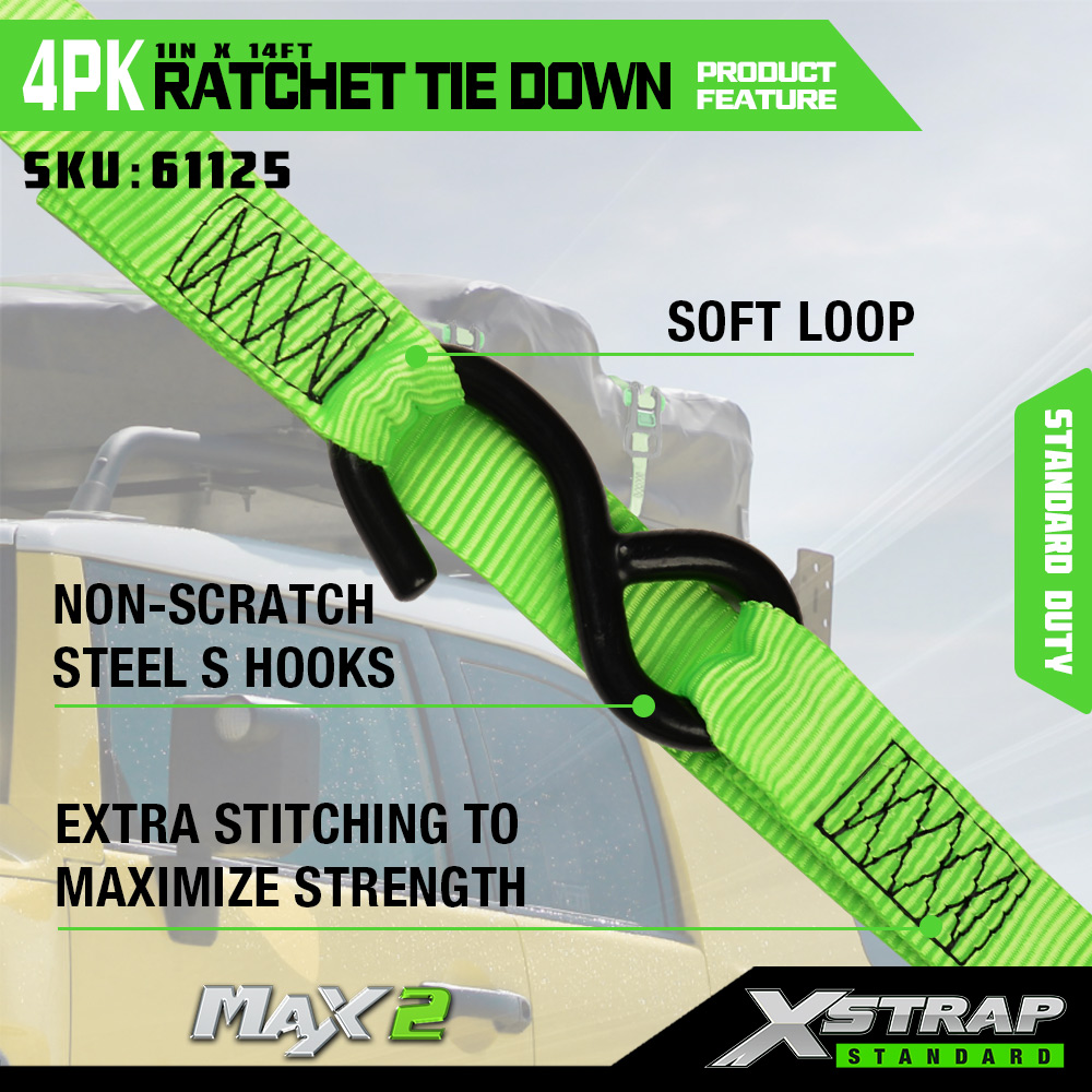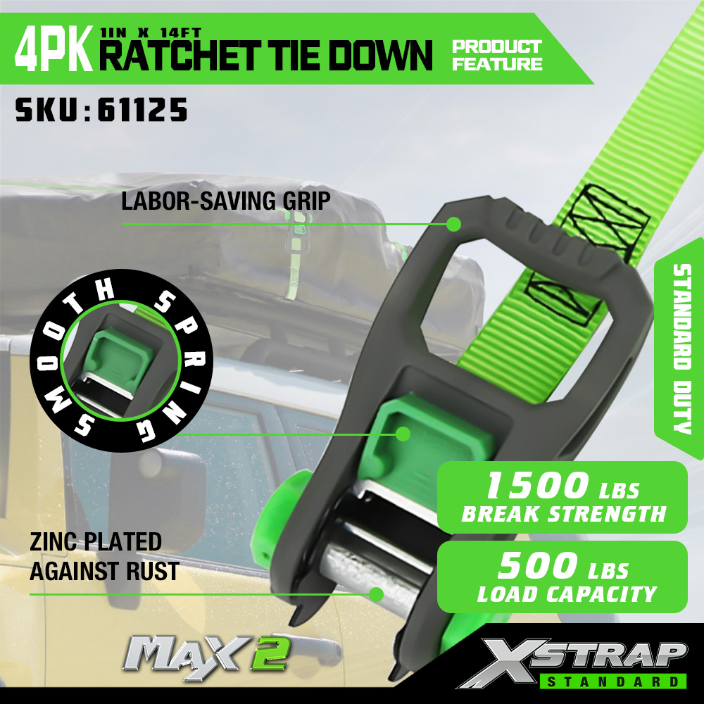Xstrap 4 Pace Ratchet obstringe, 1” x 14' Polyester ligamen lorum mollibus fasciolis excute Ratchet Strap, 500lbs Capacitas Cargo Lashing Secura vincula cum falcibus pro RAPINA Truck, SUV, Car Top Racks Motorcycle, Navicula levis, Jet Ski, Snowmobile, Tondere Tractor.