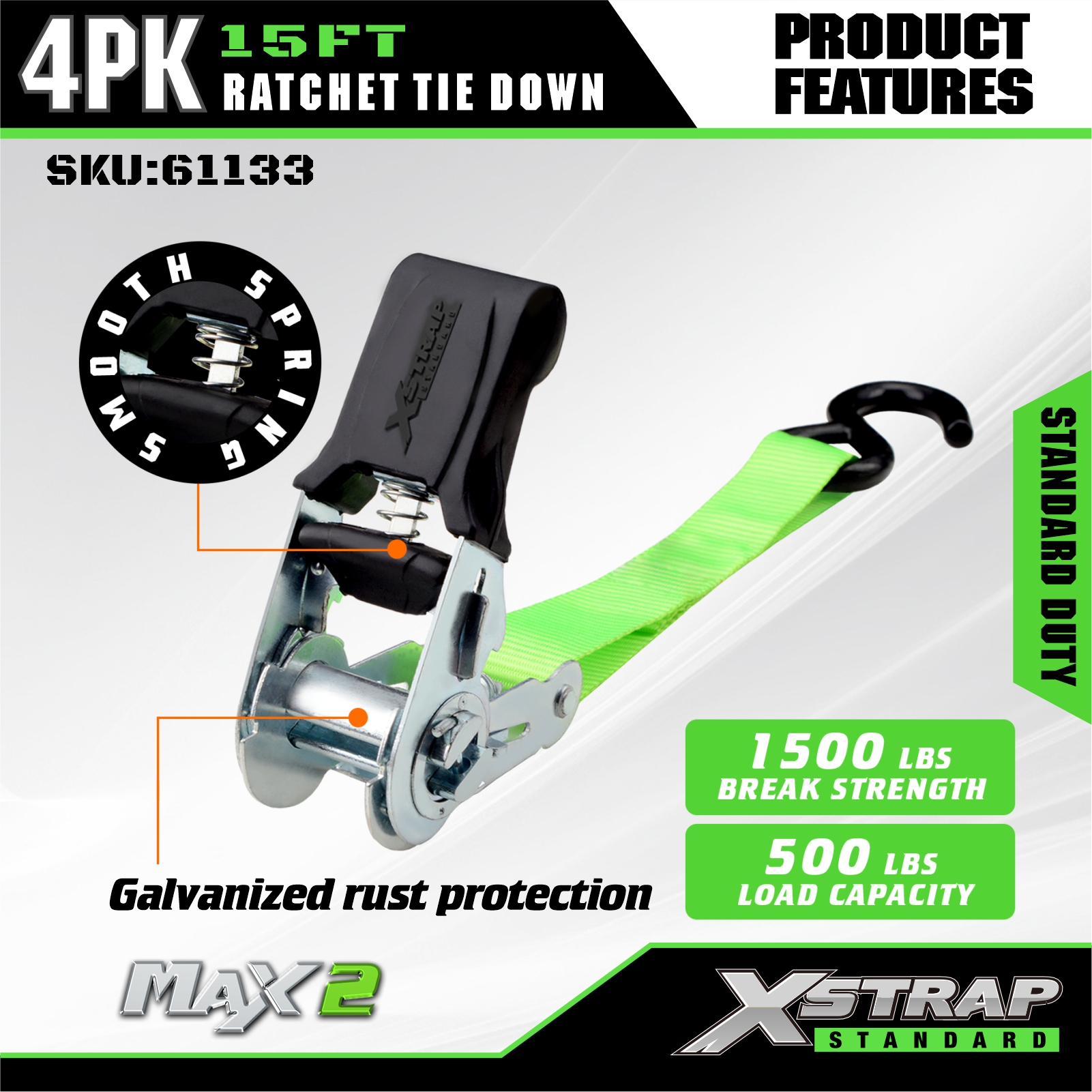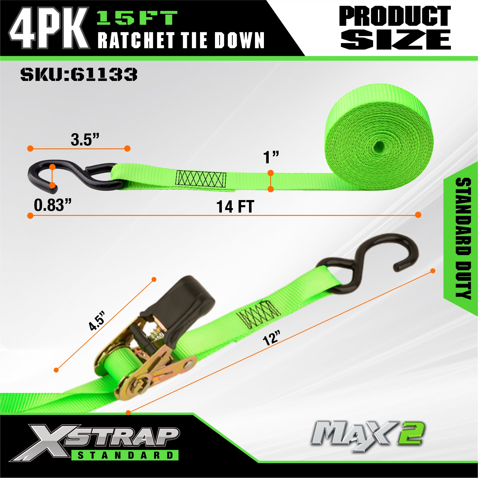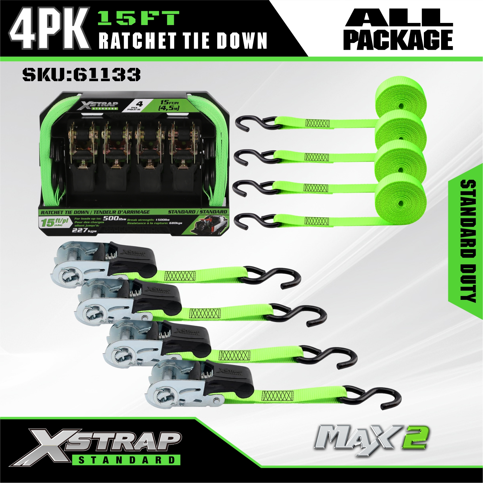 Xstrap 4 Sarcinam Ratchet obstringe, 1” x 15' Polyester ligamen Strap Trahendum Ratchet Strap, 500lbs Capacitas Cargo Lashing Securus Stragula cum falcibus pro RAPINA Truck, SUV, Car Top Racks Motorcycle, Navicula Piscationis levis, Jet Ski, Snowmobile, Tondere Tractor.