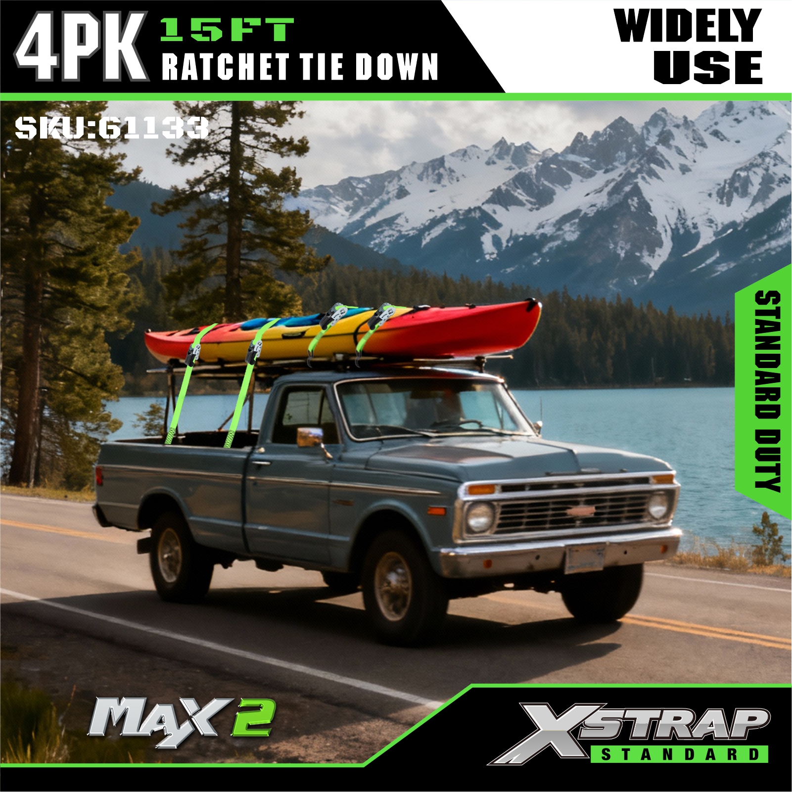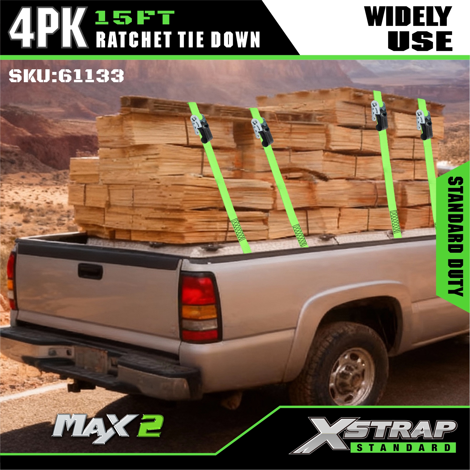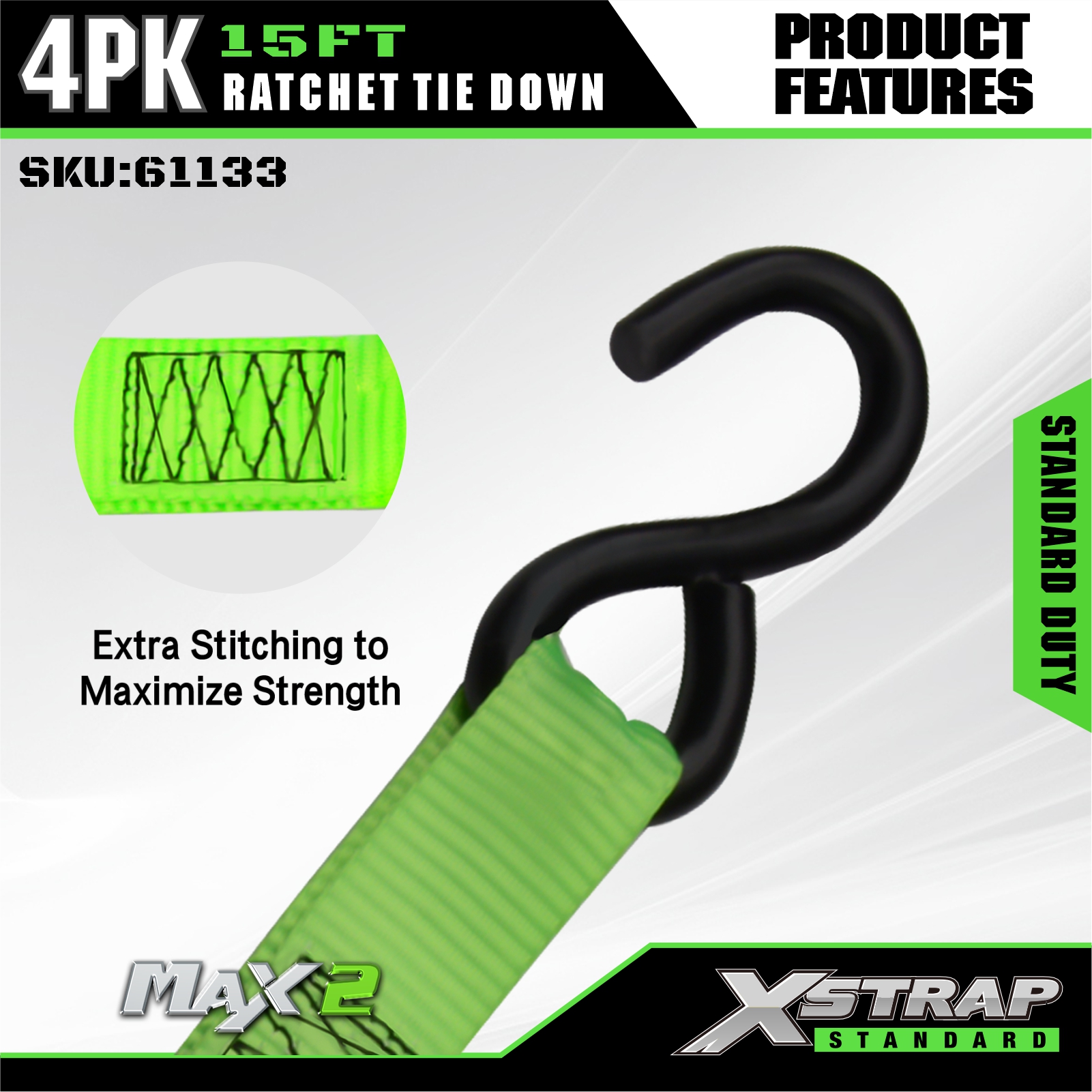 Xstrap 4 Sarcinam Ratchet obstringe, 1” x 15' Polyester ligamen Strap Trahendum Ratchet Strap, 500lbs Capacitas Cargo Lashing Securus Stragula cum falcibus pro RAPINA Truck, SUV, Car Top Racks Motorcycle, Navicula Piscationis levis, Jet Ski, Snowmobile, Tondere Tractor.