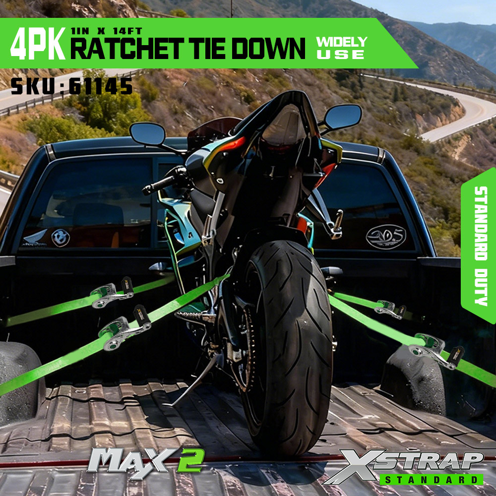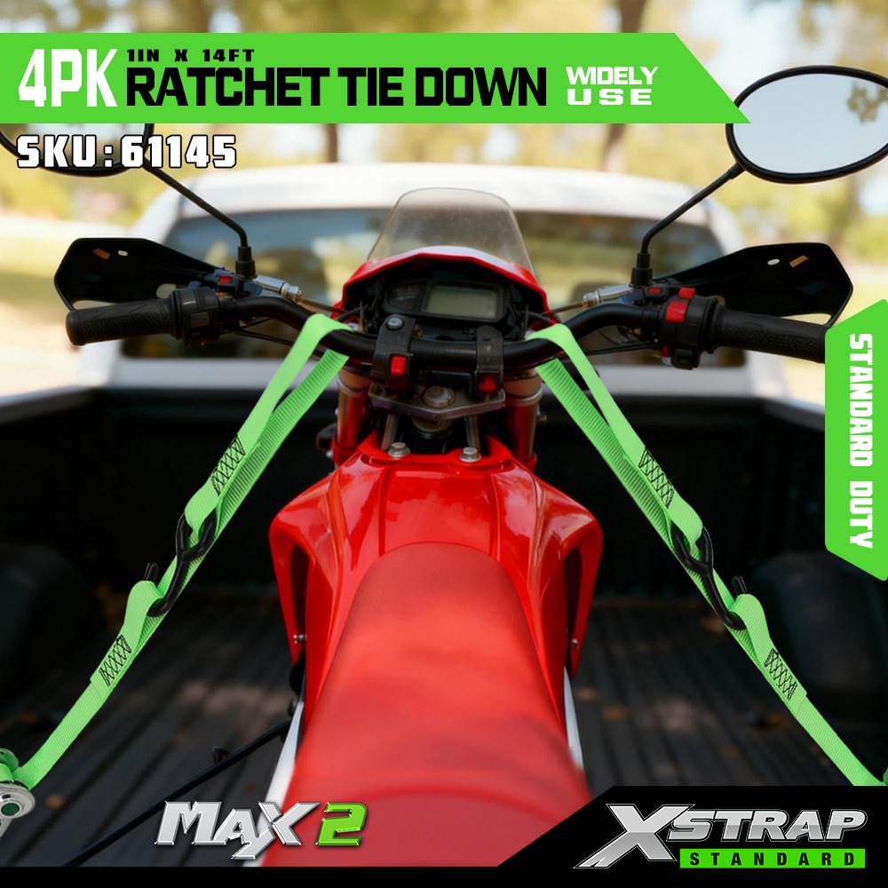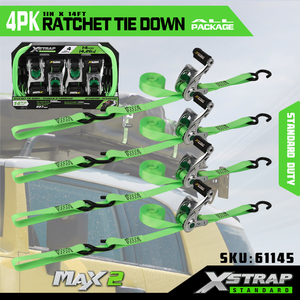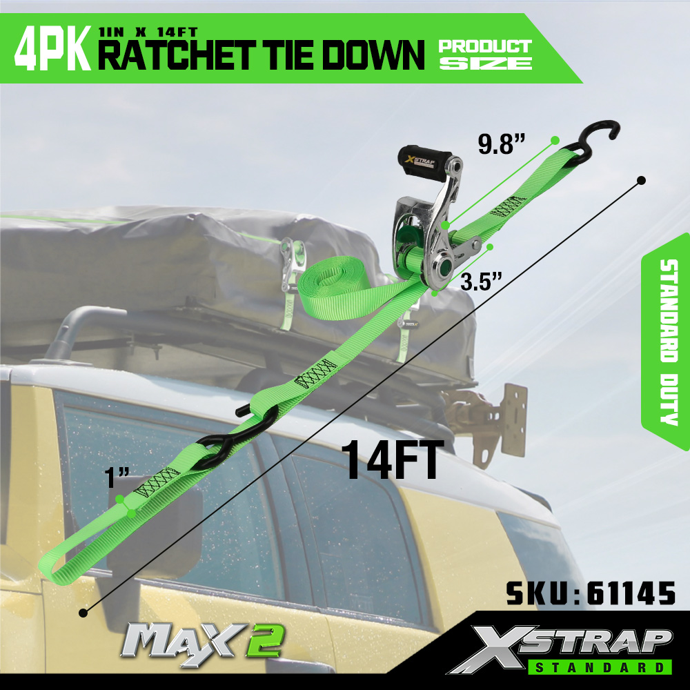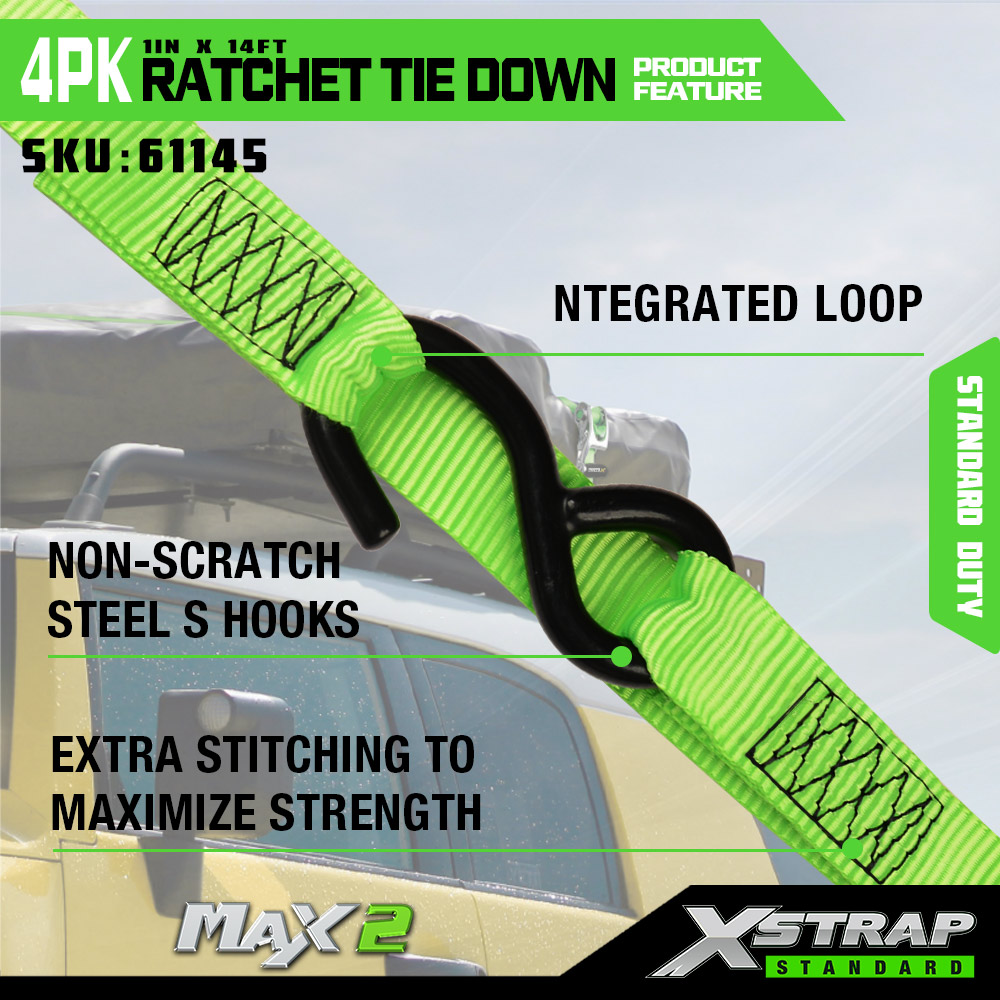 Xstrap 4 Pack Ratchet ligare cum Soft Loop, 1" x 14' Polyester ligare Strap Pull Ratchet Strap, 1000lbs Capacitas Cargo Lashing Securing Straps with S Hooks for Truck, SUV, Car Top Racks Motorcycle.